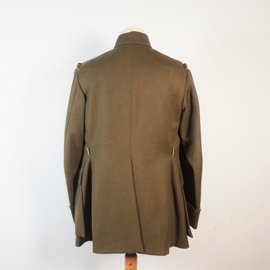 UNIFORME DE SERGENT-CHEF DU 41ème REGIMENT D'ARTILLERIE comprenant VAREUSE A COL AIGLON, en drap kaki ouvrant à 7 boutons à l'empreinte de l'arme en bronze doré et à quatre poches dont celles du bas à soufflets, pattes de col en drap garance à soutaches noires et chiffres brodés en cannetille or, galons dans le bas des manches, INSIGNE DE SPECIALITE DE MARECHAL-FERRANT en cannetille or sur la manche, doublure intérieure en satinette kaki et CULOTTE DE CHEVAL en drap kaki, années 1930, TBE.