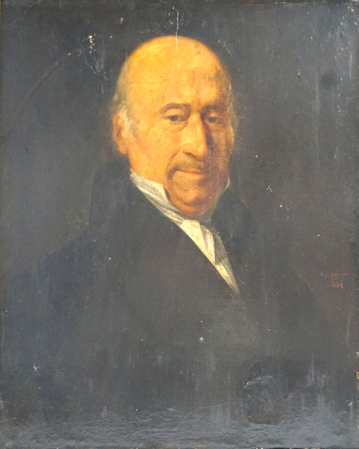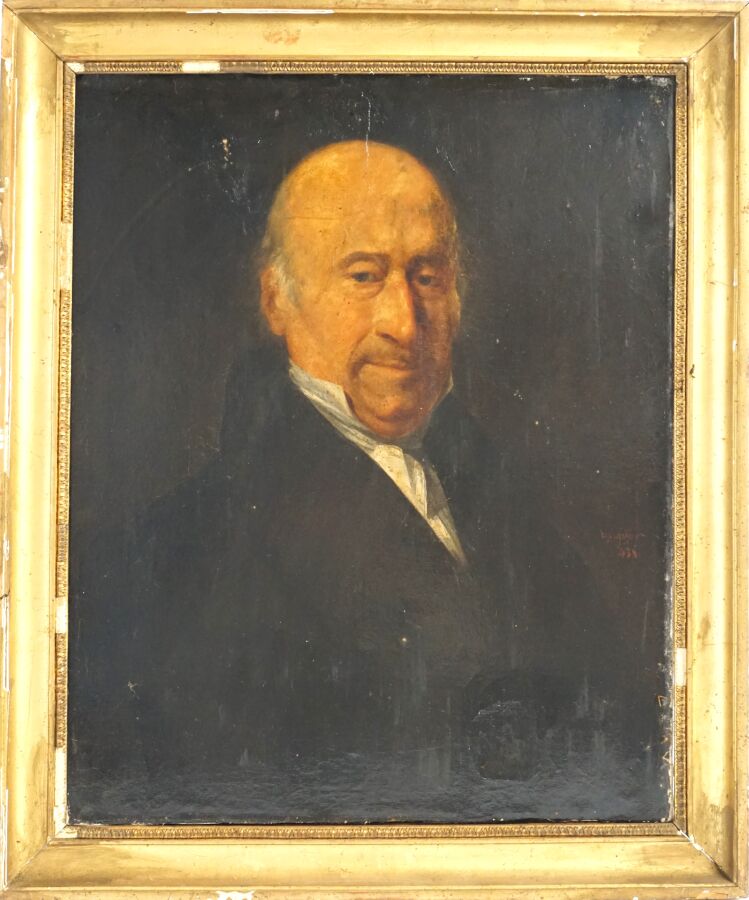 V. VIGUIER (XIXe), "Portrait d'homme" 1838, huile sur toile, signée et datée à droite au centre, 59.5 x 46 cm (usures, traces, craquelures).