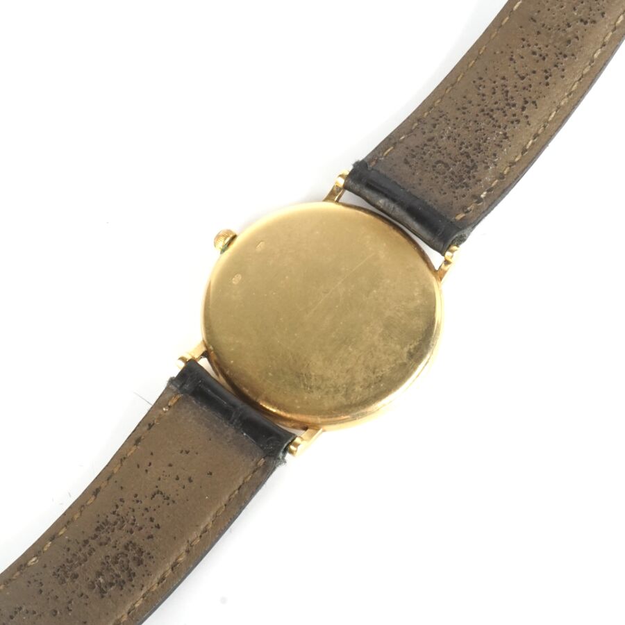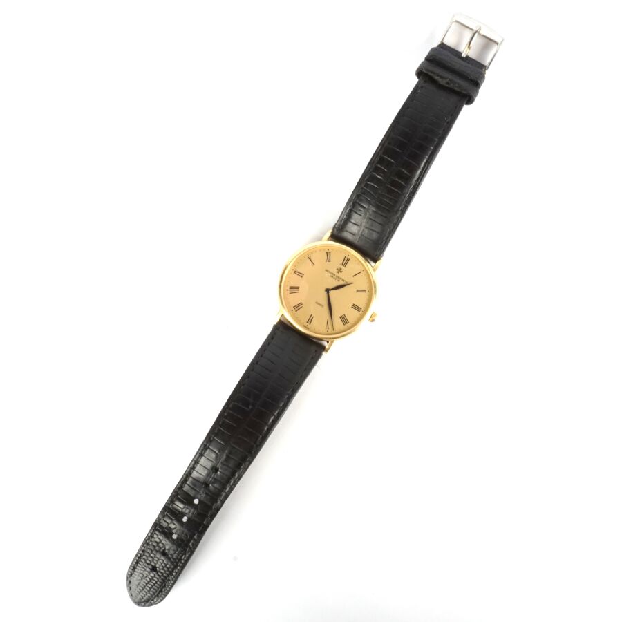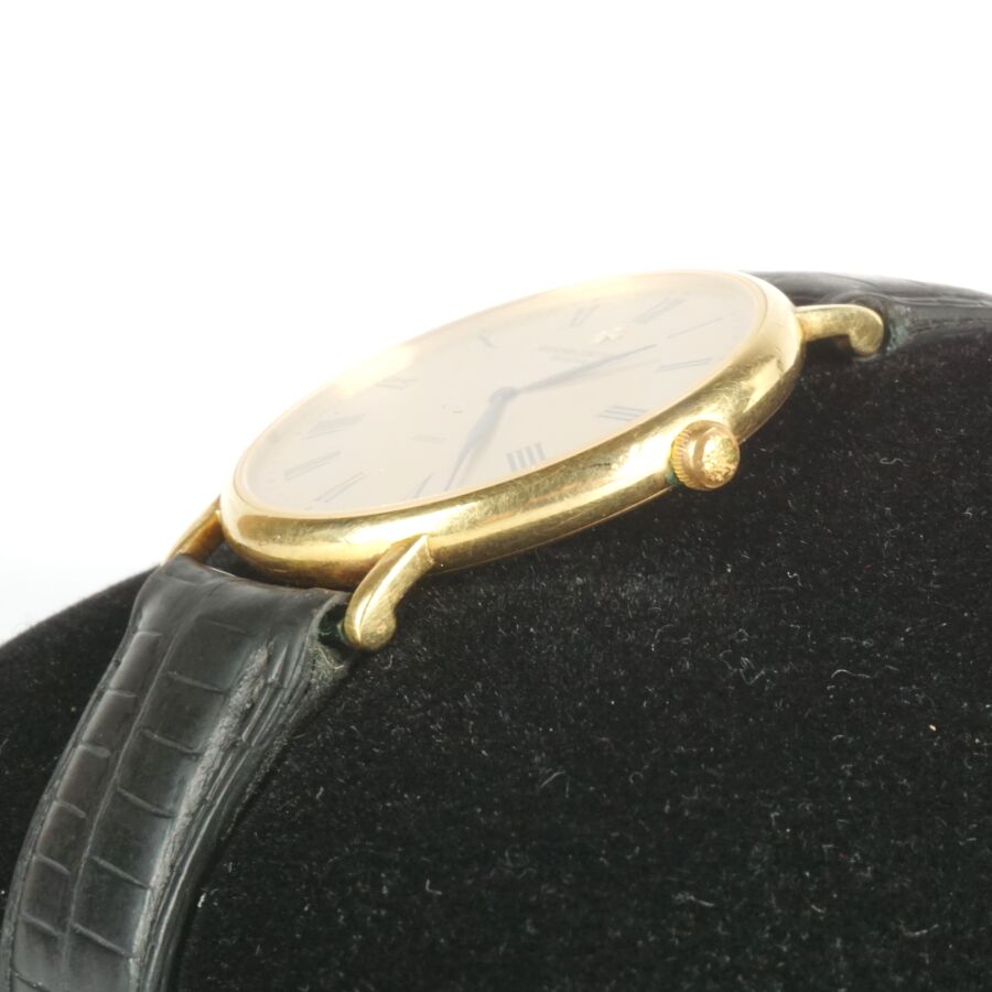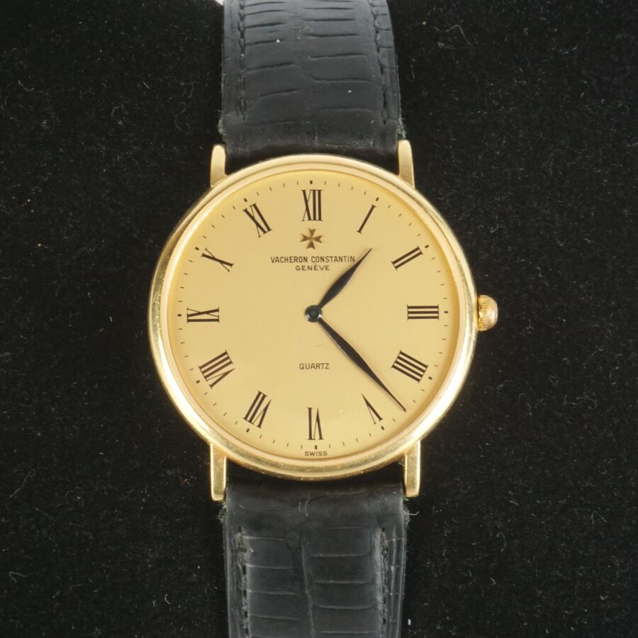 VACHERON CONSTANTIN : Montre bracelet, boîtier en or jaune 18K (750/oo), cadran doré signé, chiffres romains pour les heures, fond à clip, mouvement à quartz, bracelet en cuir et boucle ardillon en inox (rapportés), Diam. Boîtier : 3.2 cm. Poids brut : 32.4 g environ (usures au bracelet).