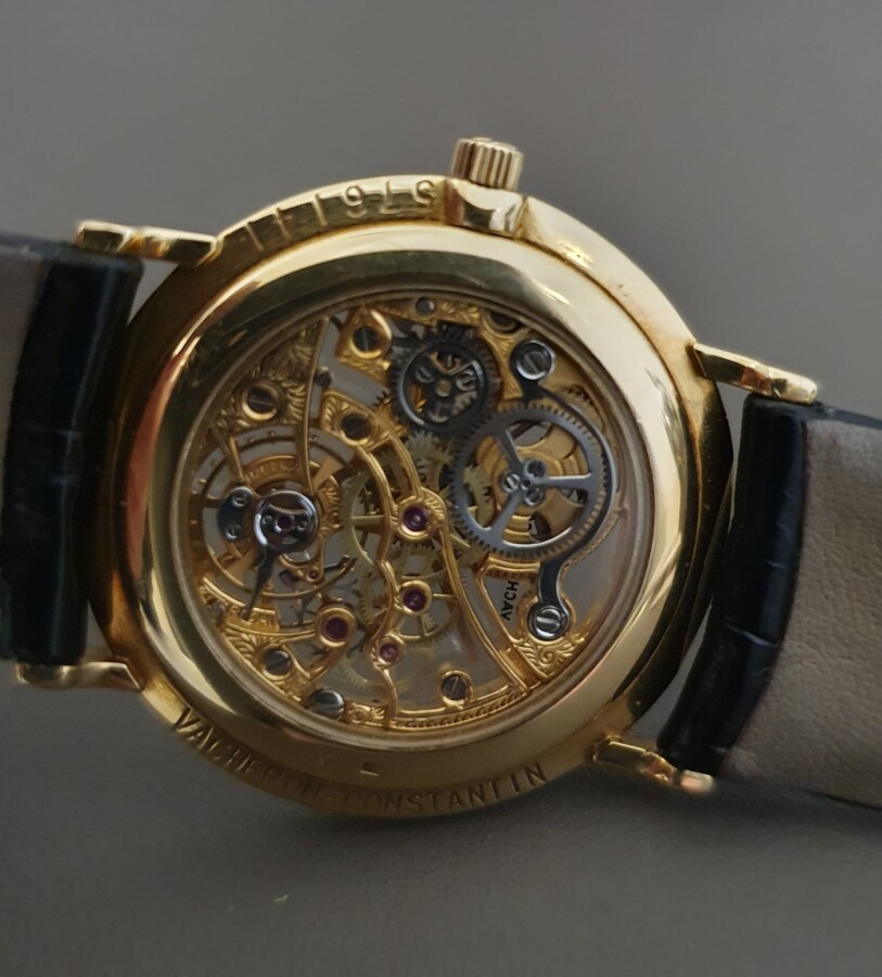 VACHERON CONSTANTIN : Montre squelette extra plate, boitier rond en or jaune 18K (750/oo), 30 mm, numéroté 576141, cadran à index signé et numéroté 741095, verre signé en noir, mouvement mécanique à remontage manuel N°100371, bracelet en crocodile noir, boucle ardillon en or jaune 18K (750/oo) siglée. Poids brut : 28.8 g environ.
