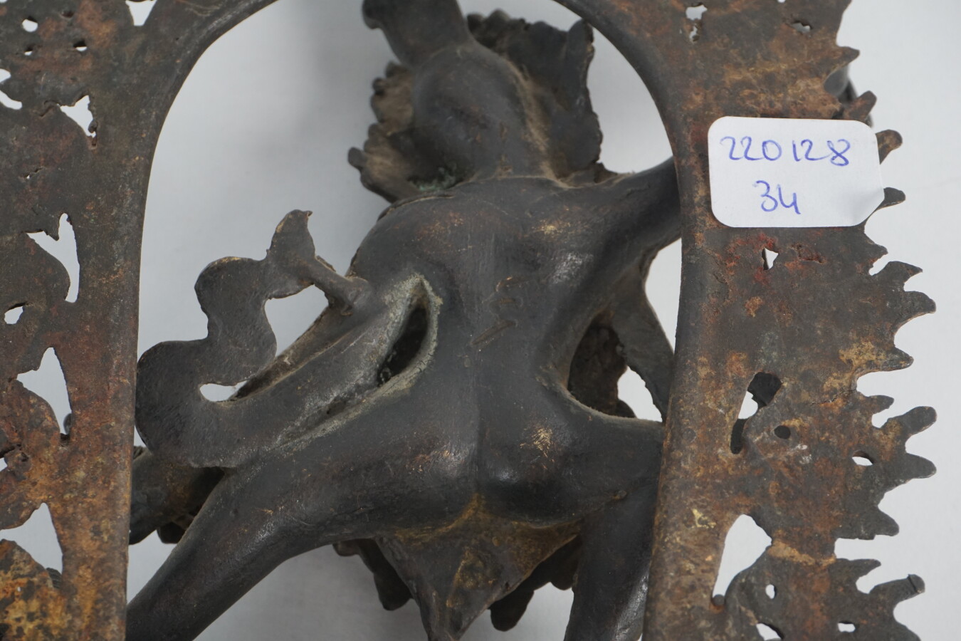 Vajrapani en bronze, présenté debout sur deux hommes reposant sur un lotus tenant les deux vajra dans chaque main, mandorle en forme de flamme, Tibet, milieu du 19ème siècle, H. 18.5 cm.