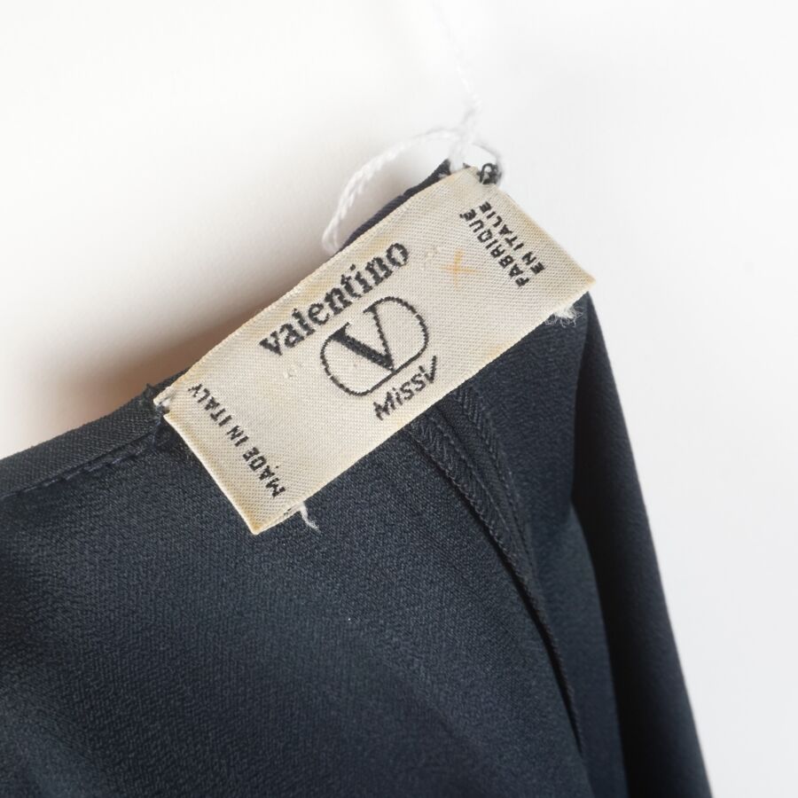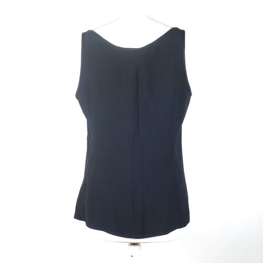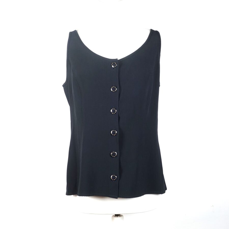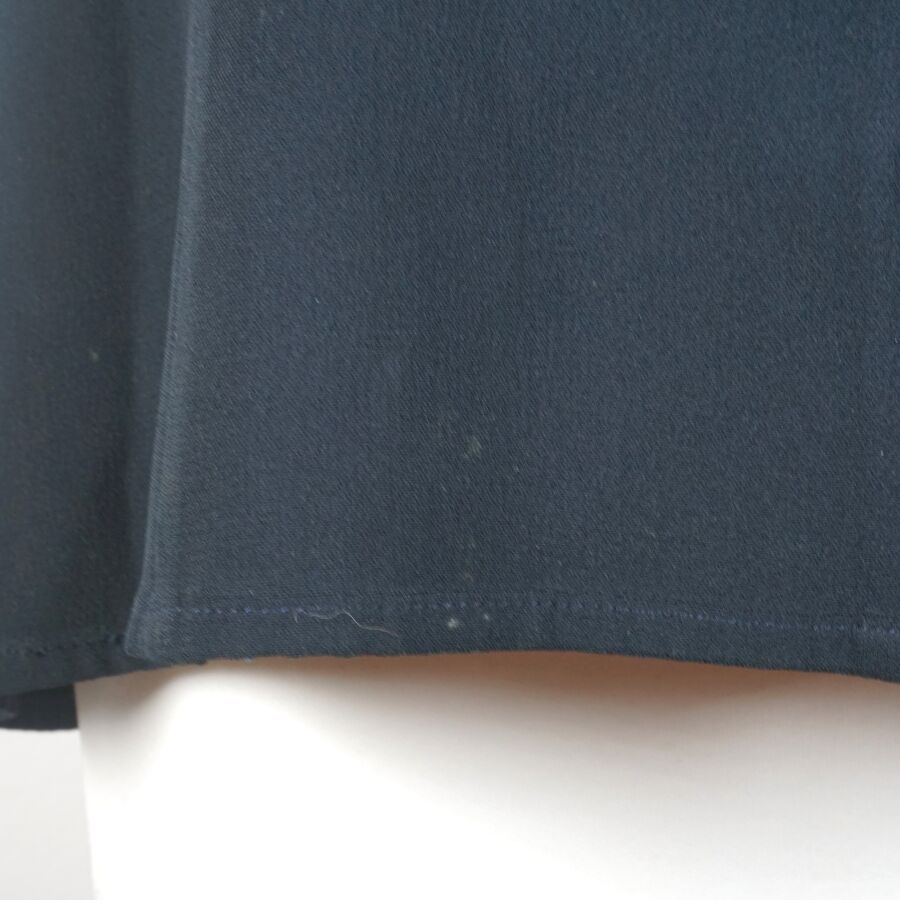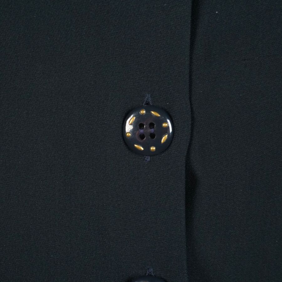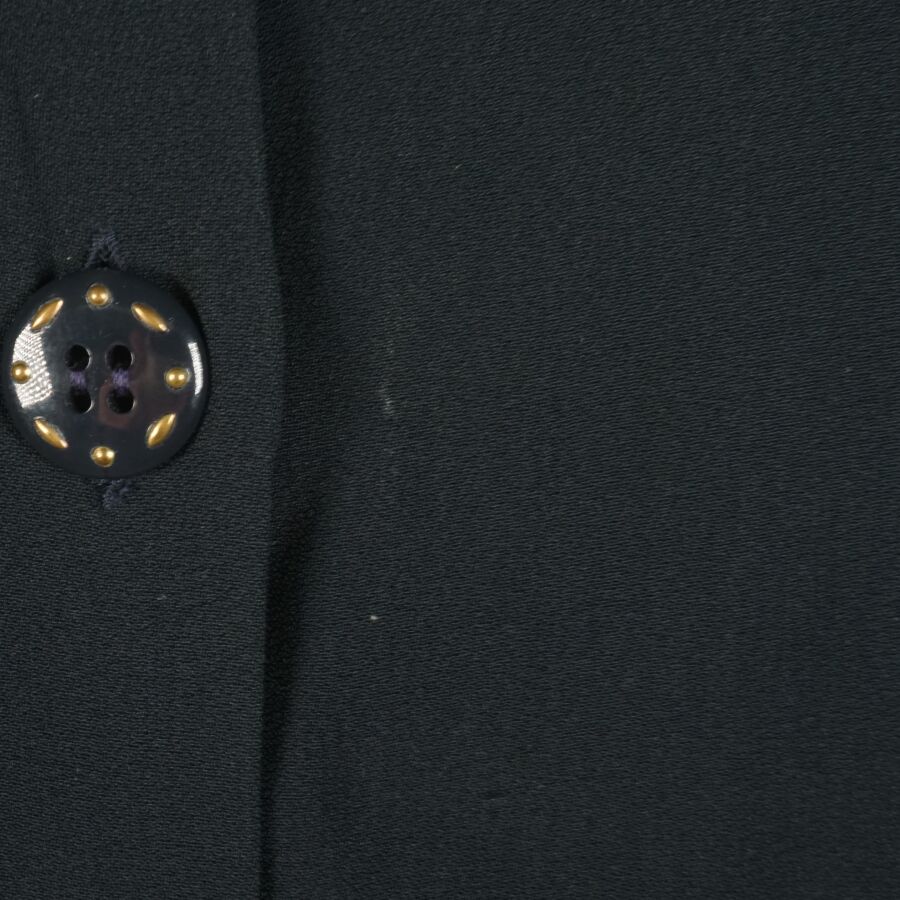 VALENTINO : Top bleu nuit/noir légèrement cintré à la taille, acétate et viscose, fermeture sur l'avant à 6 boutons bleus et dorés (avec un bouton supplémentaire sur étiquette), taille supposée M, L. Totale : 63 cm (infimes traces blanches).