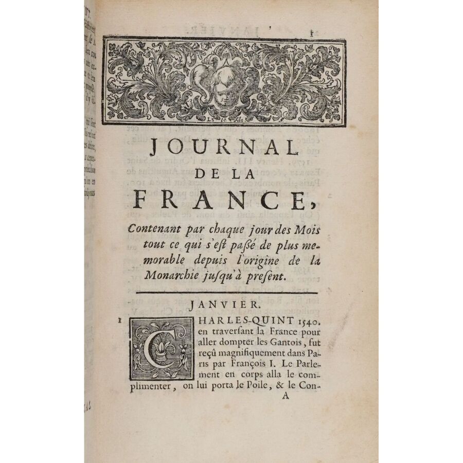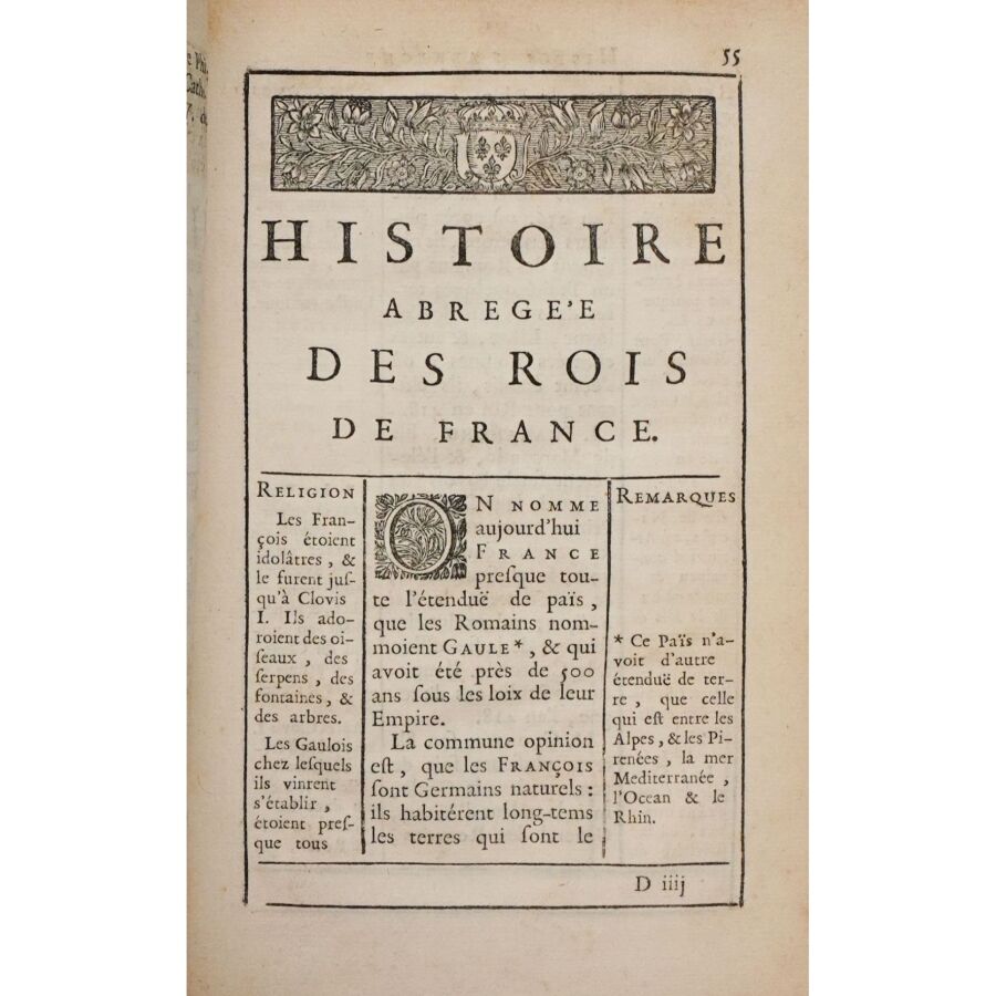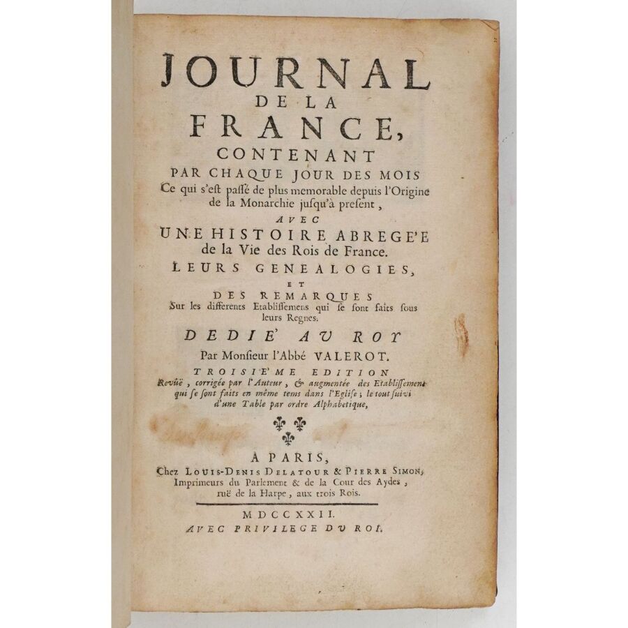Troisième édition dédiée à Louis XV de cet ouvrage paru pour la première fois en 1715 et composé par l'abbé Guillaume Valerot, auteur de l'Histoire journalière de Paris. Il s'agit d'un calendrier historique dans lequel l'auteur fait correspondre presque chaque jour de l'année 1722 avec un événement majeur de l'histoire. Il est suivi, sous la forme de trois colonnes, d'une histoire abrégée des rois de France avec leurs généalogies, et des remarques sur les différents établissements qui se sont faits sous leurs règnes.