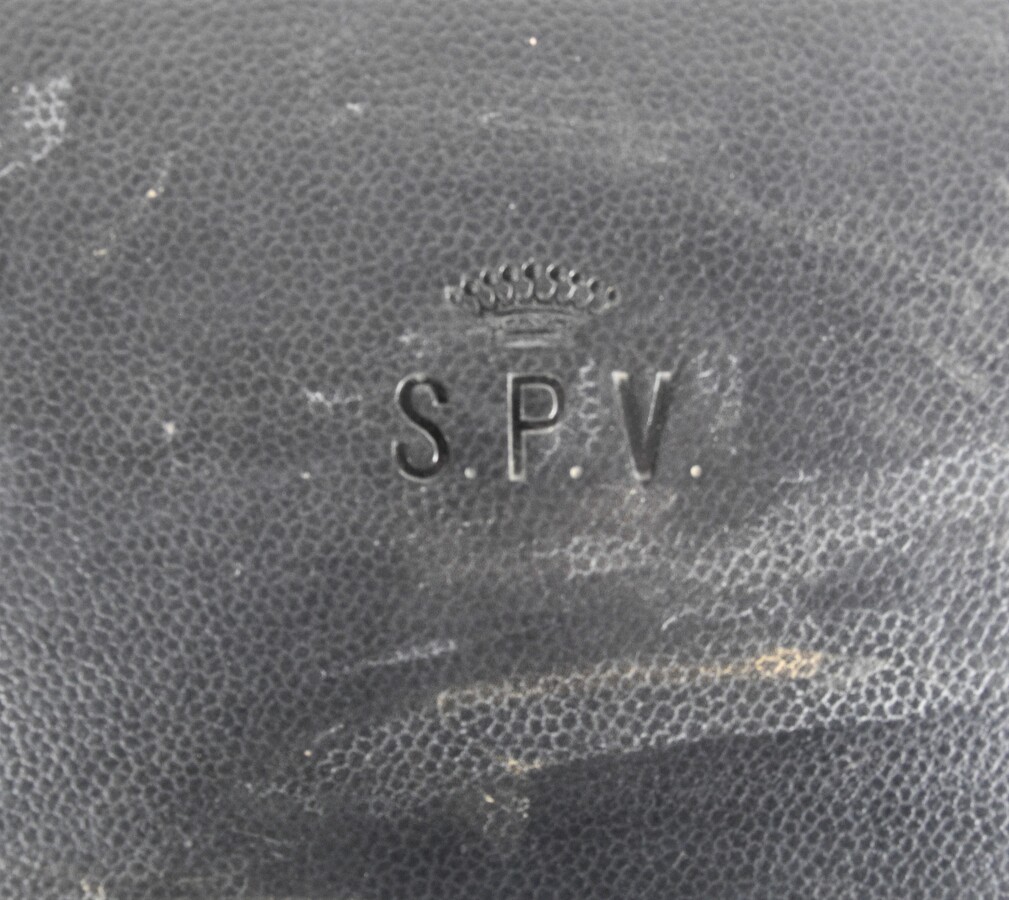 Valise de toilette en cuir noir monogrammée S.P.V couronné sur le dessus et ses accessoires dont brosses, chausse-pied, poudrier et boîte en métal argenté, flacons, boîte de rasage Gilette, 32 x 45.5 cm (manques, traces).