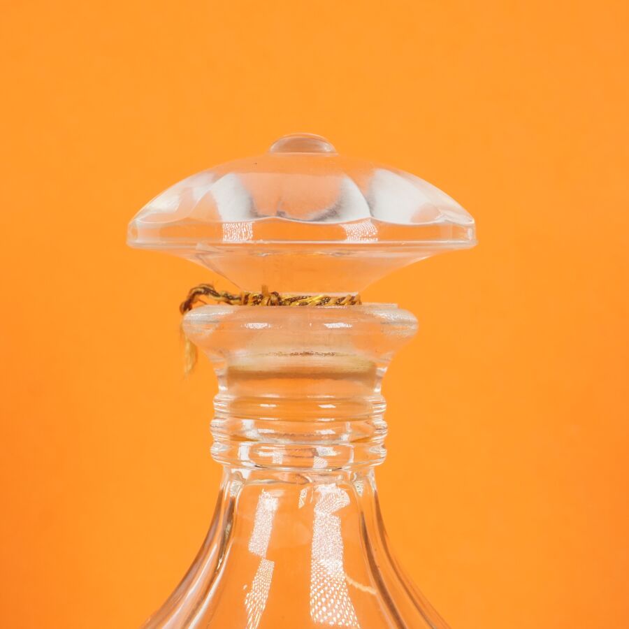 VALOYS : "Secret", flacon en verre incolore de forme pansue à godrons, étiquette sur une face en papier gaufré doré ornée d'un blason, H. 19.5 cm (presque vide, bouchon collé).