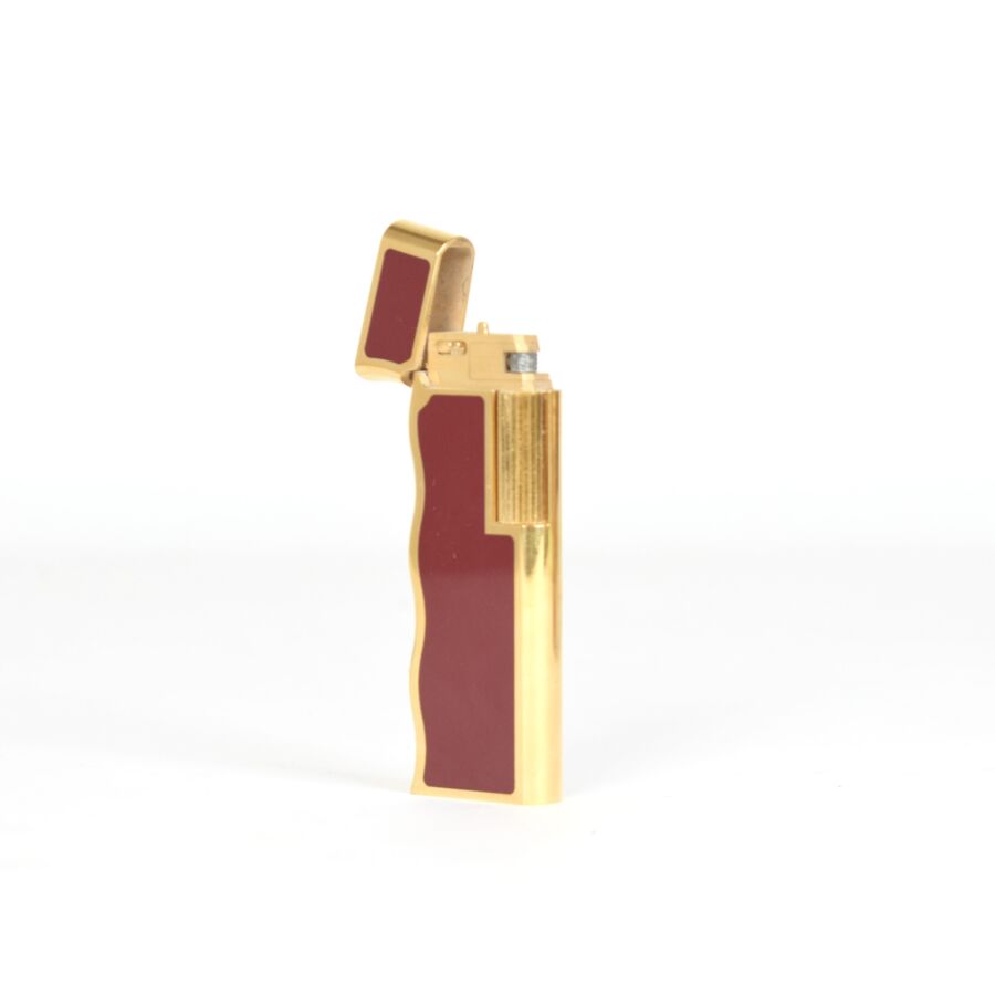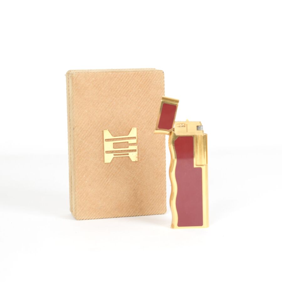 VAN CLEEF & ARPELS : Briquet en métal doré et laqué rouge, présenté dans son coffret, avec sa notice (usures). L. 2,5 cm. H. 7,5 cm.