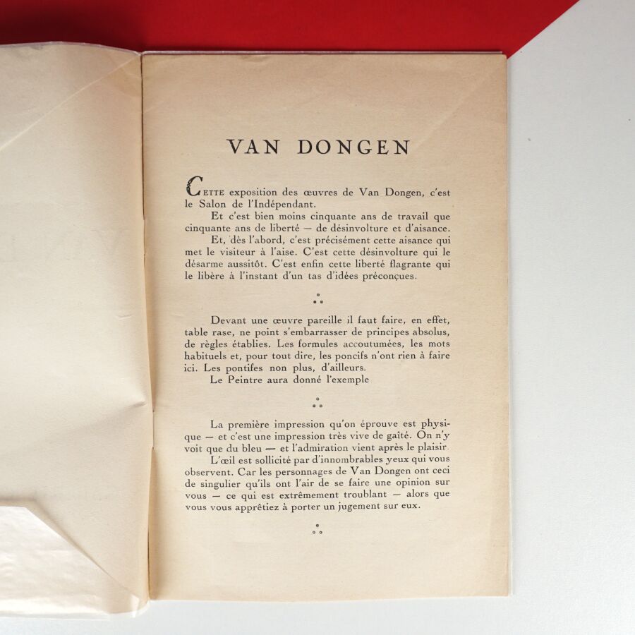 On y joint un catalogue d'exposition Van Dongen à la galerie Charpentier, 1942, préface de Sacha Guitry en édition originale, plaquette petit in-8 agrafée, couv. imprimée. L'exposition présentait 123 toiles de 1892 à 1942 et 98 aquarelles, pastels et dessins numérotés de 150 à 249. In fine, remerciements avec une liste de collectionneurs.