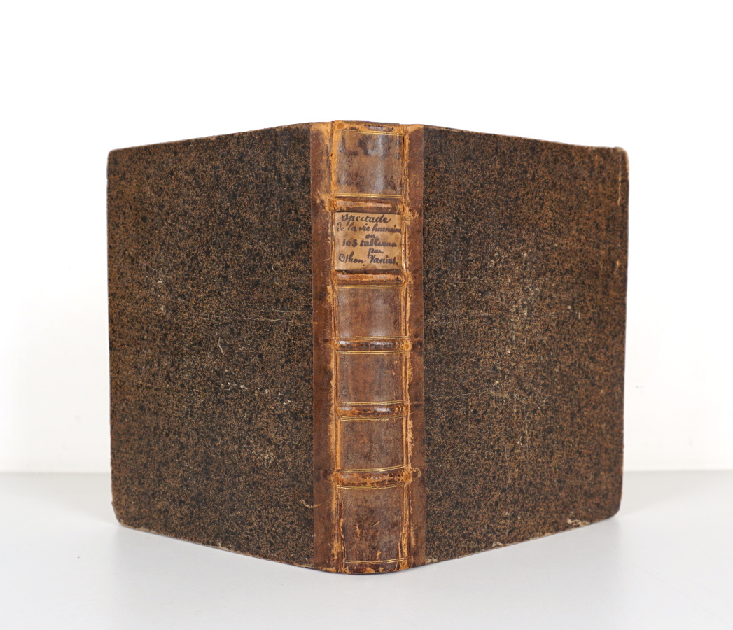 VAN VEEN (Otto) - LE CLERC (Jean) - Le spectacle de la nature ; ou leçons de sagesse, exprimés avec art en 103 tableaux en taille douce, accompagnés non seulement des principales maximes de la morale en vers françois, hollandois, latins et allemands, mais encore par des explications très belles sur chaque tableau par feu le savant et très célèbre Jean Le Clerc - La Haye ; Jean Van Duren, 1755 - 1 volume grand In-8° - [8], 420 pages - Feuillet des pages 191-192 déchiré sans perte, très petit manque en marge supérieure du feuillet des pages 215-216 - Titres (l'1 en français, l'autre en flamand) à l'encre rouge et noire, frise gravée encadrant toutes les pages (hormis la table) - 103 figures en taille-douce in texte - Les versets accompagnant les emblèmes sont en français, flamand, latin et allemand, les explications de Jean Le Clerc sont en français et en allemand - Reliure de l'époque demi-basane havane (mors frottés, coins usés) - Dos à nerfs orné (coiffes frottées) - Pièce de titre papier manuscrit à l'encre - Tranches mouchetées de rouge - 2 ex-libris au 1er contre plat : l'1 gravé et armorié non identifié, l'autre gravé et armorié : A. Brölemann au 1er contre plat - Bon exemplaire.