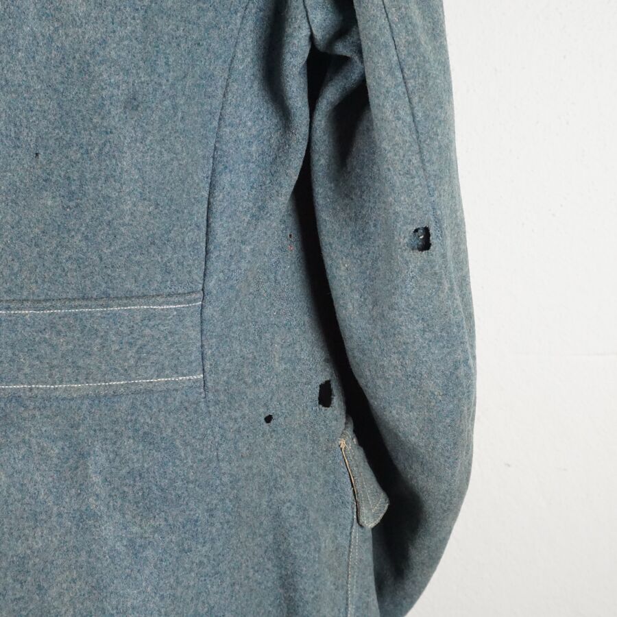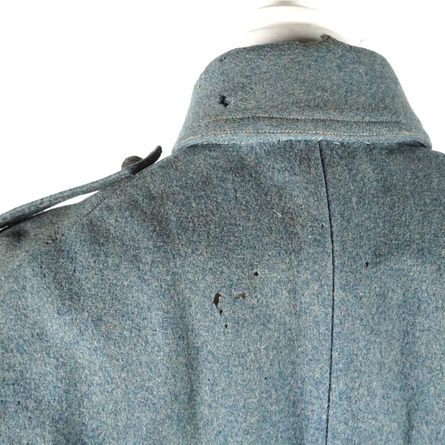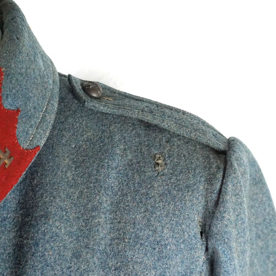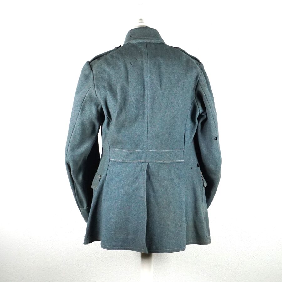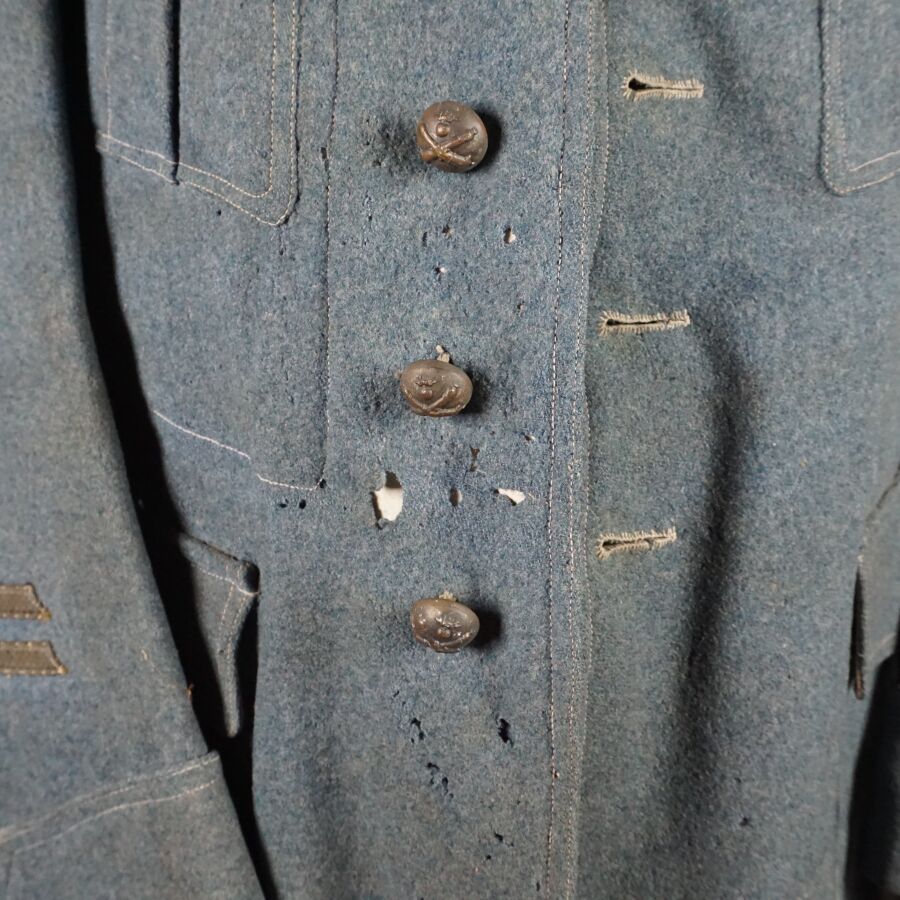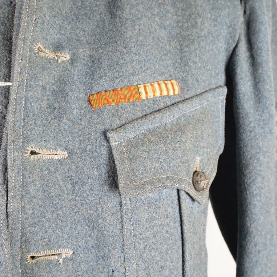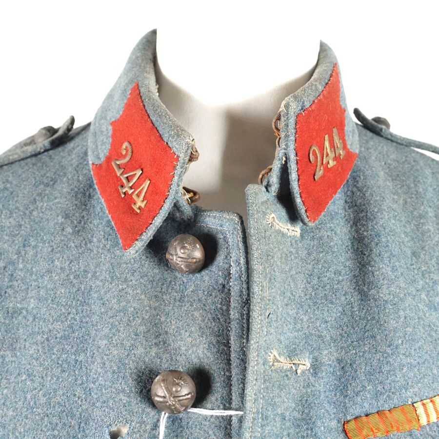 VAREUSE DE SOUS-OFFICIER DU 244ème REGIMENT D'ARTILLERIE, en drap bleu horizon ouvrant à 7 boutons à l'empreinte de l'artillerie, 4 poches à faux plis, pattes de col en drap écarlate à chiffres en laiton, galons dans le bas des manches, 4 chevrons de présence au front, rubans de la Croix de Guerre 1914 et de la Médaille commémorative italienne de la guerre 1915-1818, nombreux trous de mites et accidents mais encore présentable, ME/EM.
