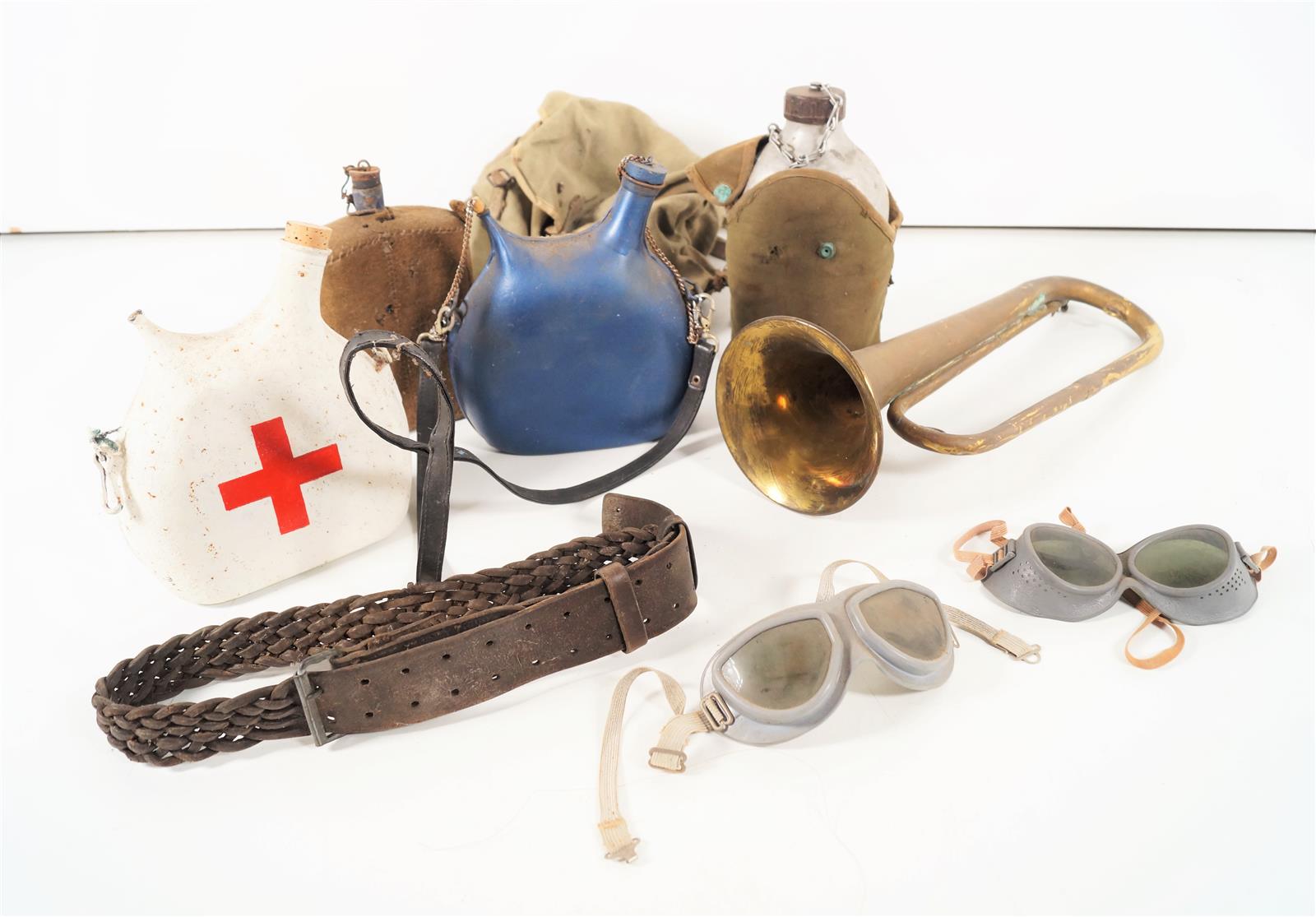 VARIA - Ensemble comprenant : BIDONS, CARTOUCHIERES SUISSES en cuir, BIDON ANGLAIS, FOURRAGERES, LUNETTES, EPAULETTES et PAIRES D'EPAULETTES, CLAIRON accidenté, BRASSARD, SACCOCHE, PORTE-CARTES, DRAPEAUX, DANS L'ETAT.