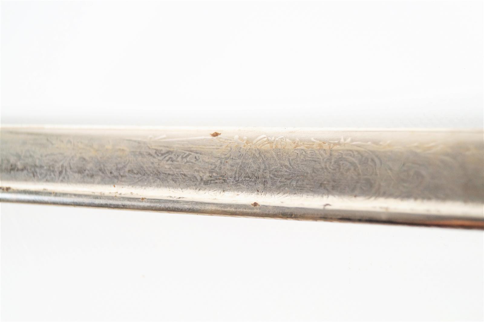 VARIA - SABRE D'OFFICIER, monture nickelée piquée à trois branches plates et garde enveloppante, poignée rainurée en bois noirci, calotte à longue queue. Lame droite piquée 82 cm à un tranchant, gravée à l'acide et à dos rond, fourreau nickelé piqué à deux bracelets et anneaux de suspente, début XXème, EM.