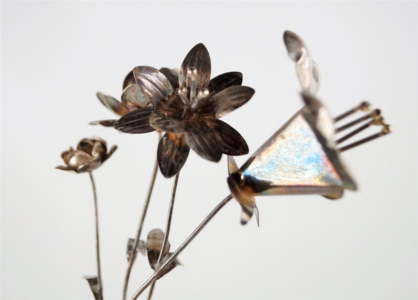 Vase à décor floral, argent massif (925/oo), avec ses quatre fleurs en argent. Poids brut : 127 g environ.