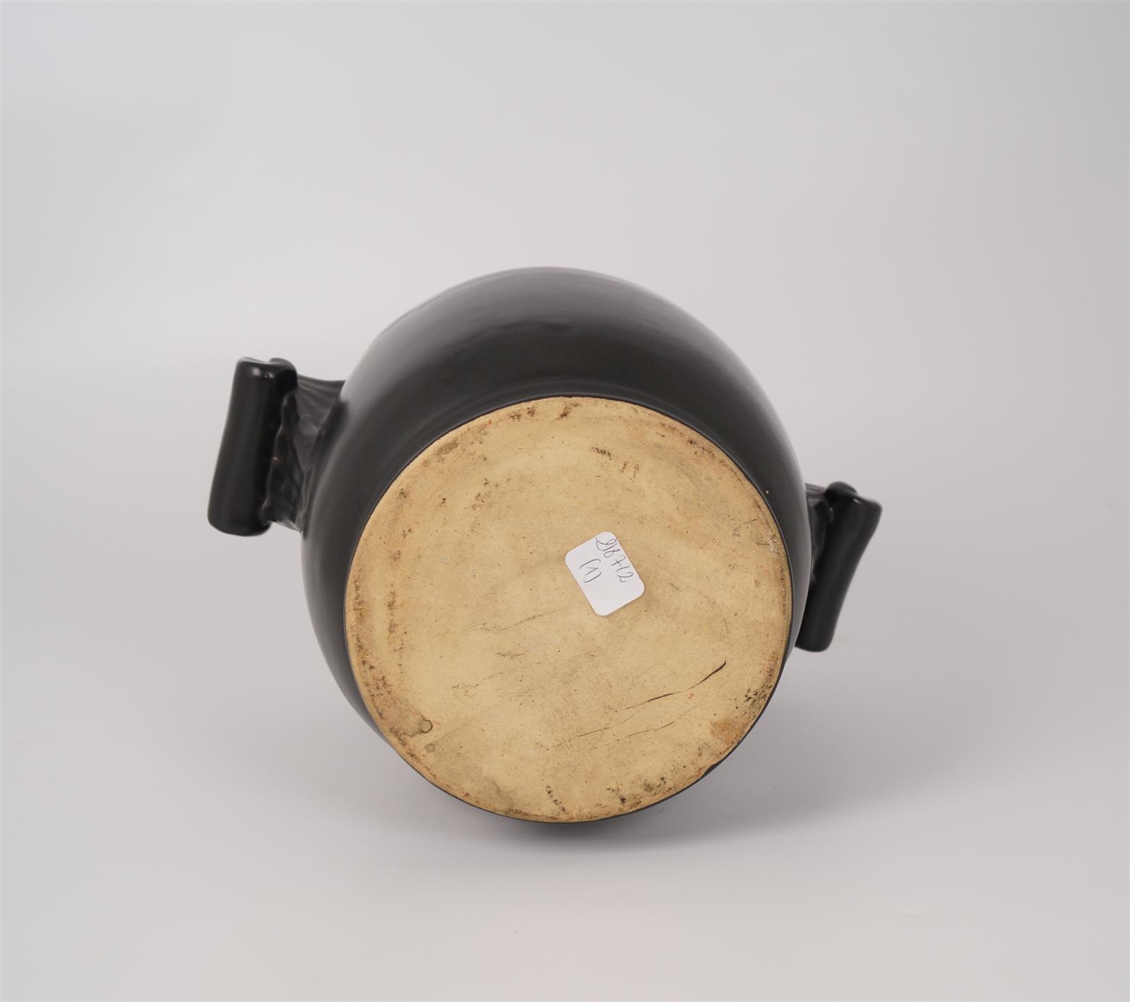 Vase à deux oreilles, en faïence émaillée noir métallique, H. 19 cm (petits défauts de cuisson)