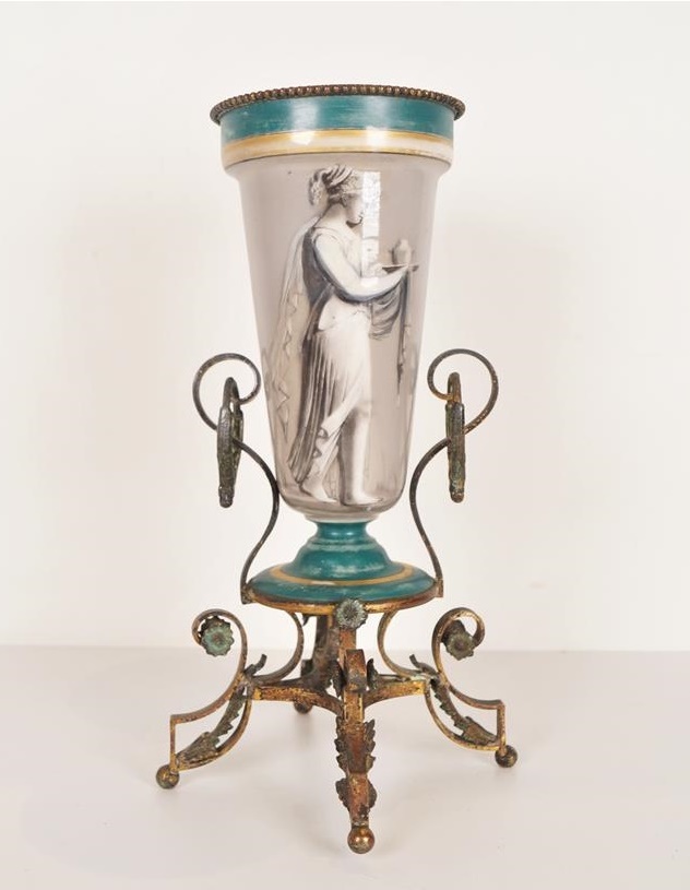 Vase cornet en porcelaine à décor à l'antique en grisaille sur fond vert, monture en métal doré formant 2 anses à anneaux feuillagés et piétement quadripode, 19e siècle, H. 28.5 cm (usures).