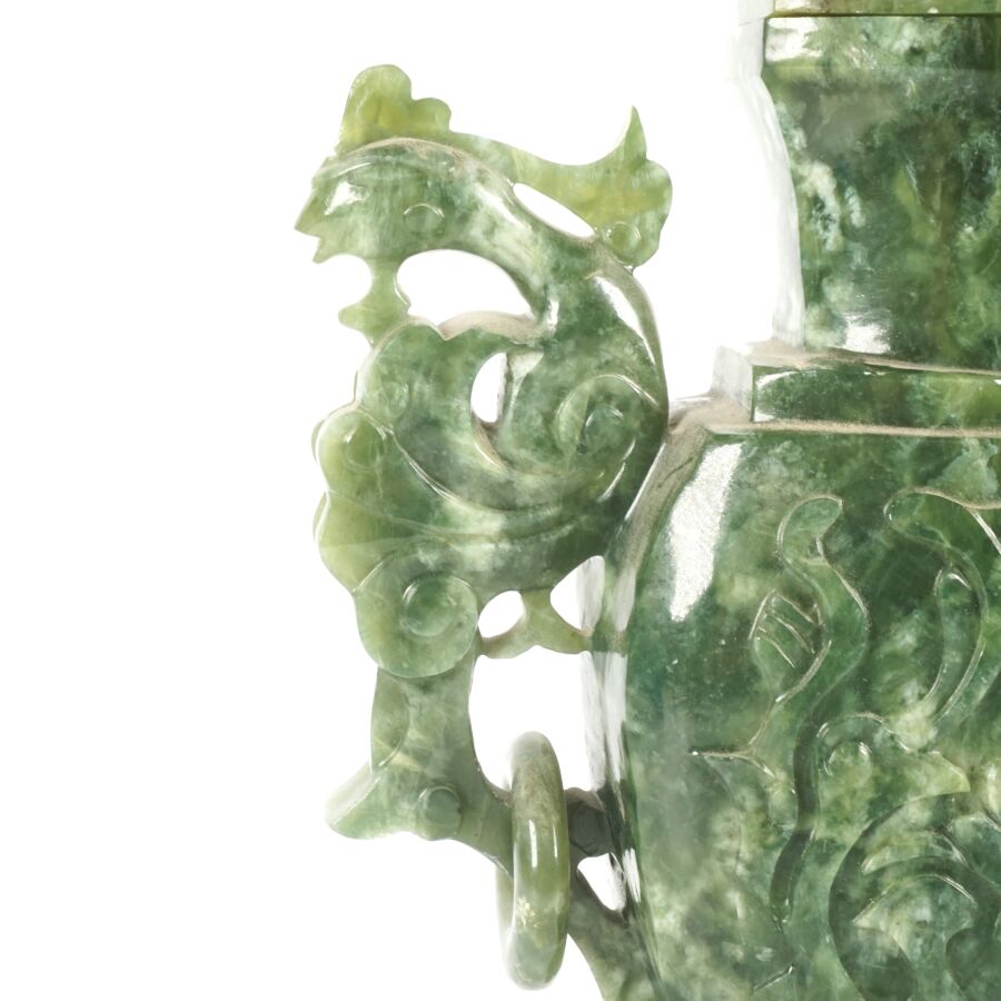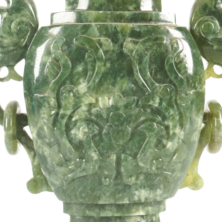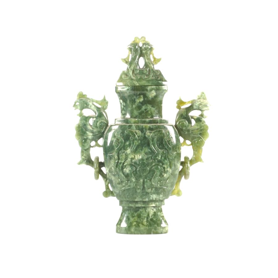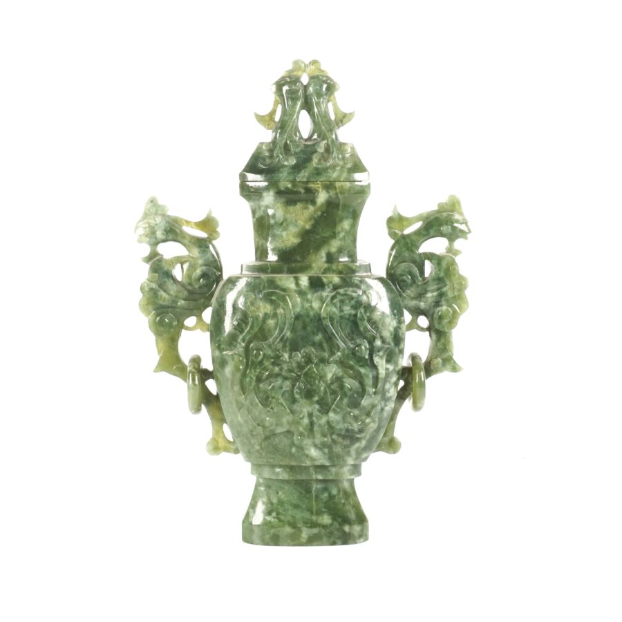 Vase couvert en serpentine, la prise du couvercle et les anses figurant deux coqs, les anses retenant deux anneaux mobiles, Chine, travail moderne, H. 32.8 cm.