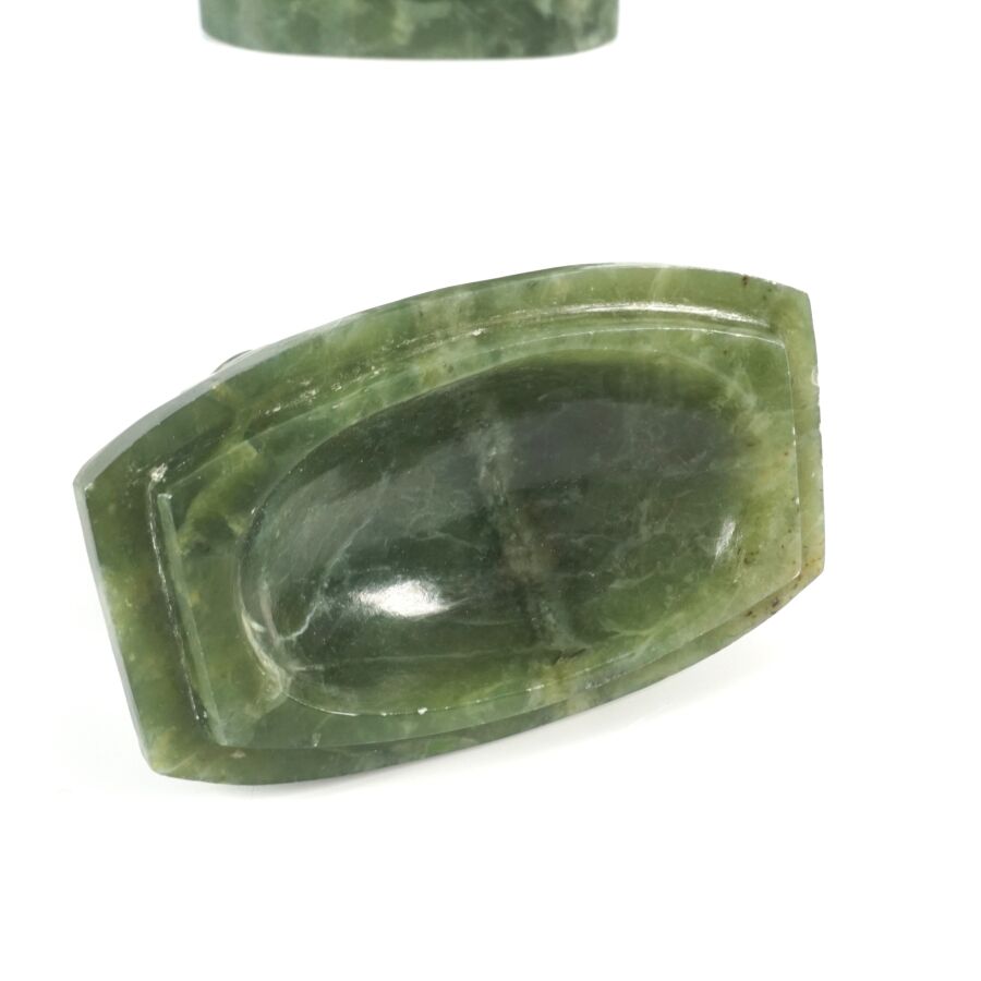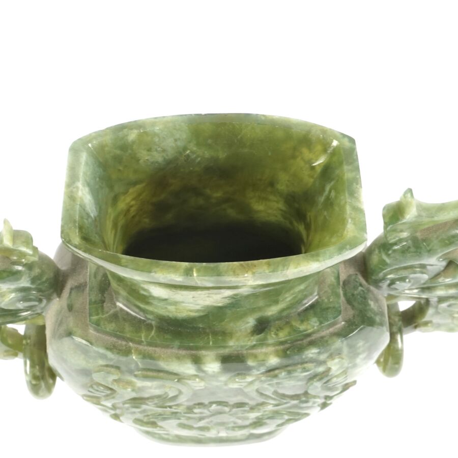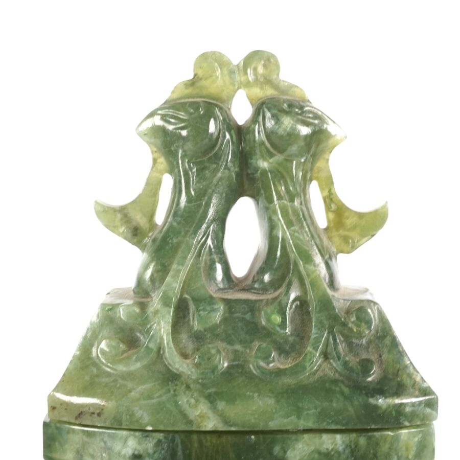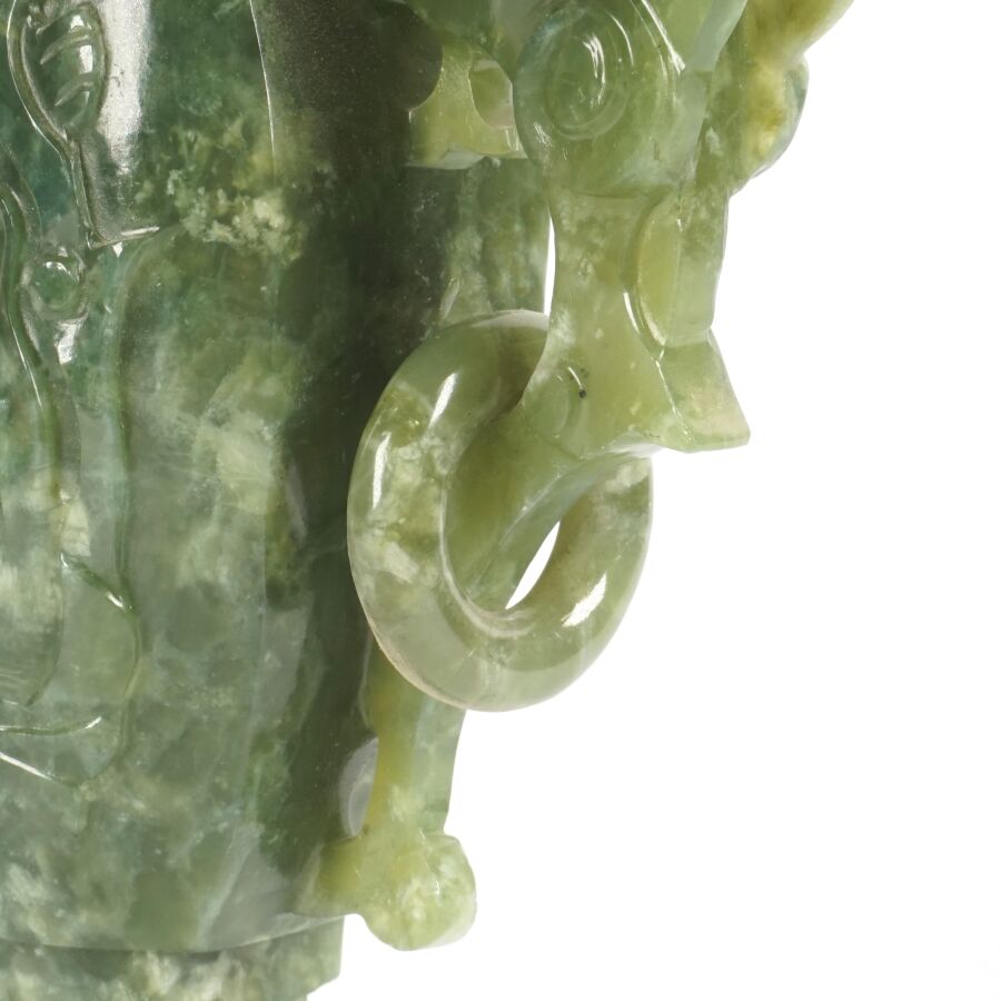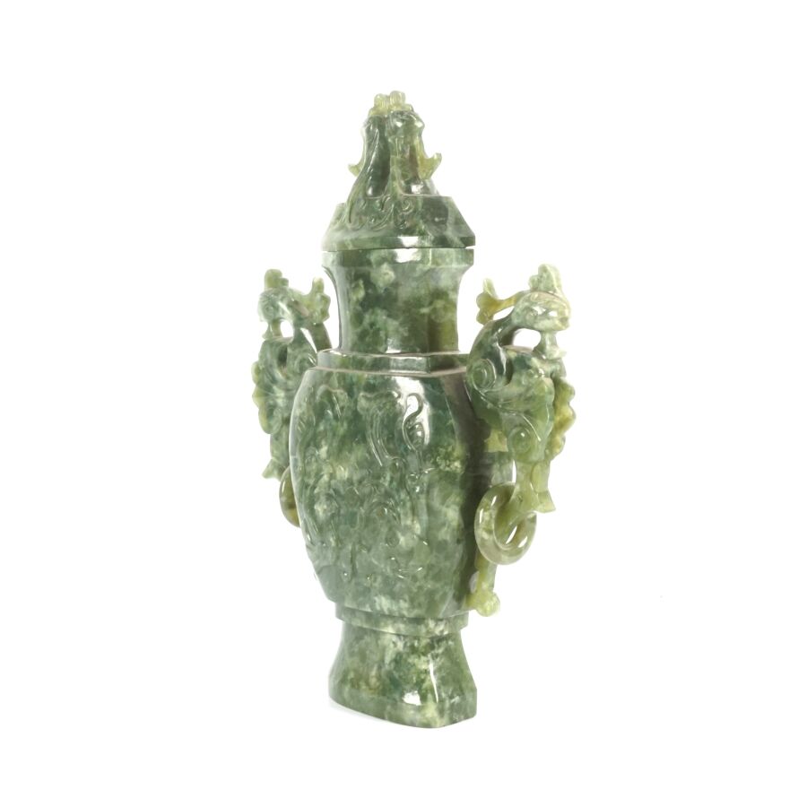 Vase couvert en serpentine, la prise du couvercle et les anses figurant deux coqs, les anses retenant deux anneaux mobiles, Chine, travail moderne, H. 32.8 cm.