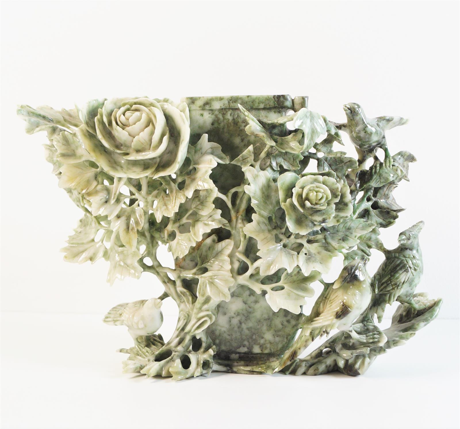 Vase couvert richement sculpté en serpentine foang à décor de fleurs et d'oiseaux du paradis, sur un socle en bois, H. 36.5 cm (dans son coffret bleu, un manque).