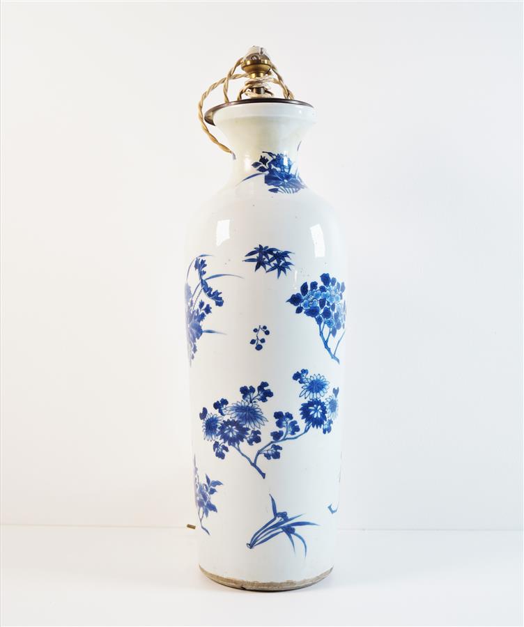 Vase cylindrique de forme balustre en porcelaine blanche à décor en bleu sous couverte de motif de fleurs, Chine, fin 17e siècle, H. 42 cm (restaurations au col, petites rayures à la couverte.