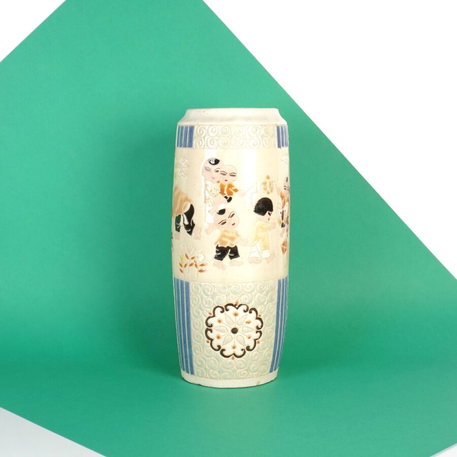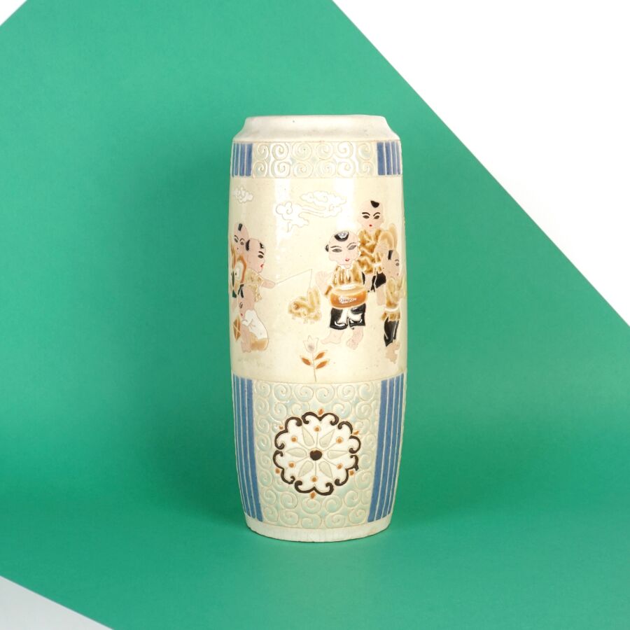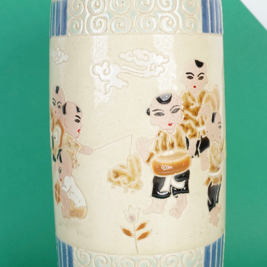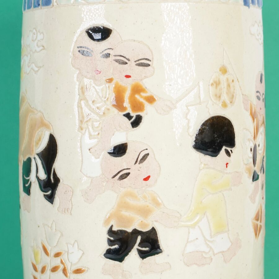 Vase cylindrique en céramique émaillée polychrome à décor de la fête du printemps, les enfants jouant avec un lion bouddhique et instruments, fleurs et volutes complètent le décor, circa 1960, Bien Hoa, Vietnam, H. 26.5 cm (petits éclats).