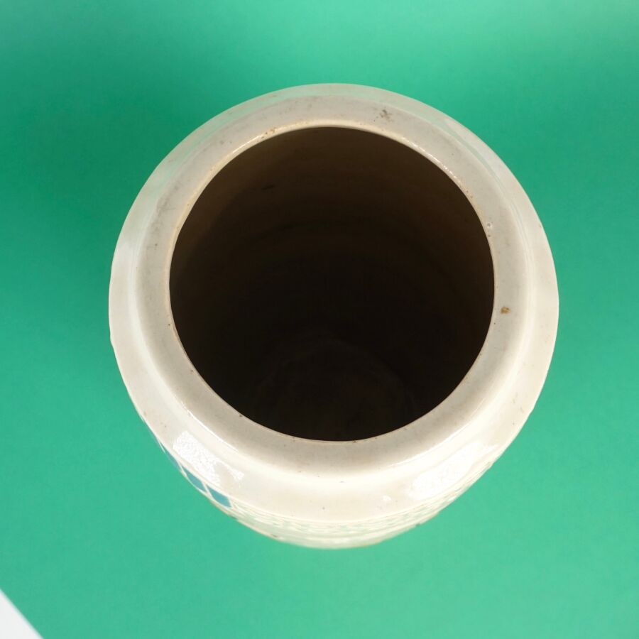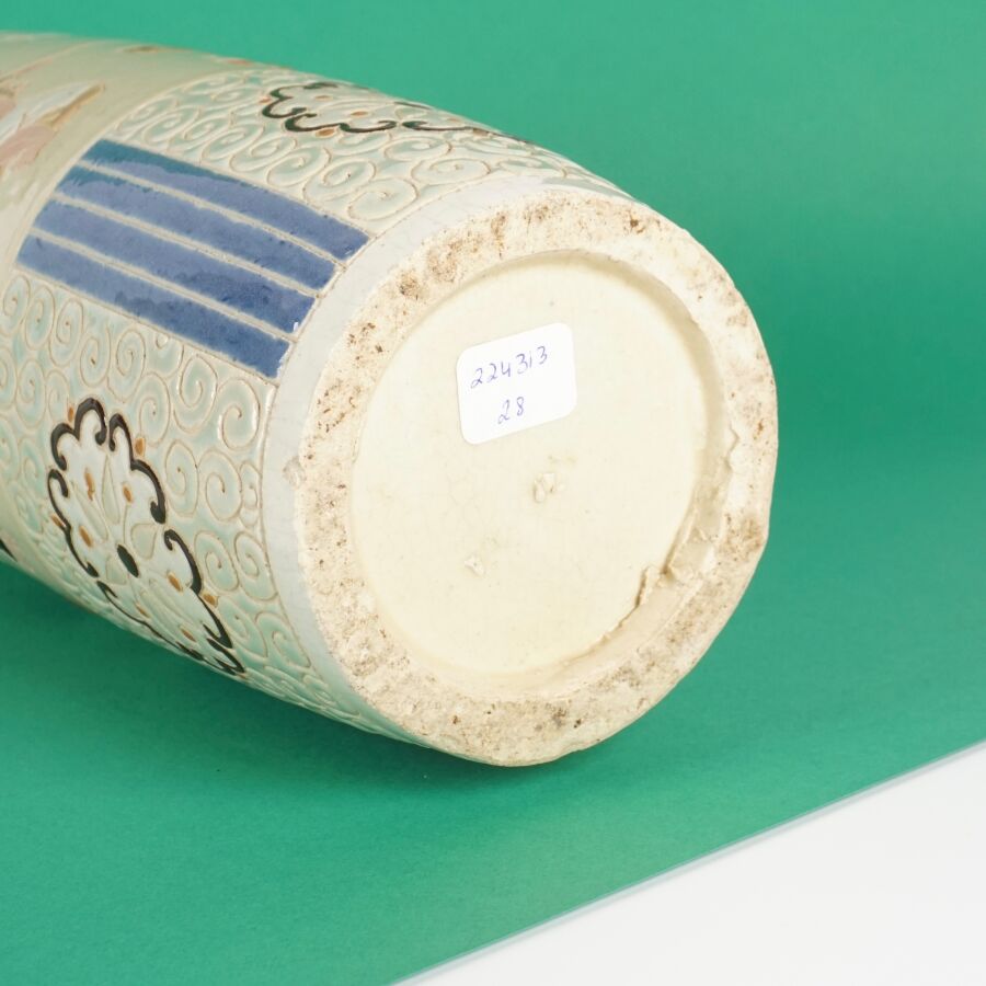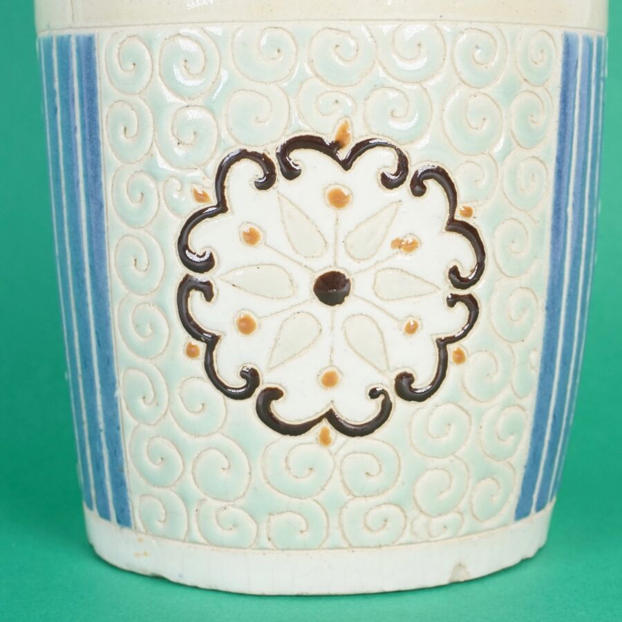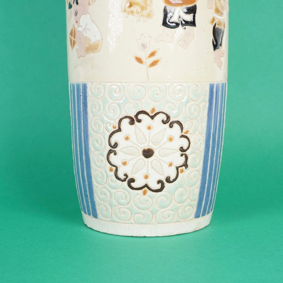Vase cylindrique en céramique émaillée polychrome à décor de la fête du printemps, les enfants jouant avec un lion bouddhique et instruments, fleurs et volutes complètent le décor, circa 1960, Bien Hoa, Vietnam, H. 26.5 cm (petits éclats).