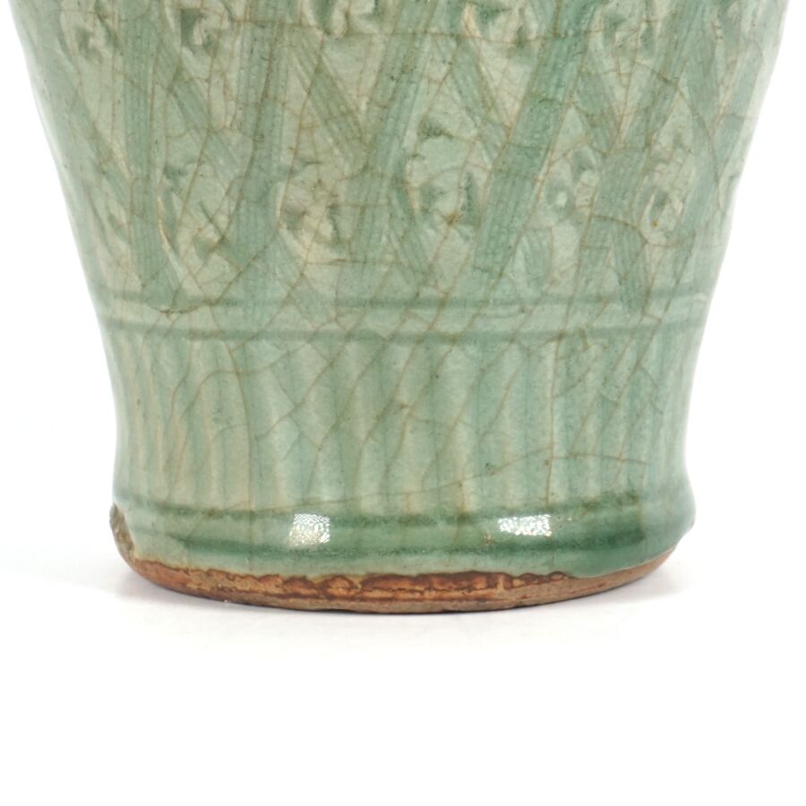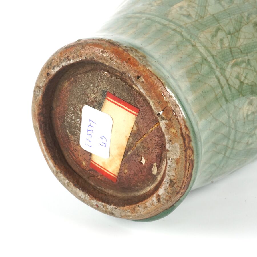 Vase de forme balustre en céramique émaillée céladon à décor de motifs géométriques stylisés sous la couverte, Chine du Sud, fin de l'époque Ming , H. 26 cm (oxydation, taches).