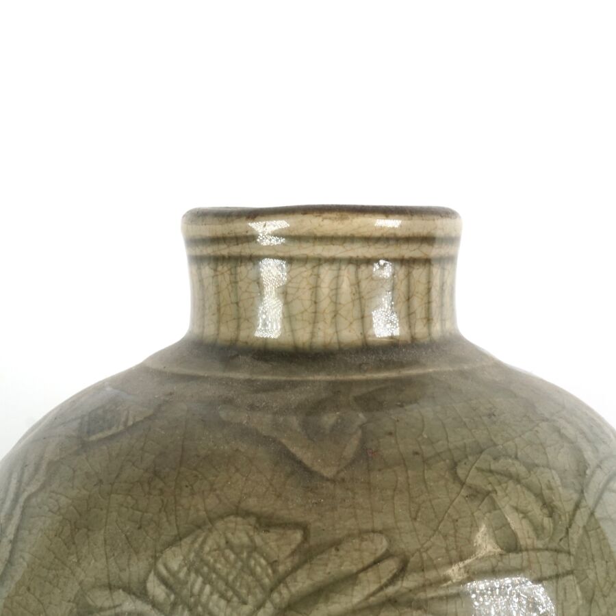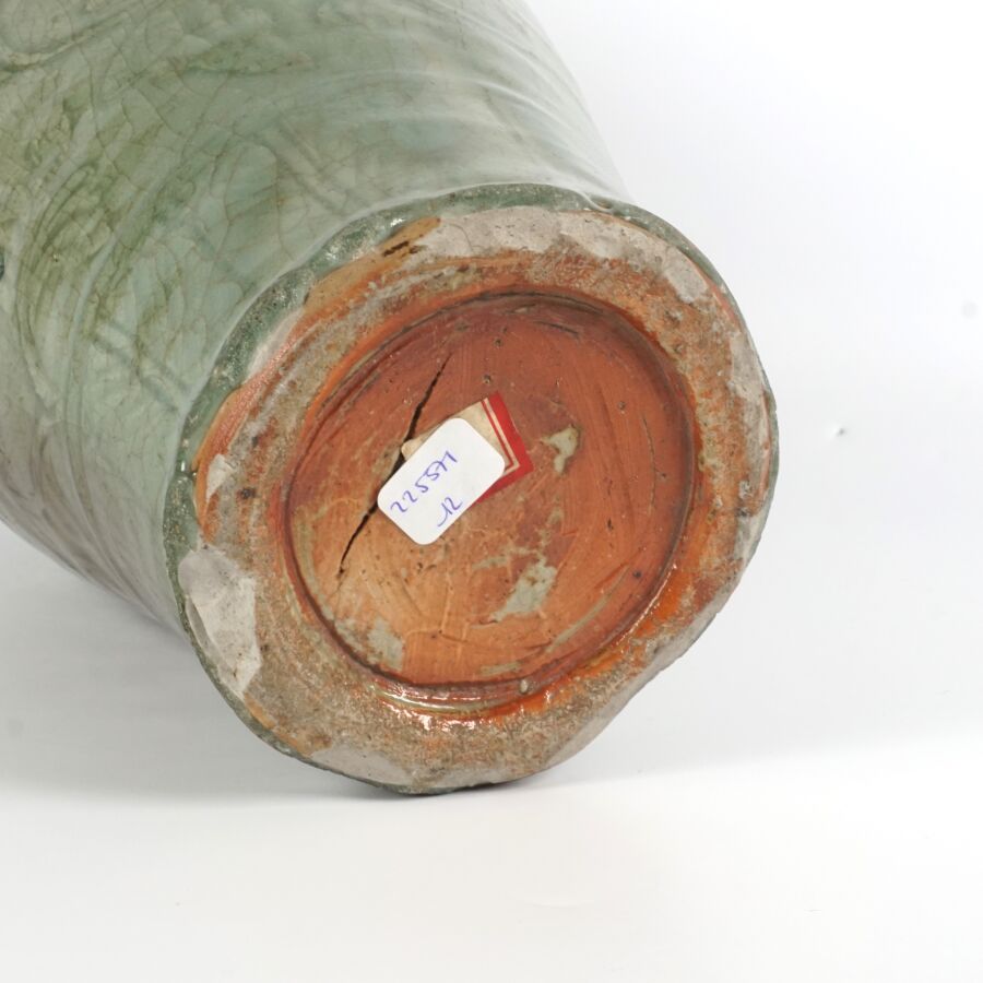Vase de forme balustre en grès émaillé céladon, sur un socle en bois sculpté, Chine, époque Qing dans le goût des Ming, H. 35 cm (éclat sous la base).