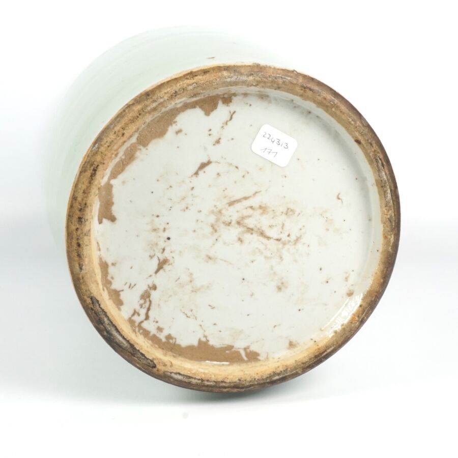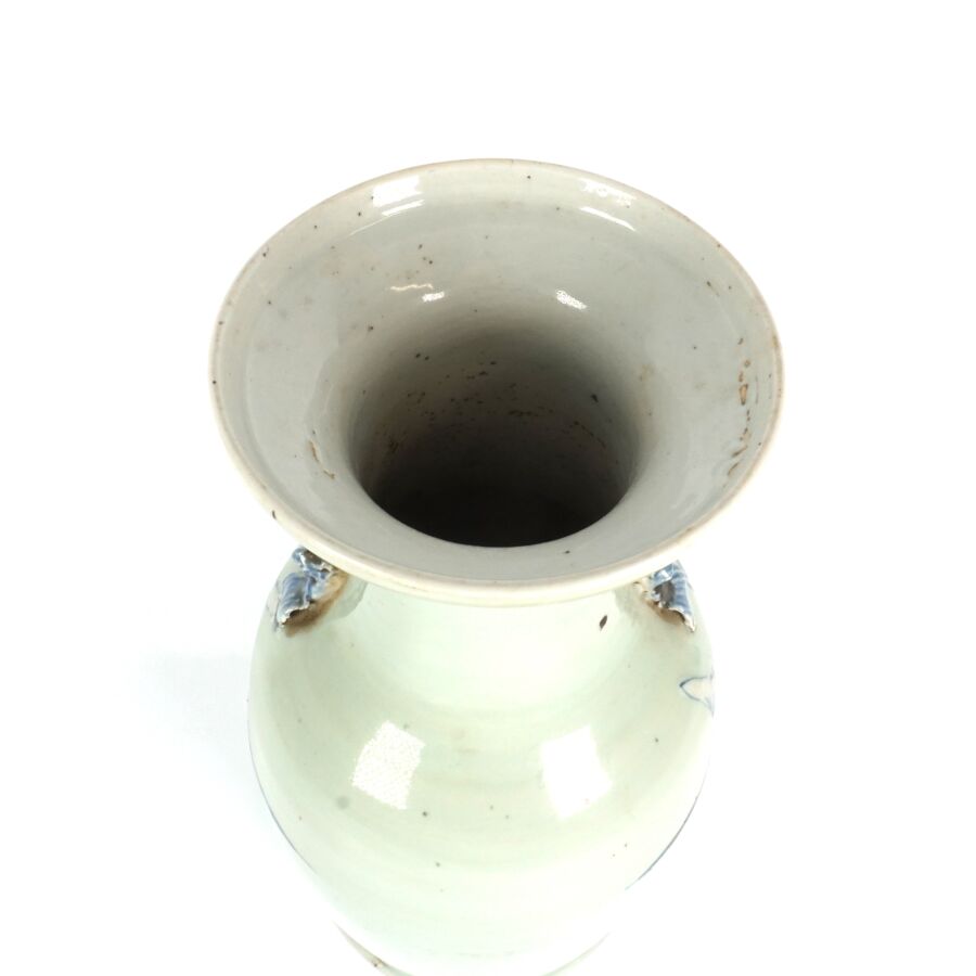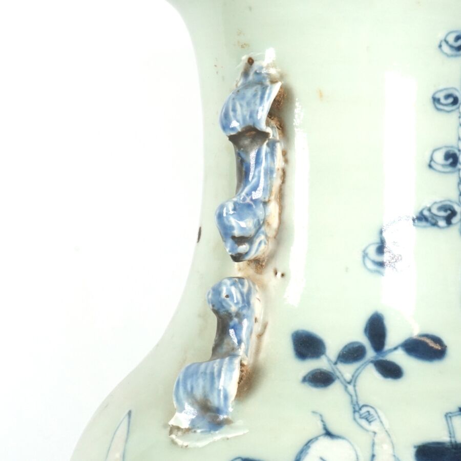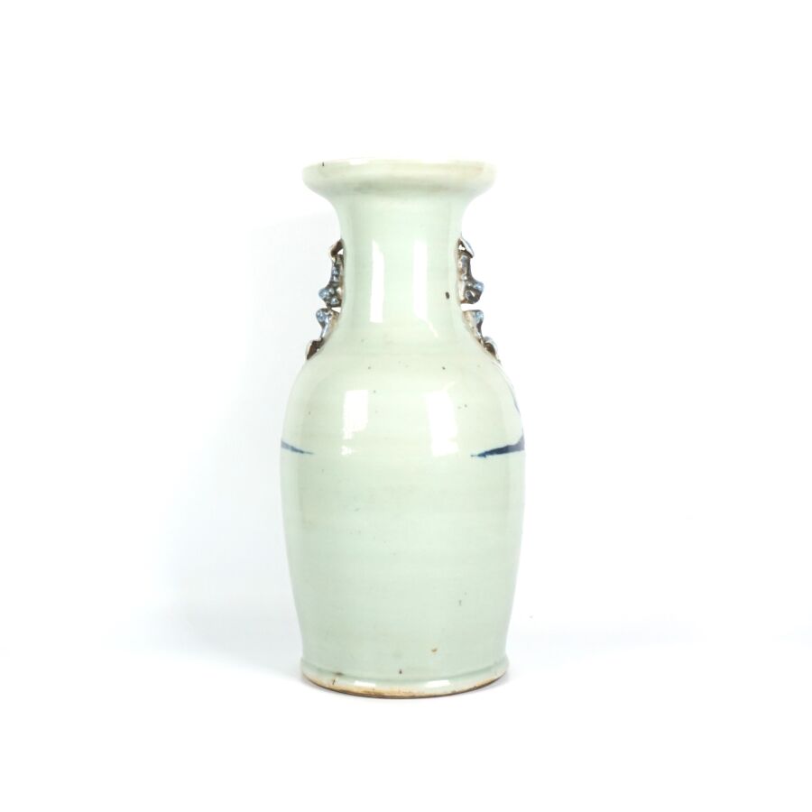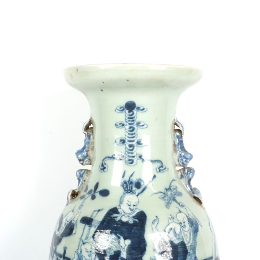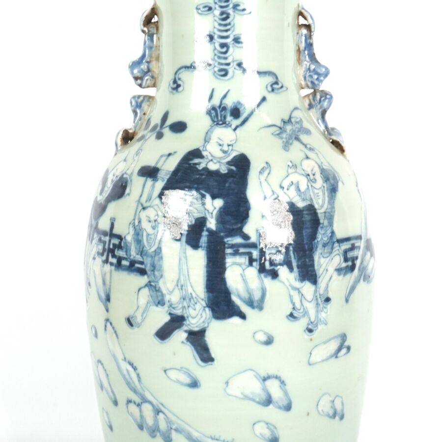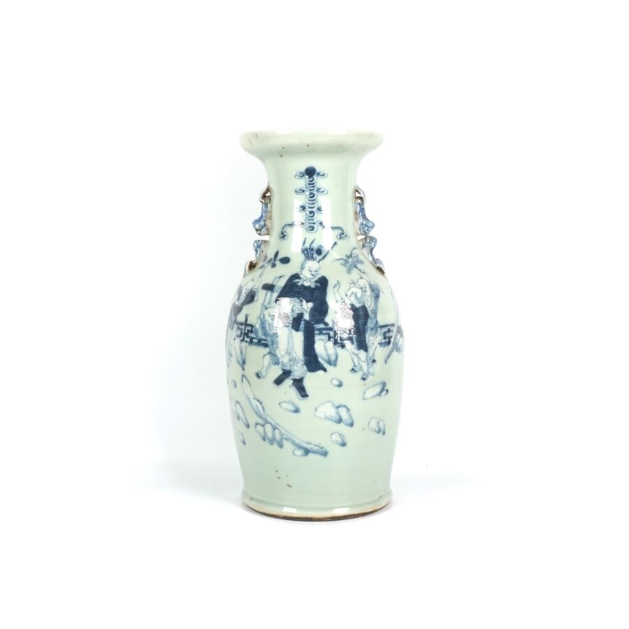 Vase de forme balustre en porcelaine émaillée céladon à décor en bleu et blanc des frères Hoho et d'enfants jouant sur une terrasse arborée, accompagnés de leur maître, quatre lions bouddhiques en haut-relief formant anses ornent le col, Chine, circa 1900, H. 43 cm (défauts de cuisson).