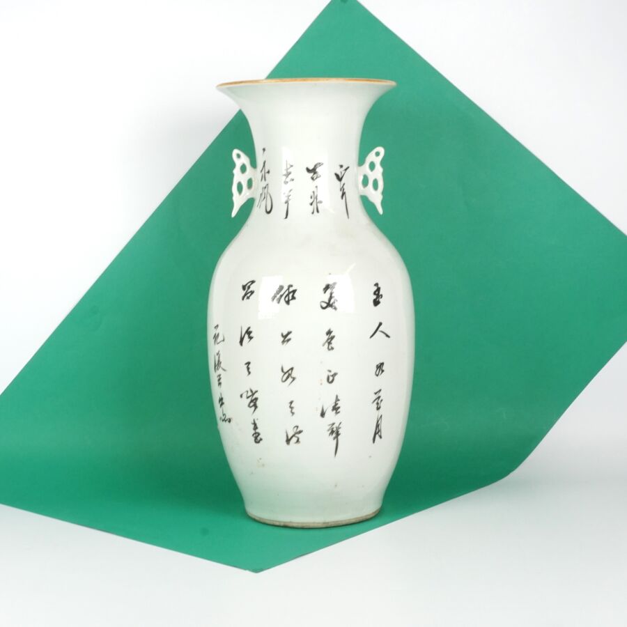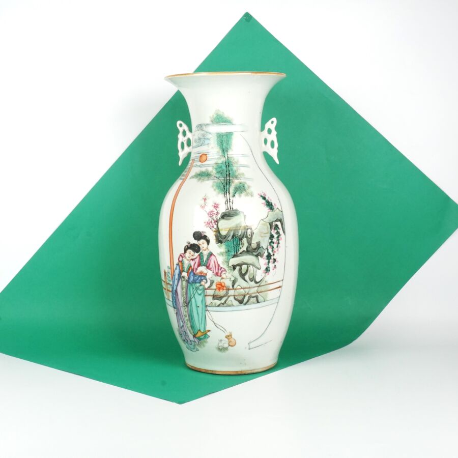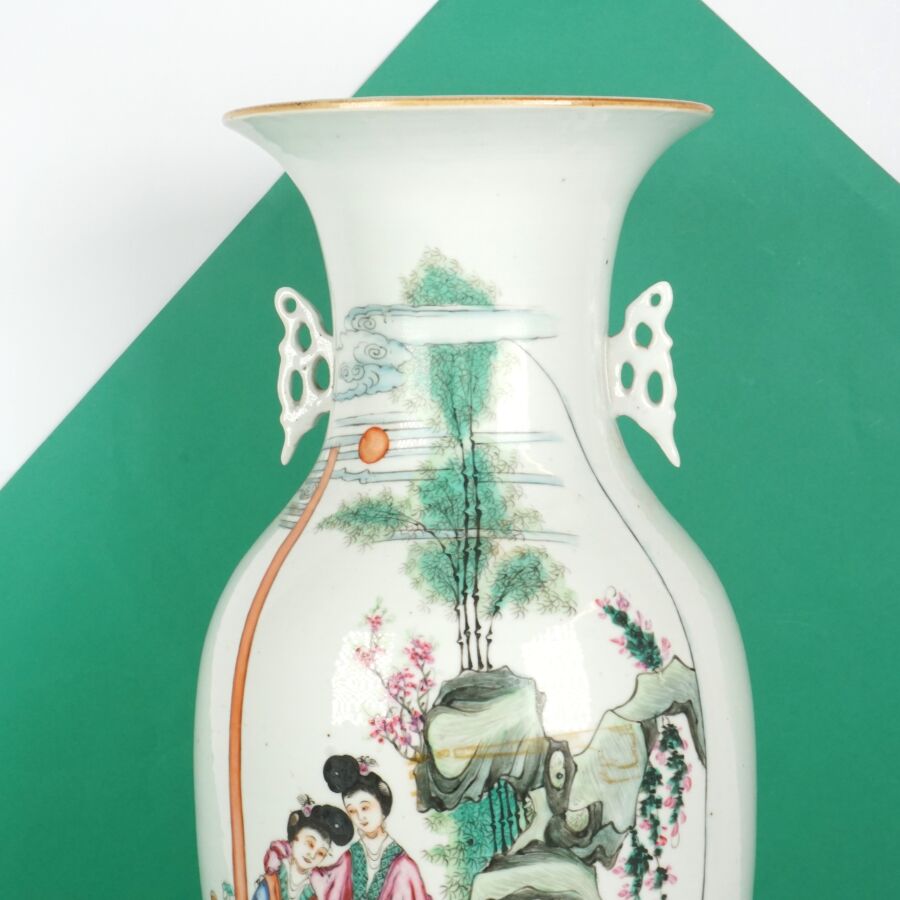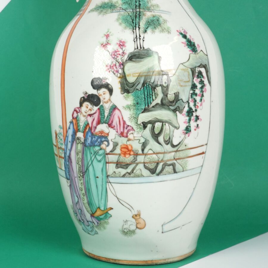 Vase de forme balustre, en porcelaine émaillée polychrome, à décor de deux courtisanes sur une terrasse, le fond arboré à motif de roches percées, Chine, 20ème siècle, H. 42.4 cm.