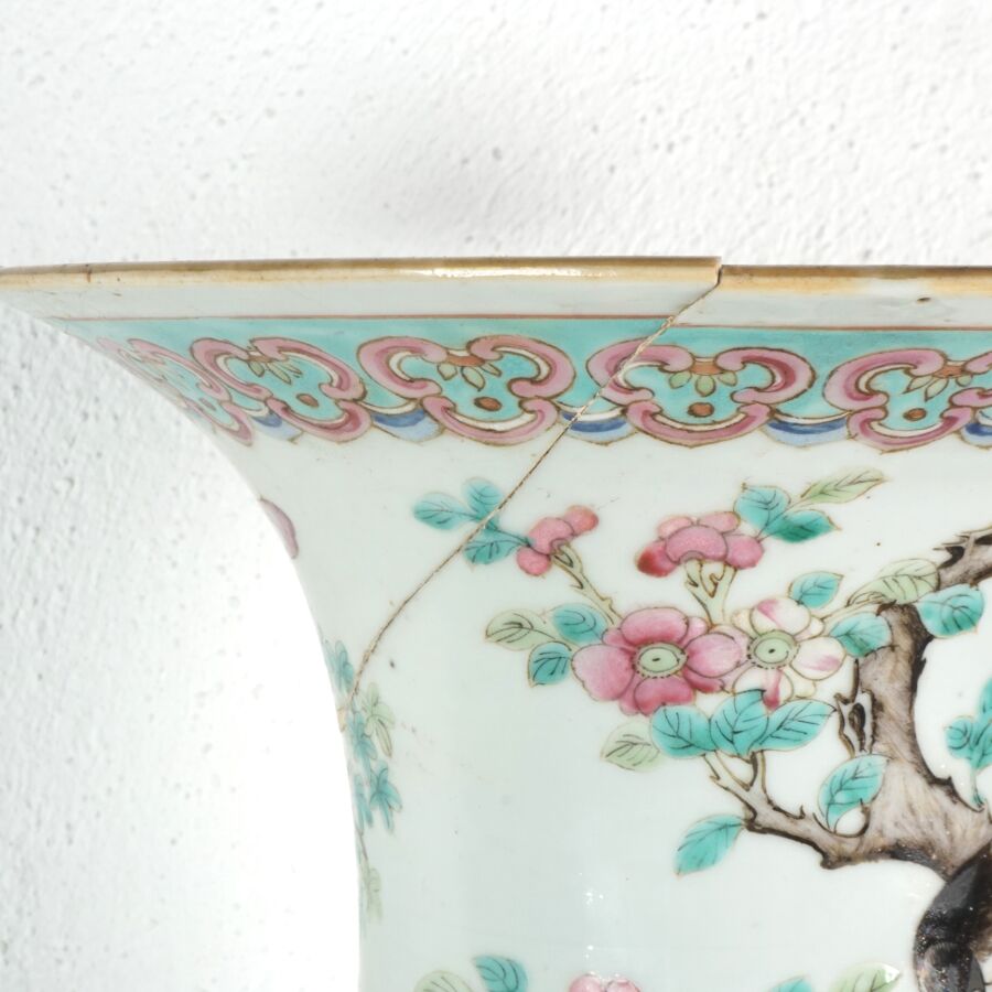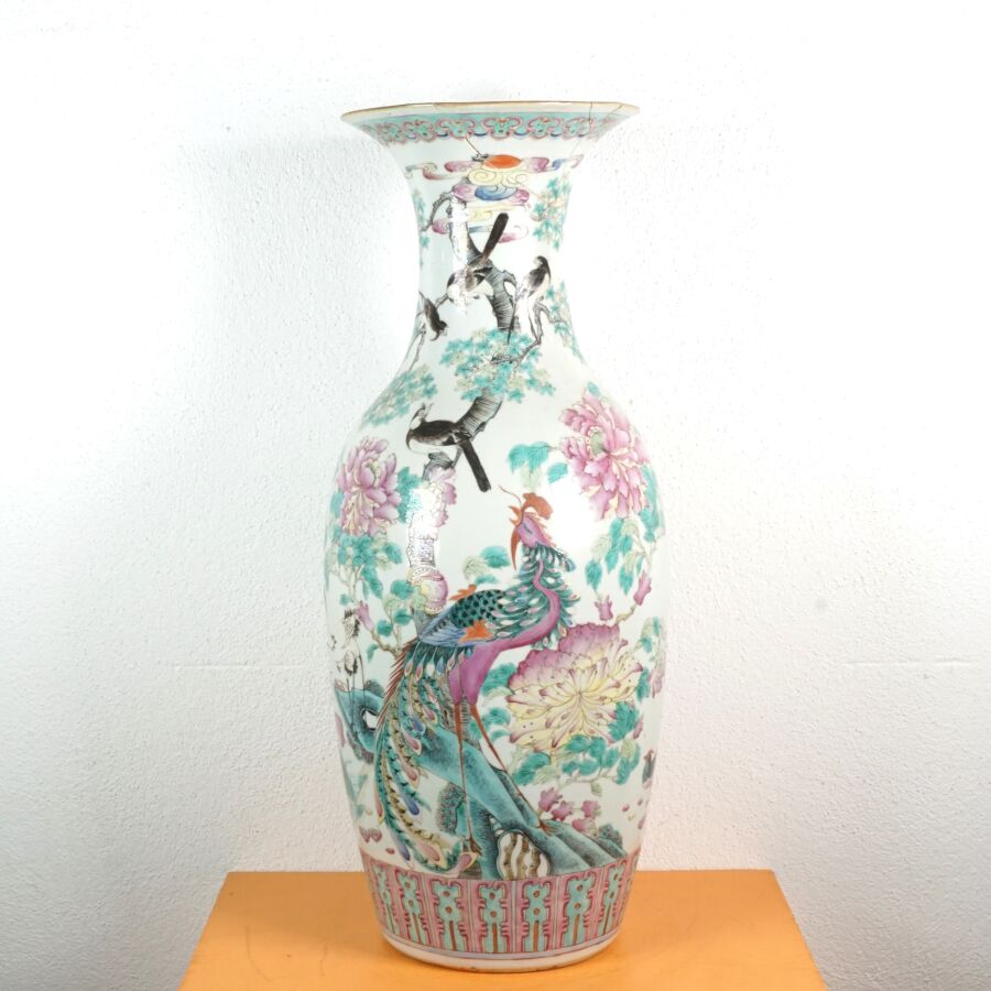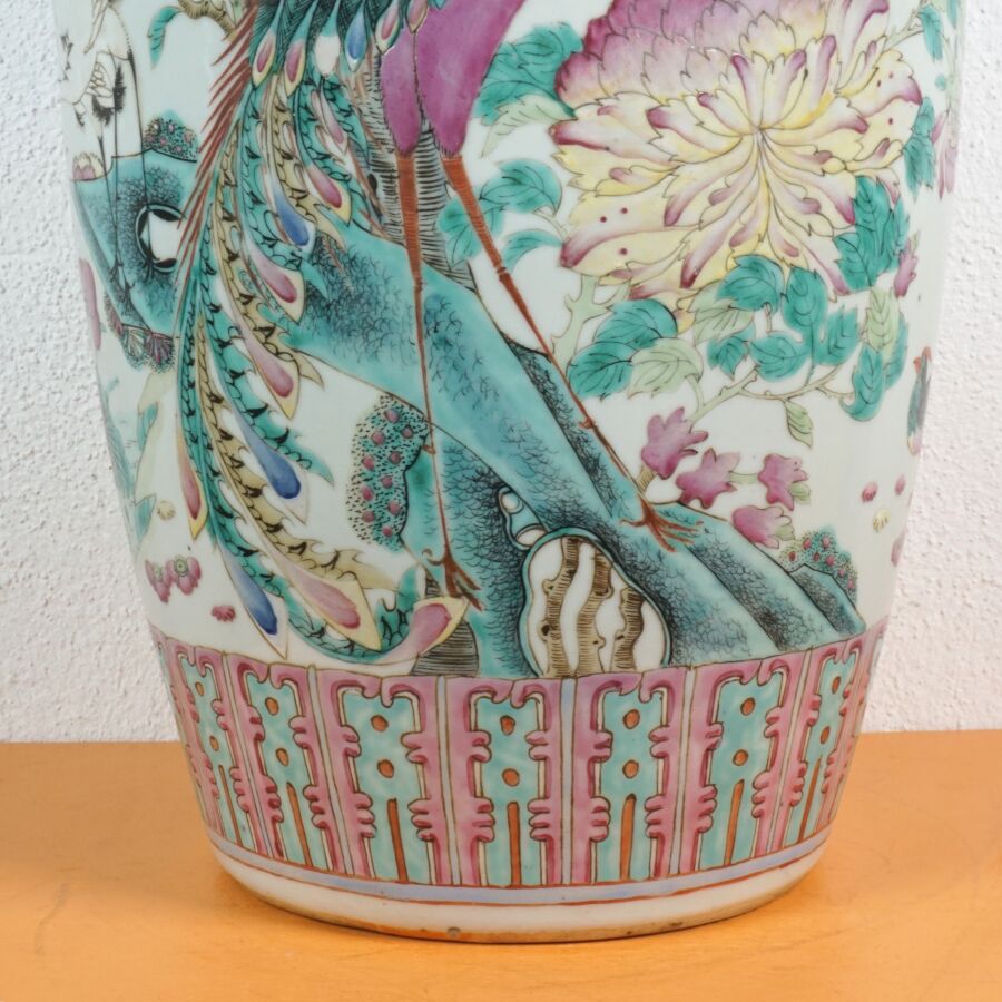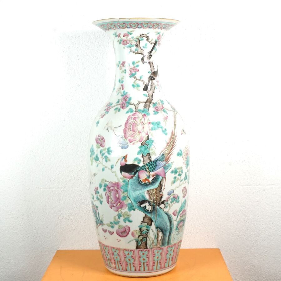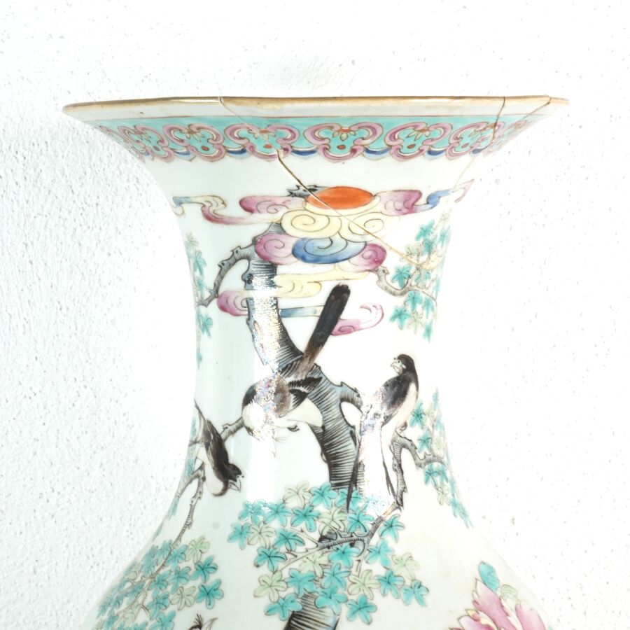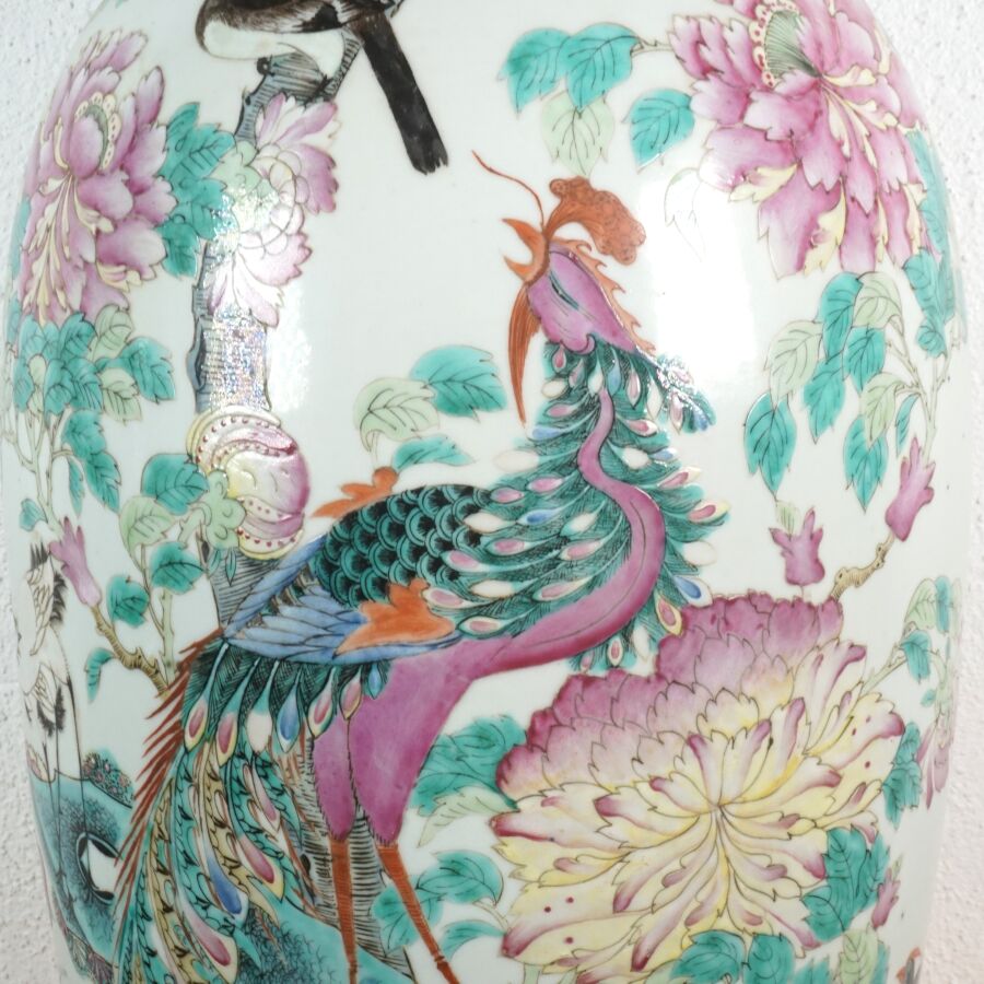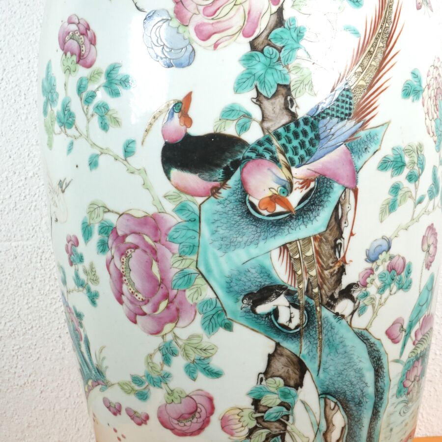Vase de forme balustre en porcelaine et émaux de la famille rose à décor d'oiseaux Paradis parmi feuillages et pivoiniers en fleurs, Chine, 19ème siècle, H. 61 cm (restaurations au col).