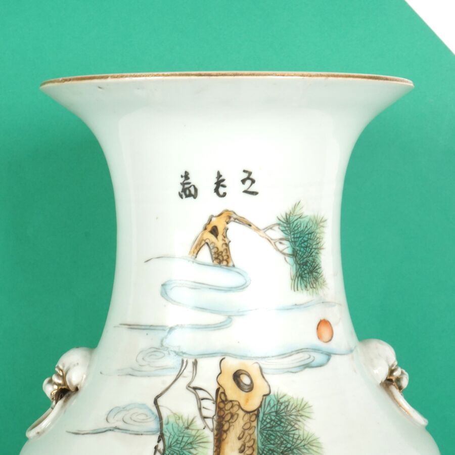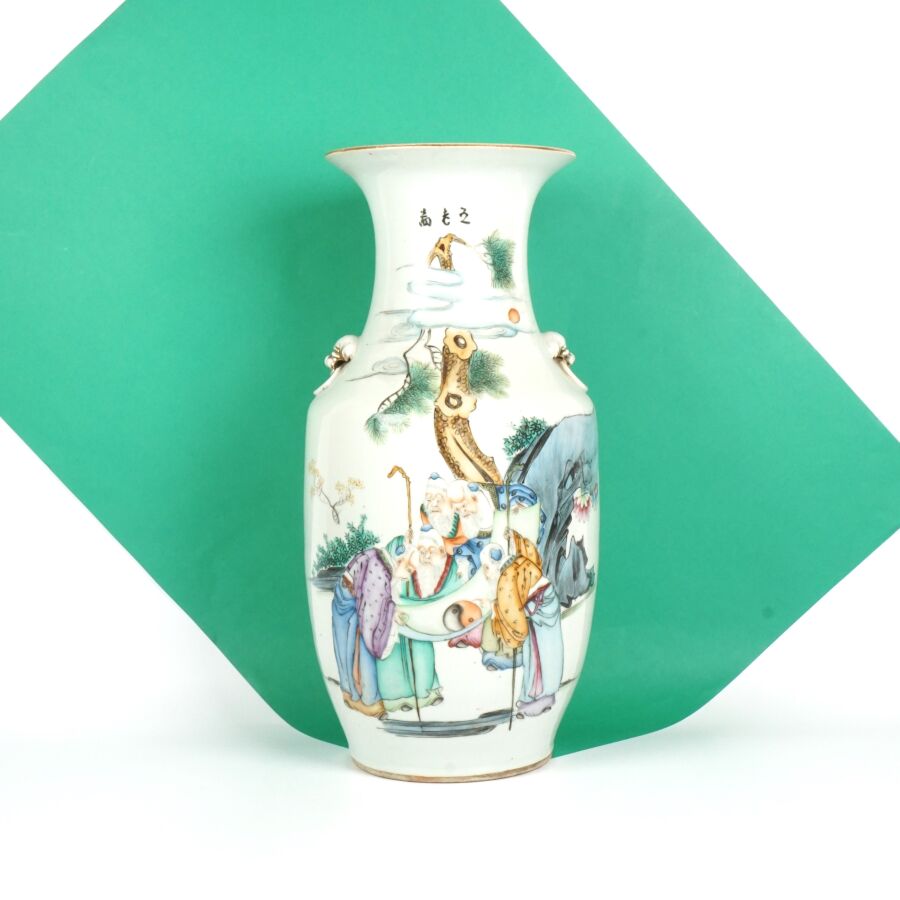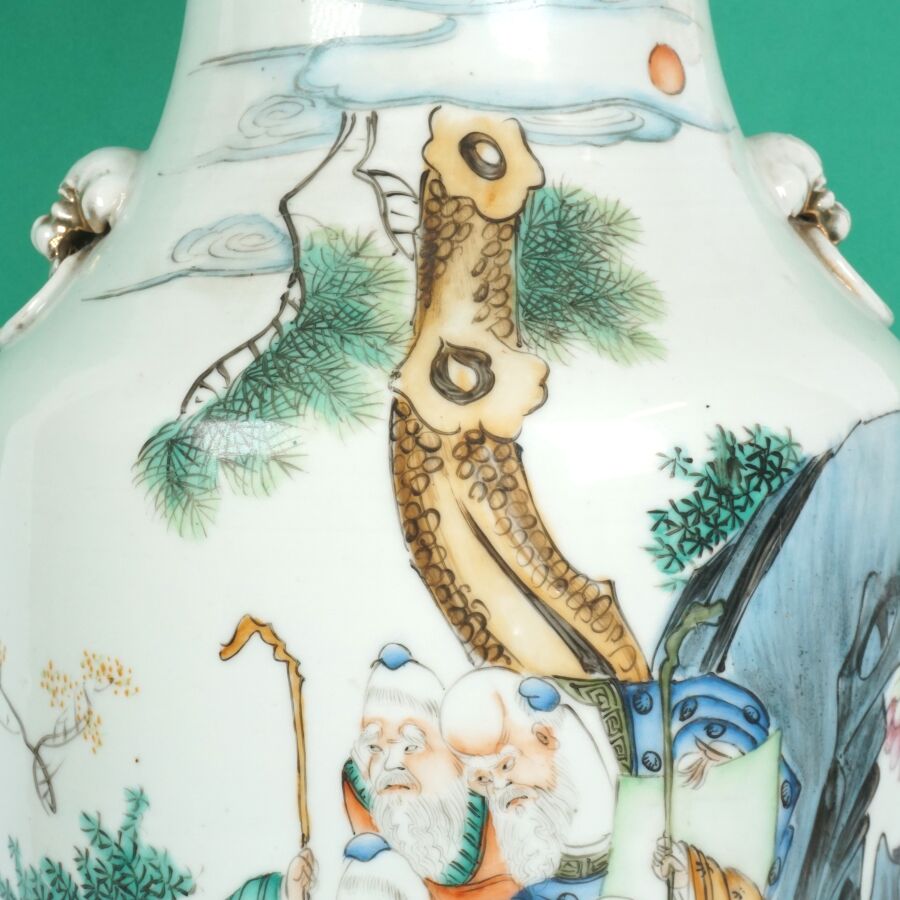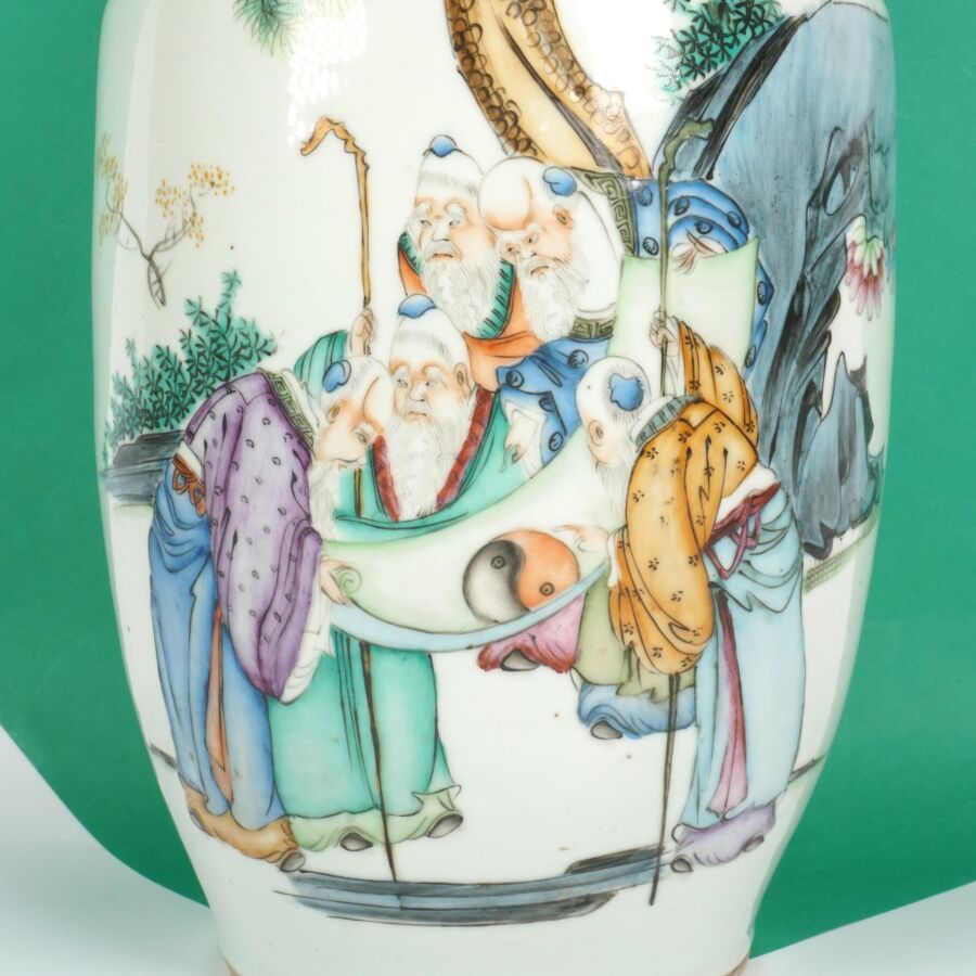 Vase de forme balustre en porcelaine et émaux de style famille rose à décor de lettrés déroulant un rouleau à motif du taiji sur une terrasse arborée près d'un pin de longévité, motifs calligraphiés au revers, Chine, circa 1920, H. 42 cm.