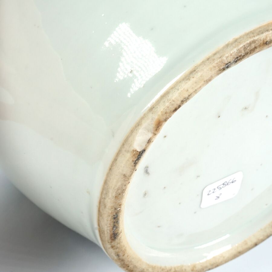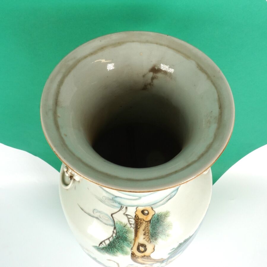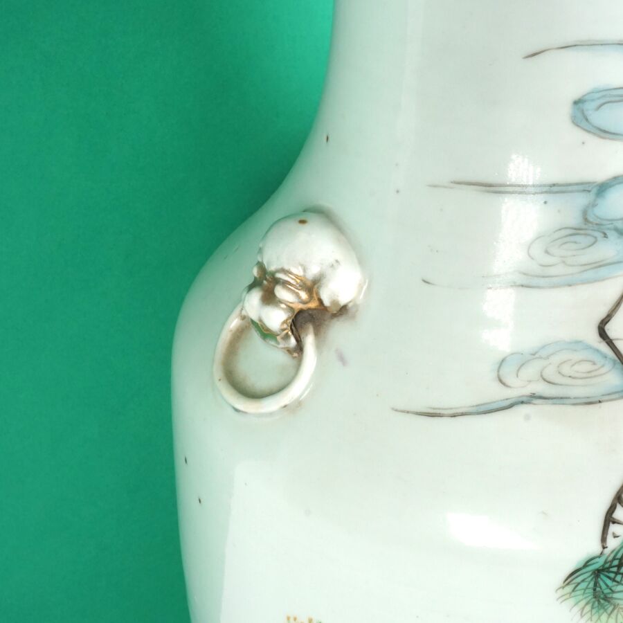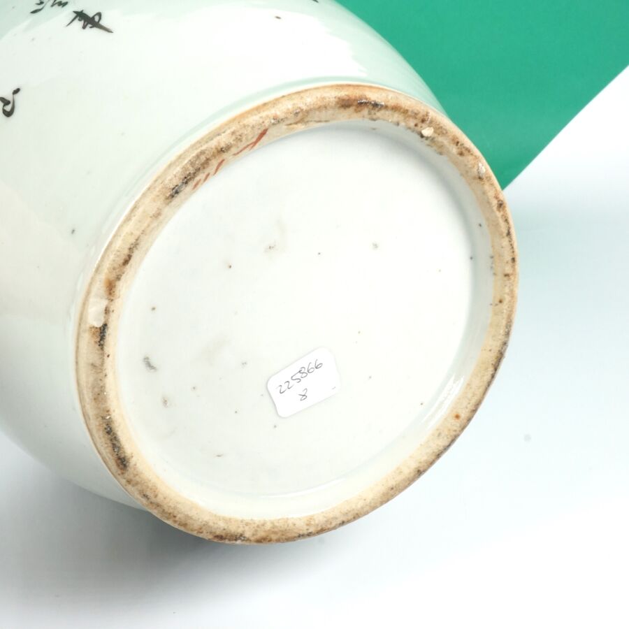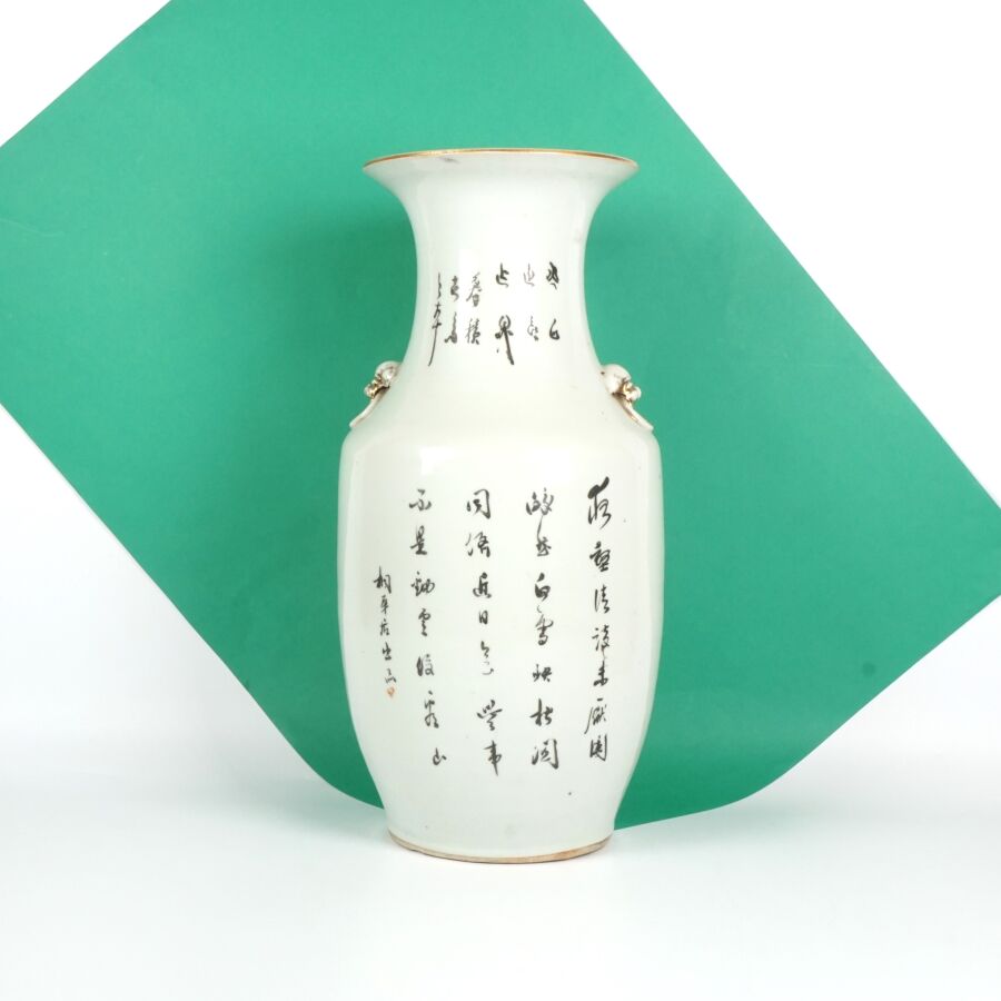 Vase de forme balustre en porcelaine et émaux de style famille rose à décor de lettrés déroulant un rouleau à motif du taiji sur une terrasse arborée près d'un pin de longévité, motifs calligraphiés au revers, Chine, circa 1920, H. 42 cm.