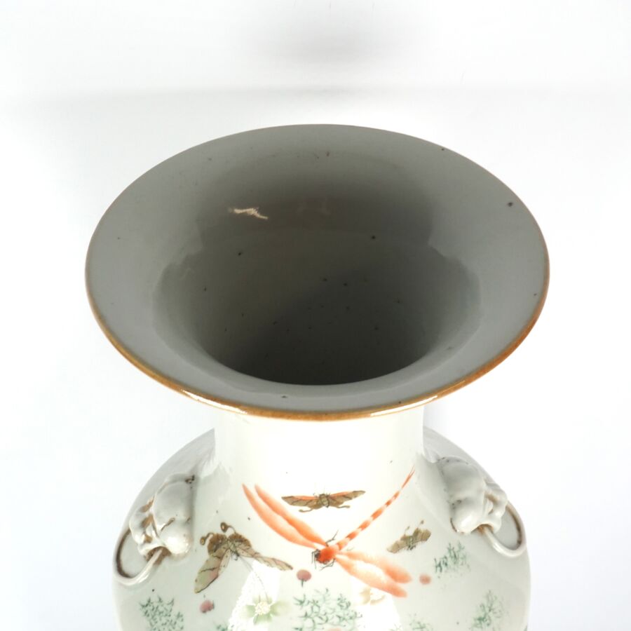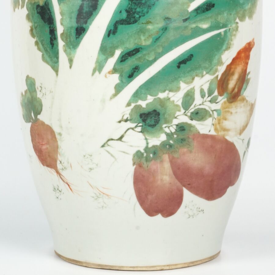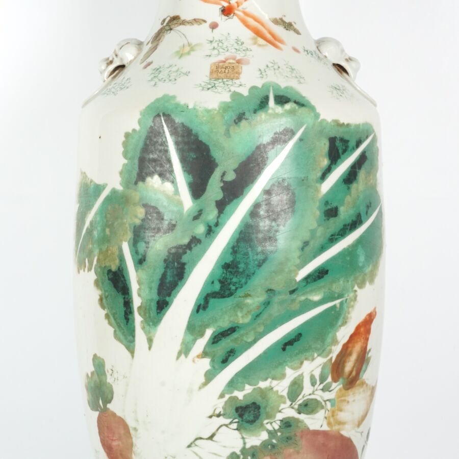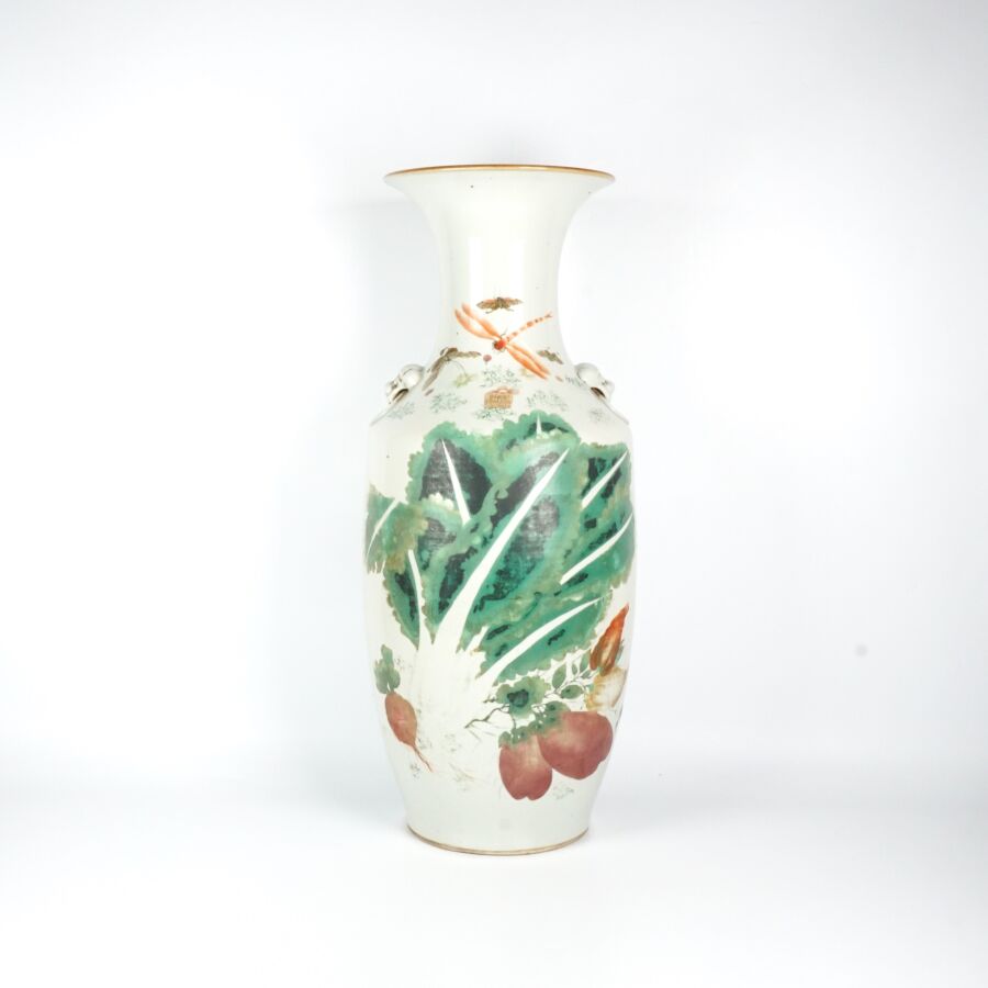 Vase de forme balustre, en porcelaine et émaux de style famille rose, à décor de fruits, légumes et insectes, des motifs calligraphiés complètent l'ornementation, Chine, 19ème siècle, H. 57 cm.
