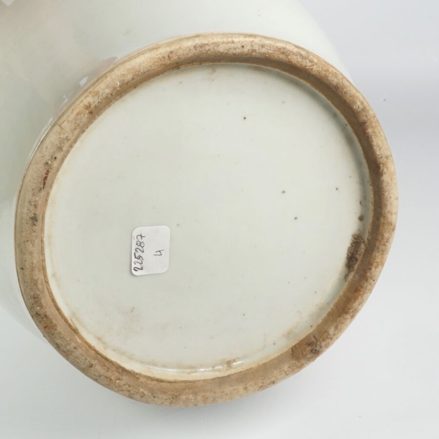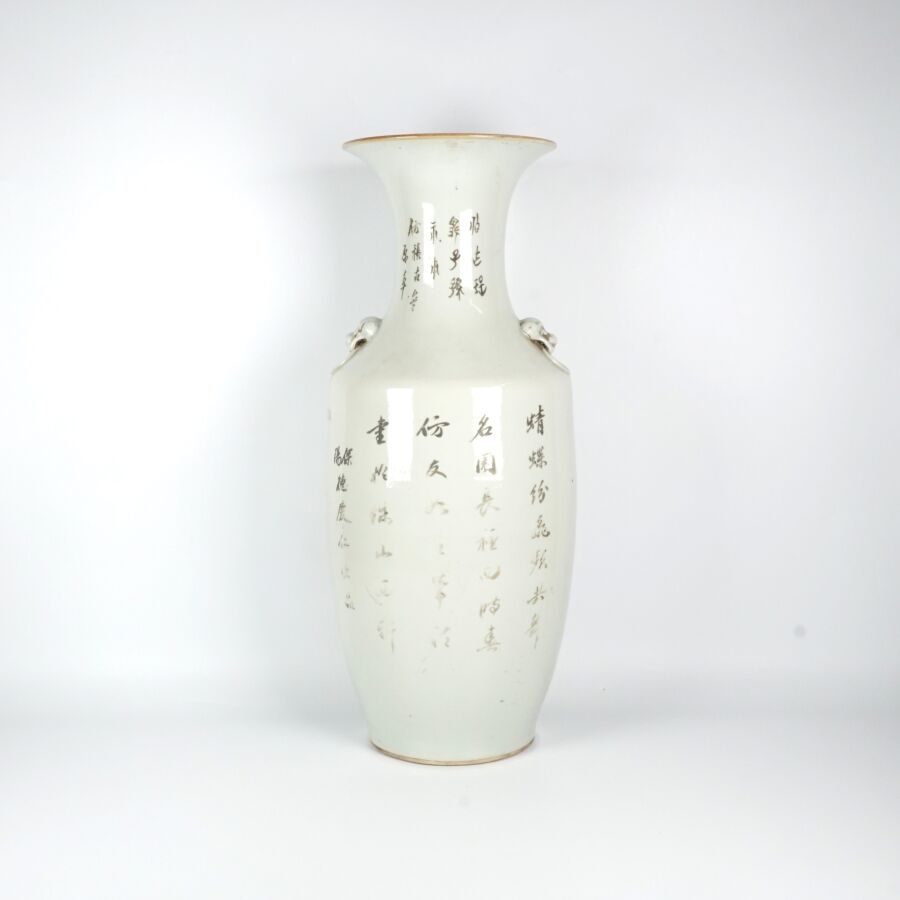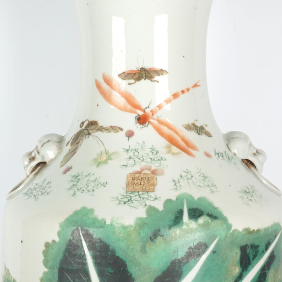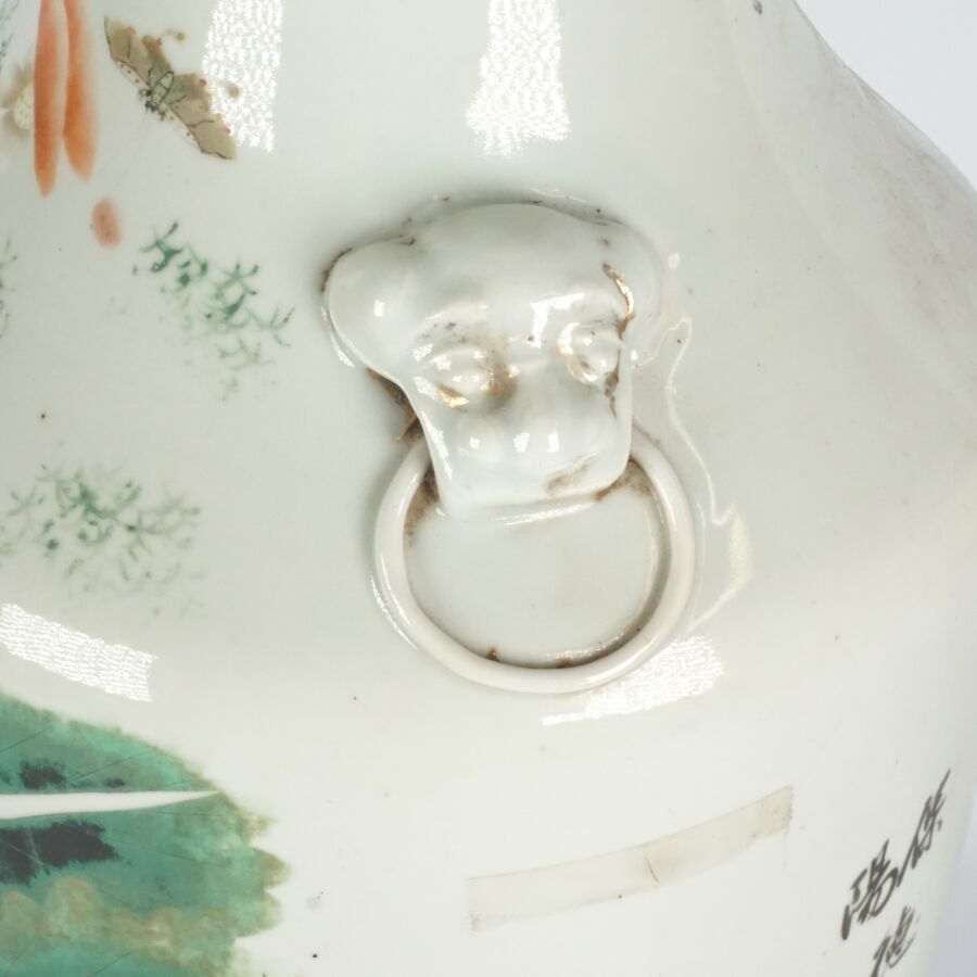 Vase de forme balustre, en porcelaine et émaux de style famille rose, à décor de fruits, légumes et insectes, des motifs calligraphiés complètent l'ornementation, Chine, 19ème siècle, H. 57 cm.
