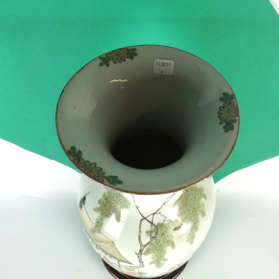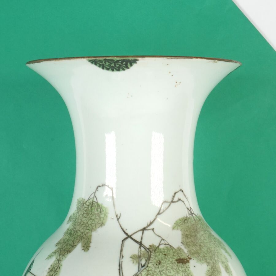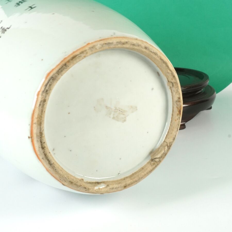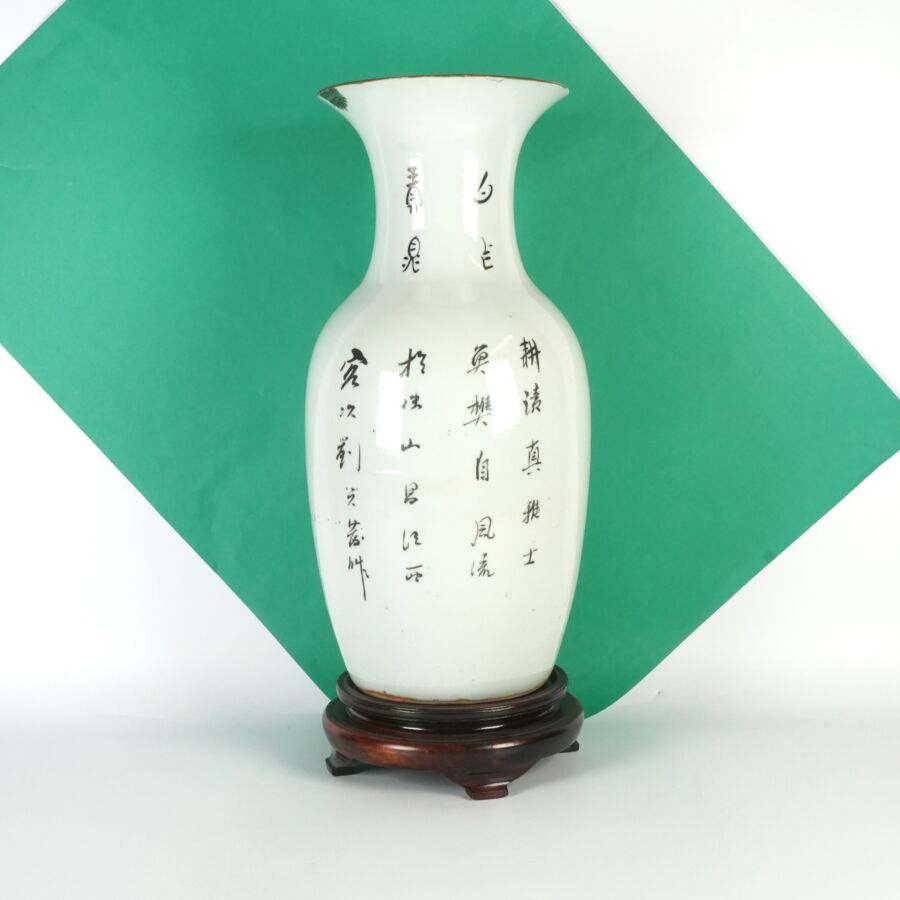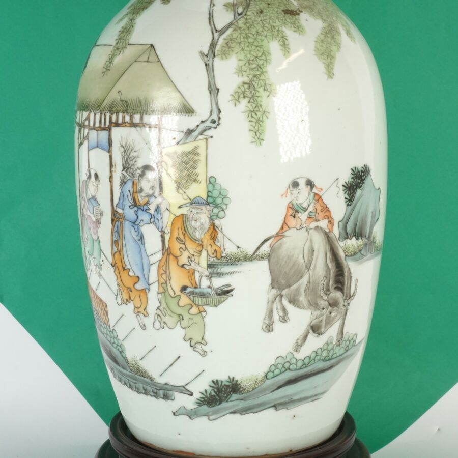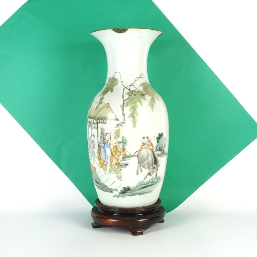 Vase de forme balustre en porcelaine et émaux polychromes, à décor d'un jeune bouvier sur le dos de son buffle et paysans aux abords d'une maison. Des calligraphies complètent l'ornementation. Sur un socle en bois, Chine, circa 1900, H. Hors socle : 41.9 cm.