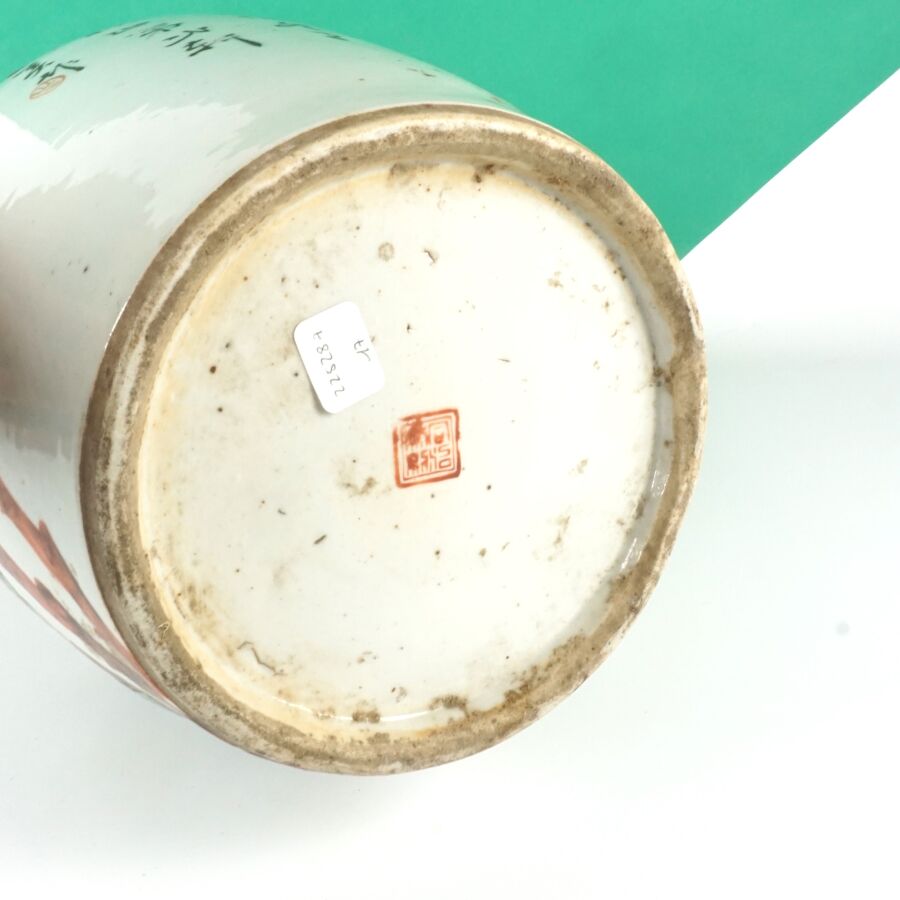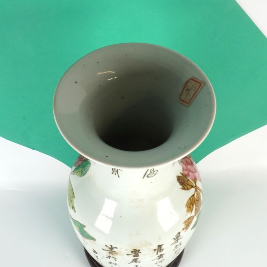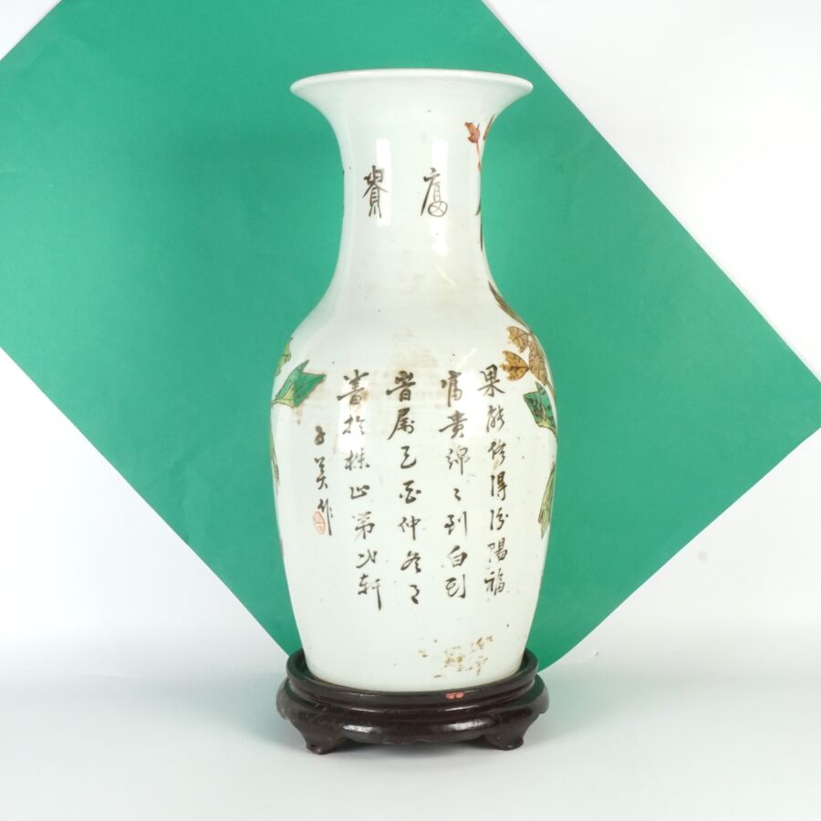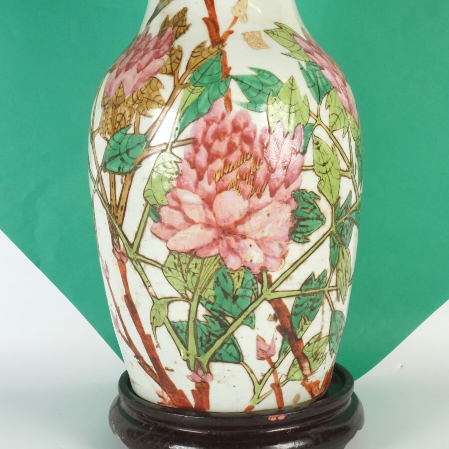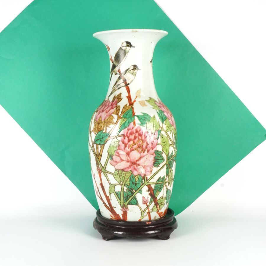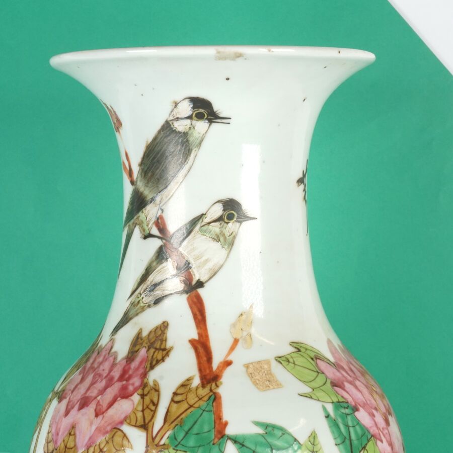 Vase de forme balustre en porcelaine et émaux polychromes à décor d'oiseaux reposant sur une branche de pivoinier en fleurs et motifs calligraphiés, Chine, circa 1900, H. 43 cm (petits défauts de cuisson).