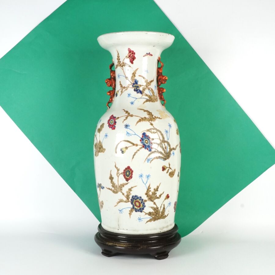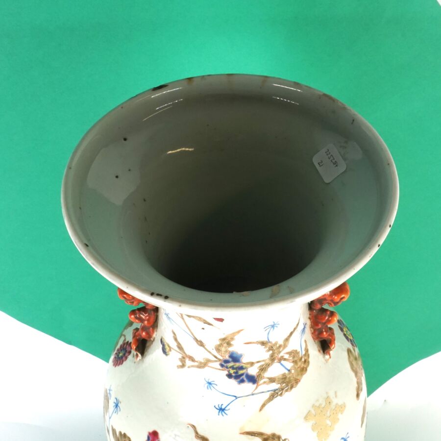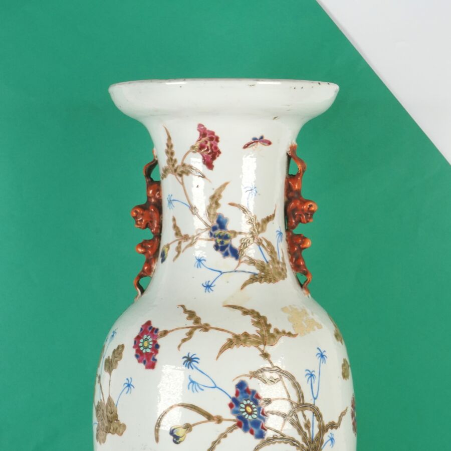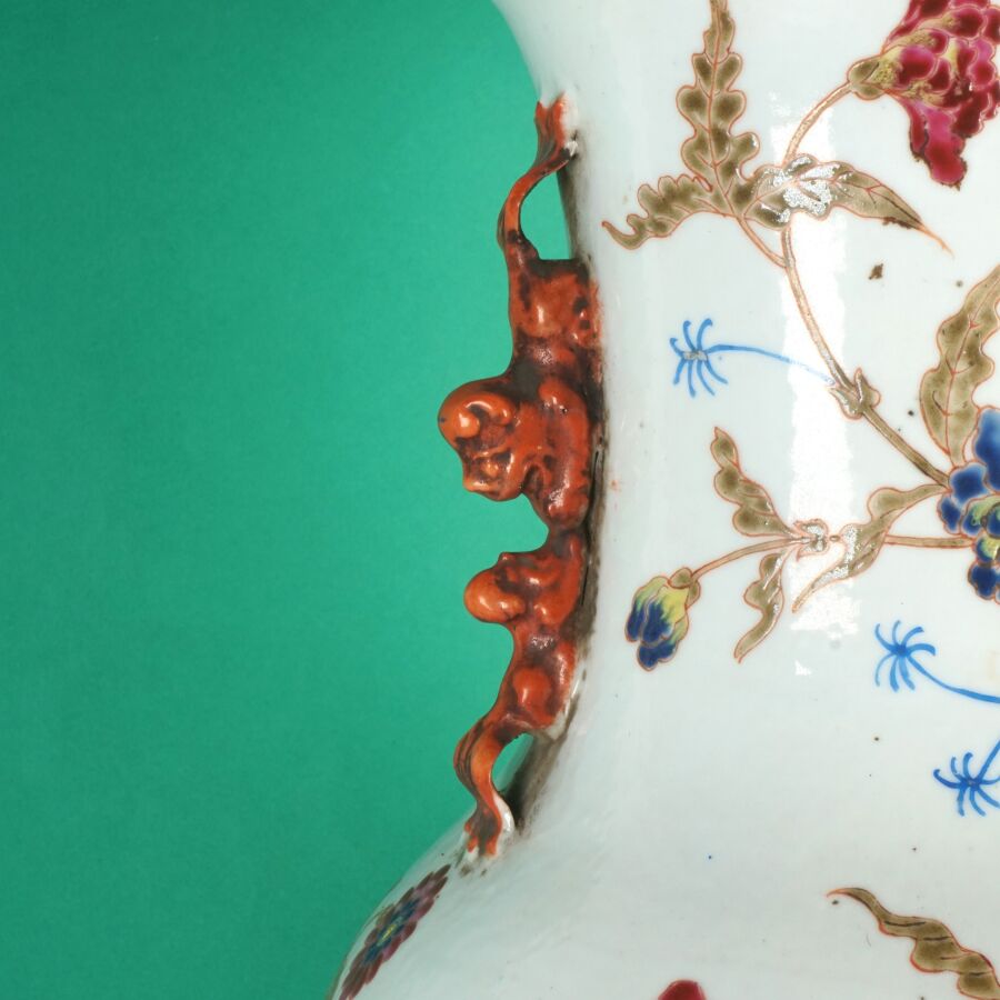 Vase de forme balustre en porcelaine et émaux polychromes à décor de pivoines et fleurs de chrysanthèmes, deux lions bouddhiques en relief formant anses, Chine, fin du 19ème - début du 20ème siècle, H. 45.5 cm (coulures, restaurations de la base, égrenures au col et défaut de cuisson).
