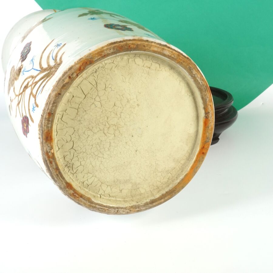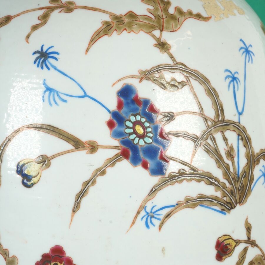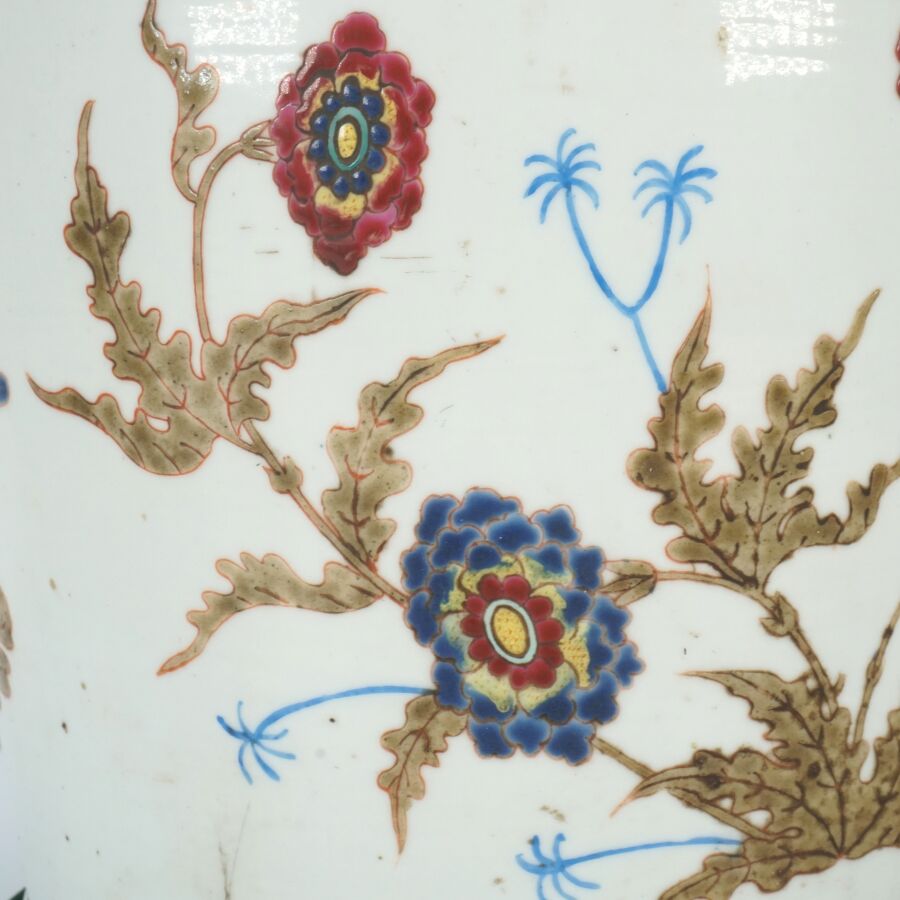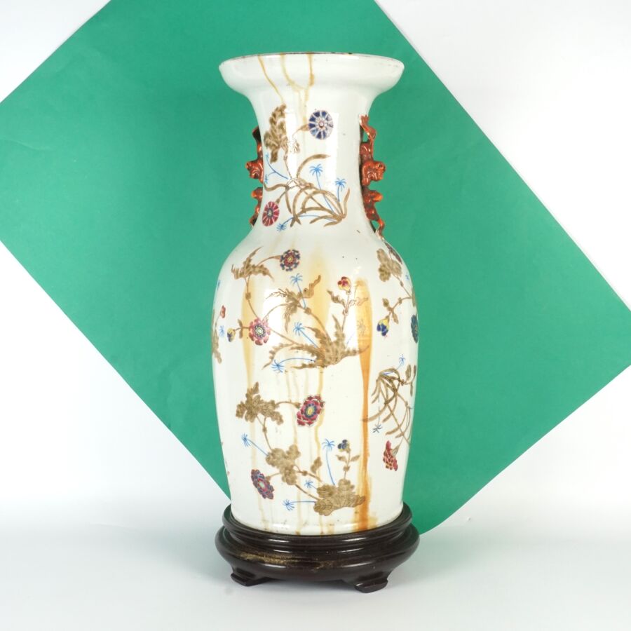 Vase de forme balustre en porcelaine et émaux polychromes à décor de pivoines et fleurs de chrysanthèmes, deux lions bouddhiques en relief formant anses, Chine, fin du 19ème - début du 20ème siècle, H. 45.5 cm (coulures, restaurations de la base, égrenures au col et défaut de cuisson).