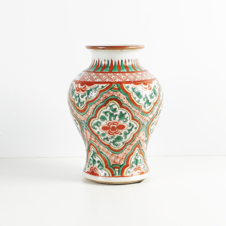 Vase de forme balustre, porcelaine et émaux de la famille verte à décor de fleurs stylisées dans des réserves polylobées, Chine, 19ème siècle, marque apocryphe Ming dessous, H. 18 cm (petite égrenure à la base).