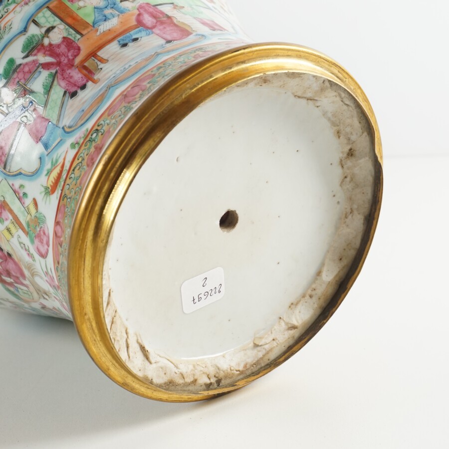 Vase de forme balustre, porcelaine et émaux de style famille rose à décor de personnages évoluant dans un palais, anciennement monté en lampe, Chine, Canton, début du 20ème siècle, H. 44 cm (fond percé).