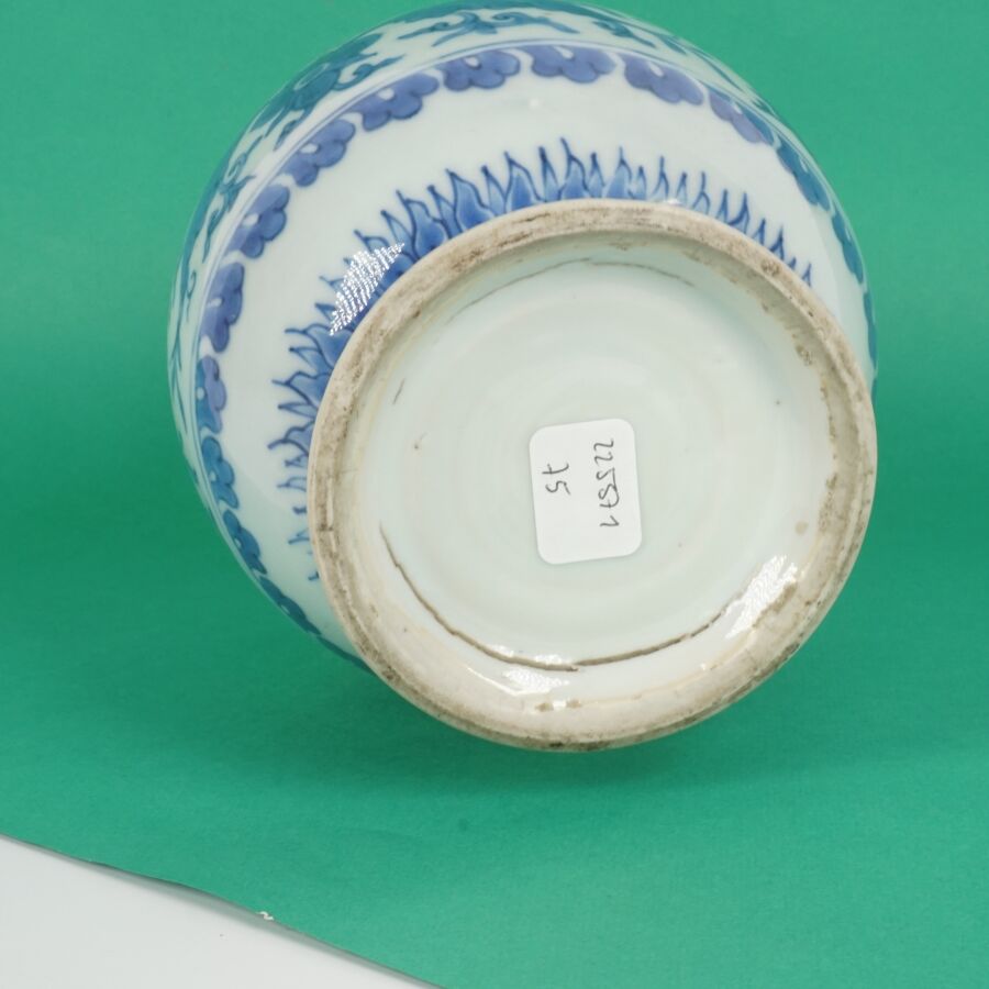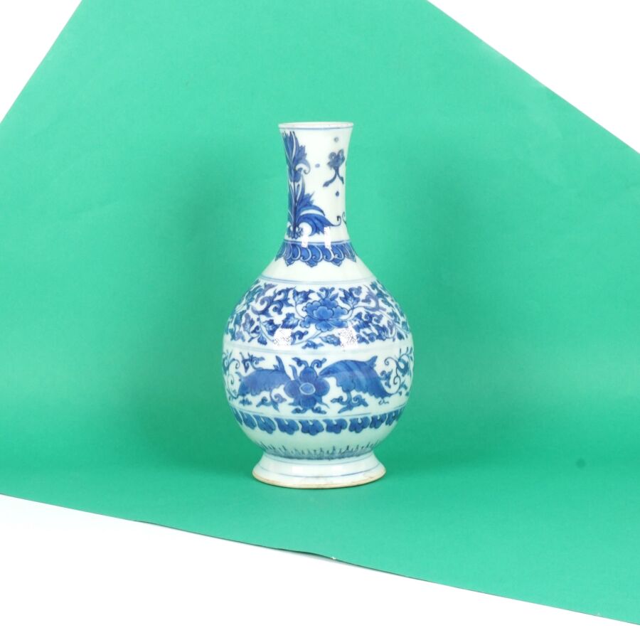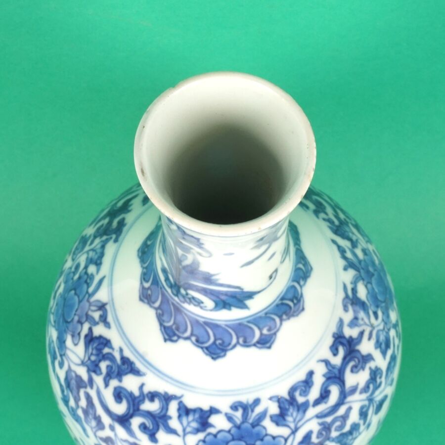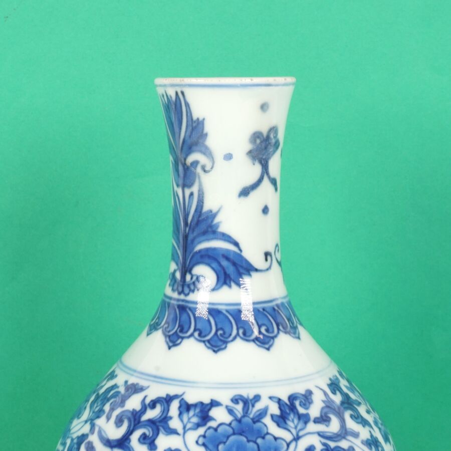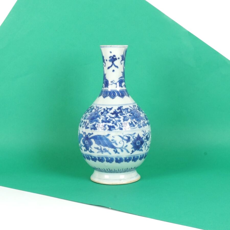 Vase de forme bouteille sur piédouche, en porcelaine blanche, à décor en bleu sous couverte à décor de fleurs et rinceaux feuillagés, Chine, époque Qing, fin du 17ème - début du 18ème siècle, H. 22.5 cm. (restauration au col).