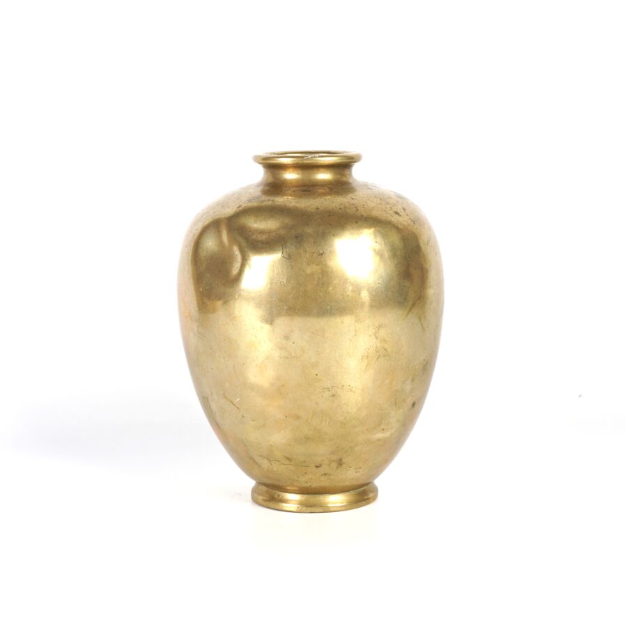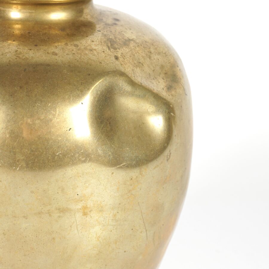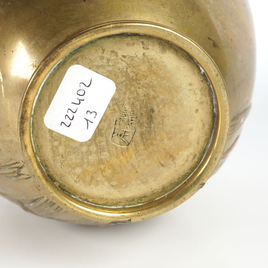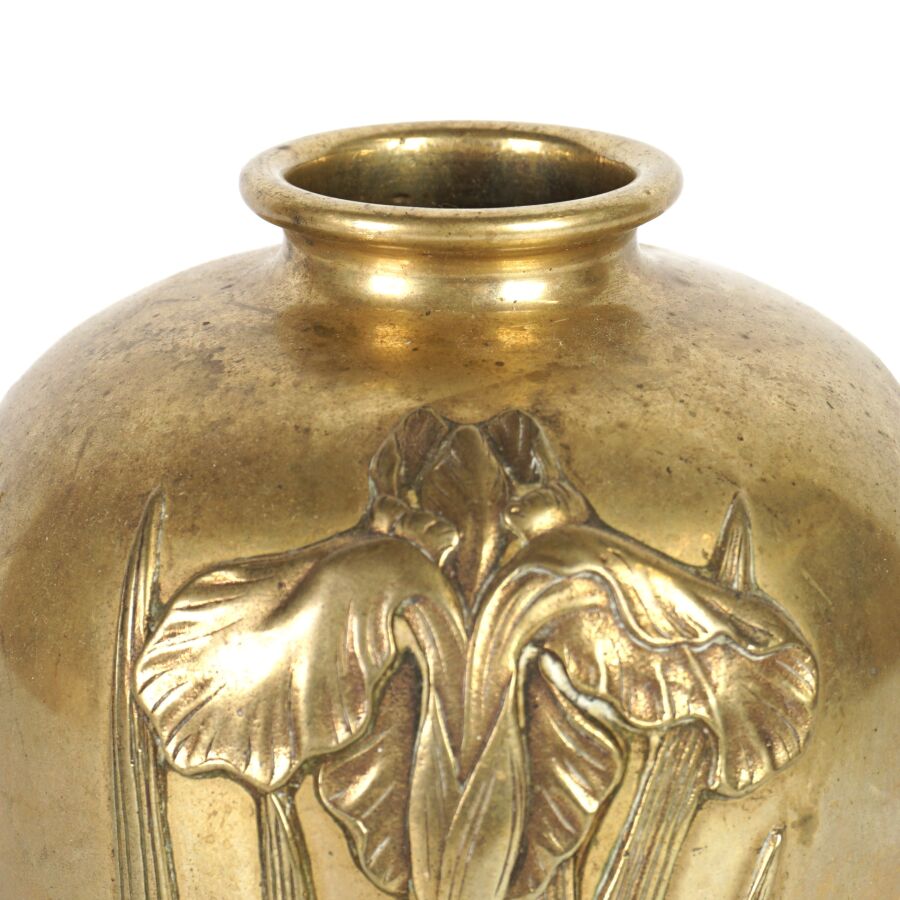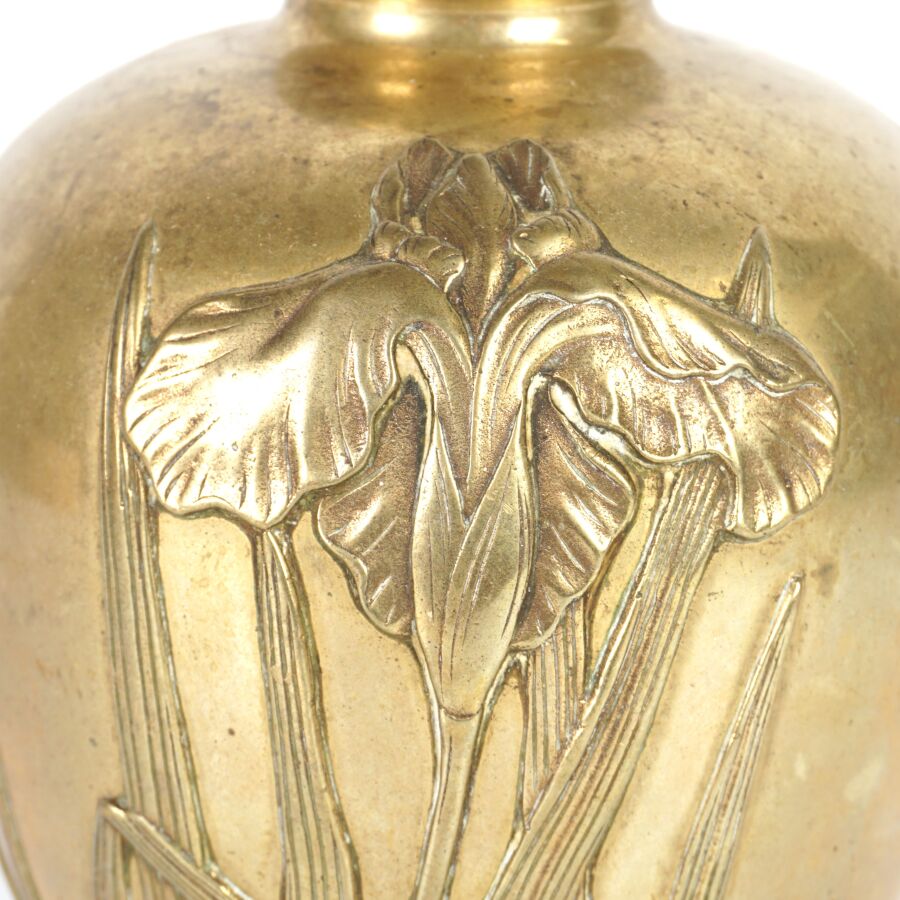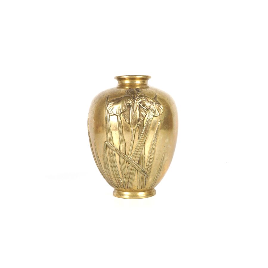 Vase de forme ovoïde en cuivre doré à décor d'Iris, marque Yoshimasa (?) au revers, Japon, début du 20ème siècle, H. 18 cm (choc).