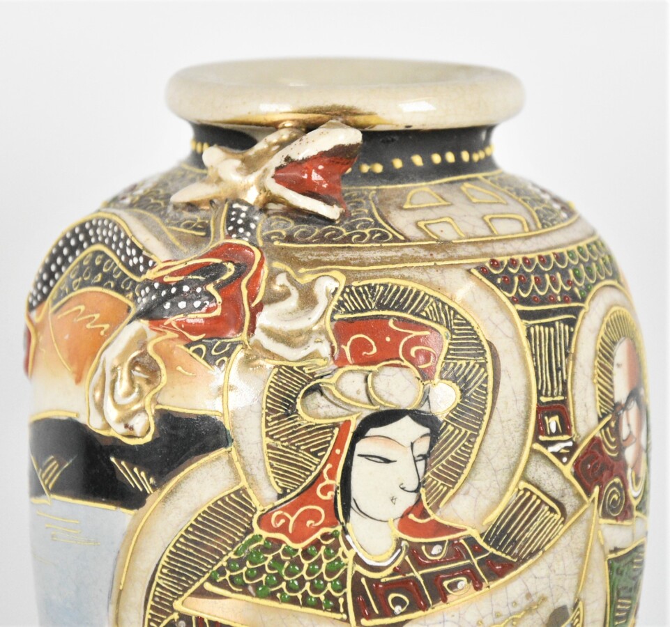 Vase de forme ovoïde en faïence émaillée polychrome de Satsuma, à décor d'une scène de bataille, deux dragons en relief formant anse, 20e siècle, H. 18.5 cm.