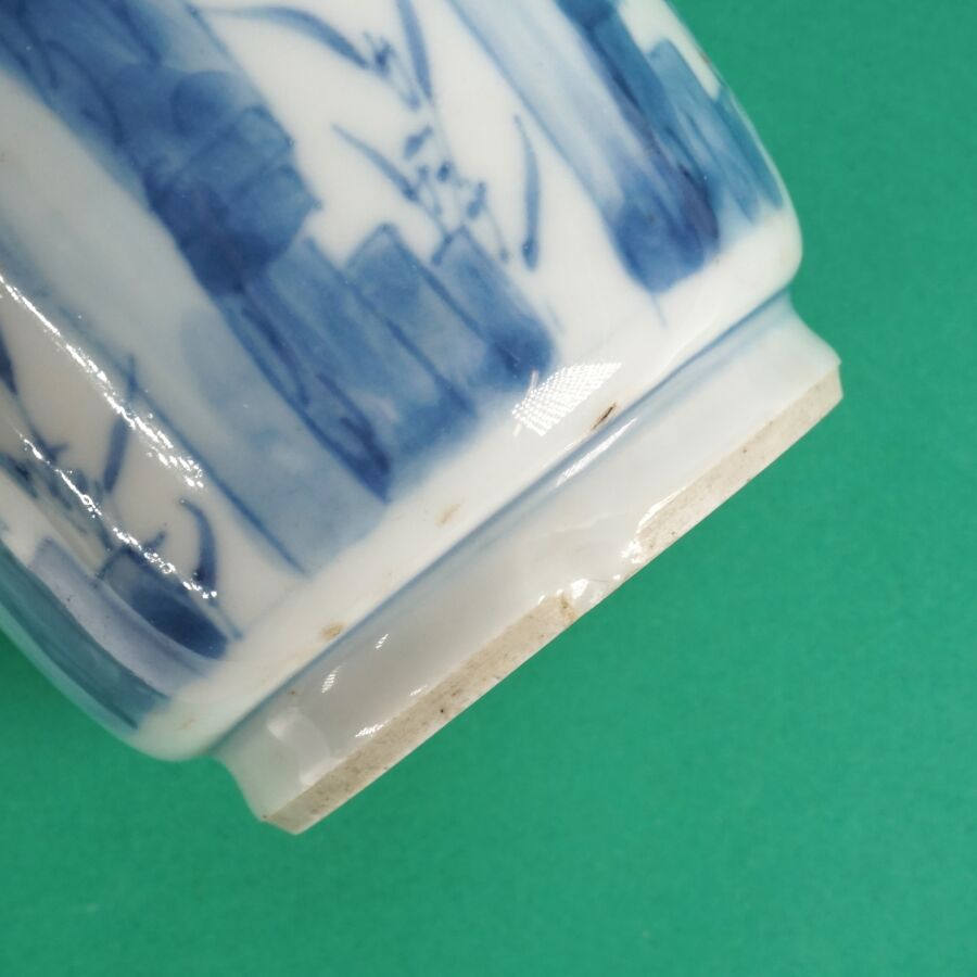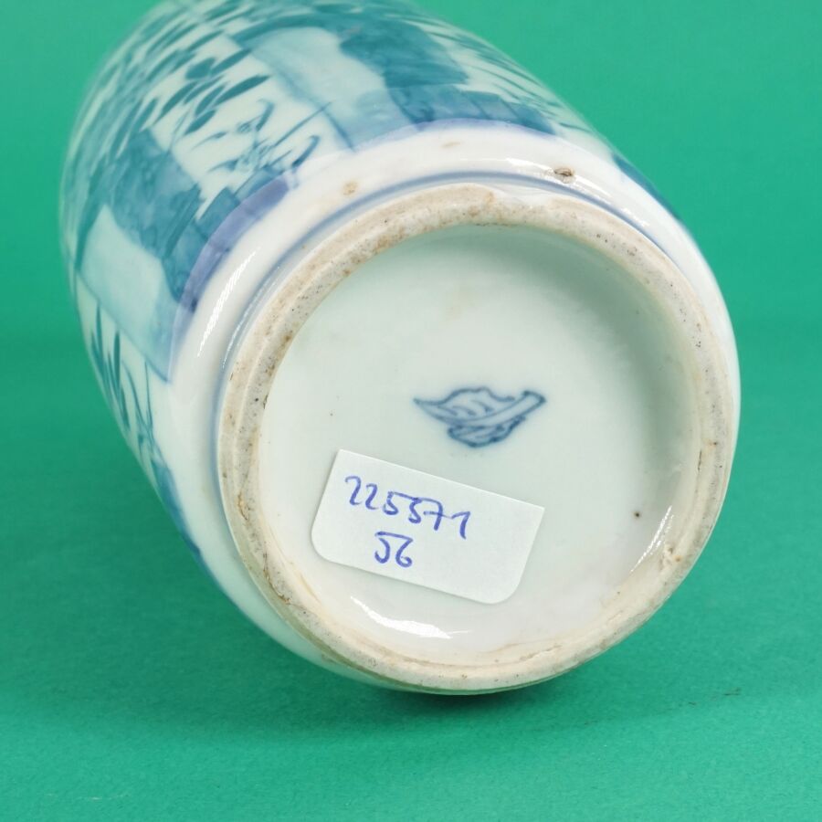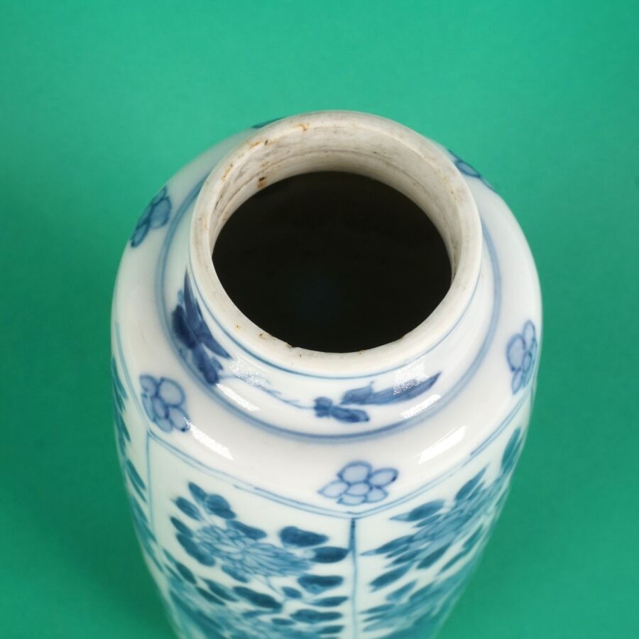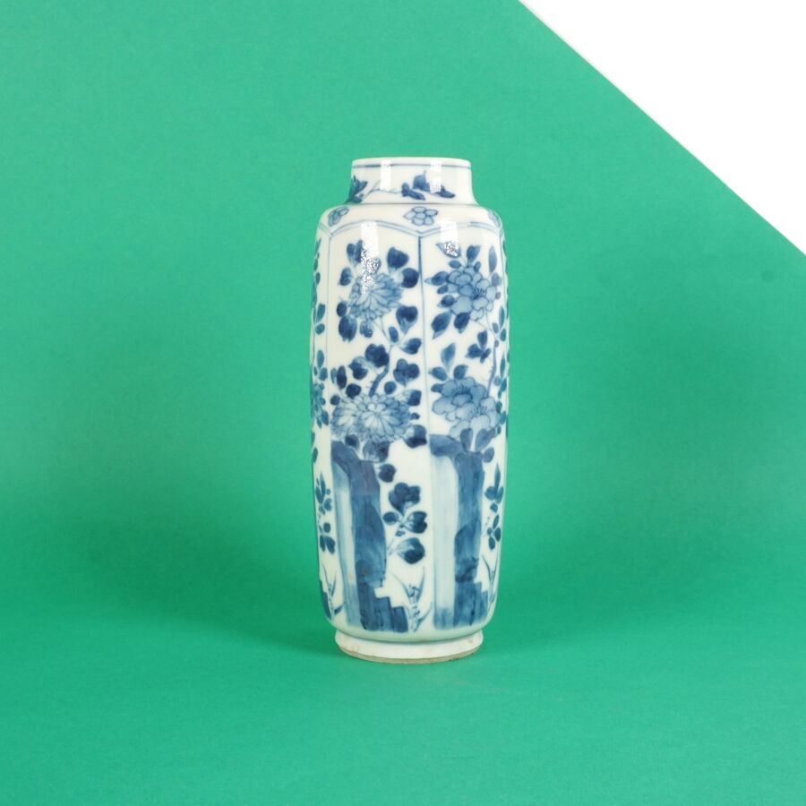 Vase en porcelaine émaillée blanche, à décor en en bleu sous couverte, d'arbustes en fleurs, marque à la feuille au revers, Chine, époque Kangxi (1661-1722), H. 16,5 cm (léger éclat sur le talon, egrenure au col).