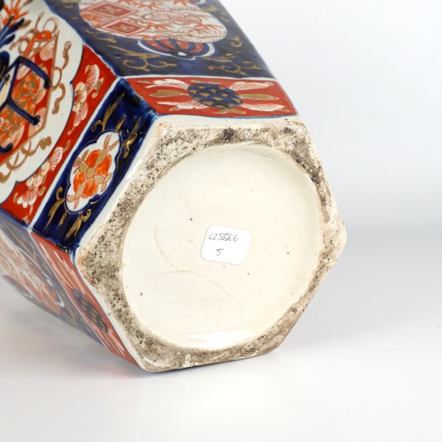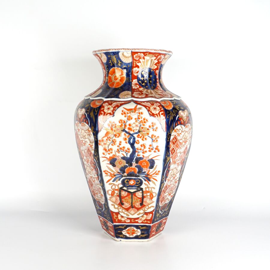 Vase en porcelaine émaillée dite Imari à décor d'arbres en fleurs et d'objets mobilier, Japon, début du 20ème siècle, H. 39.5 cm (petit fêle sous la base).