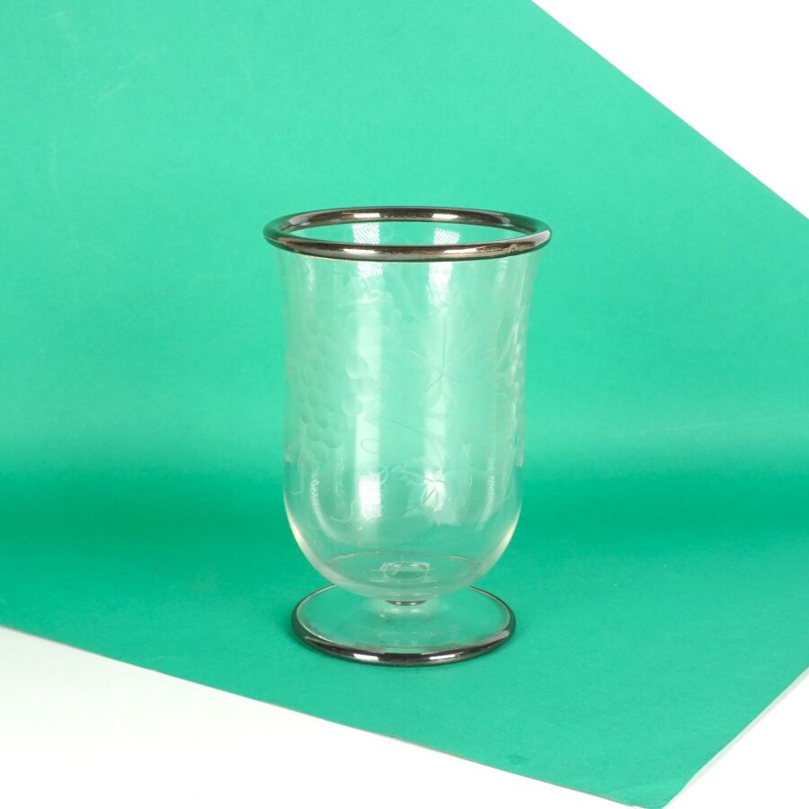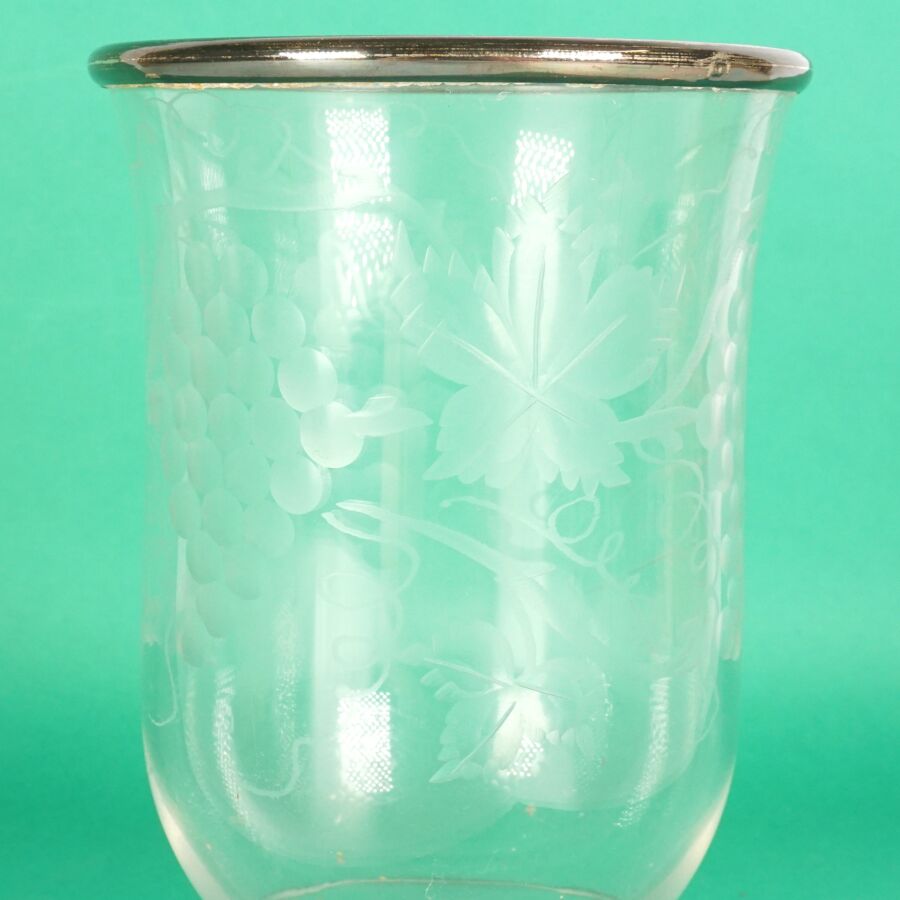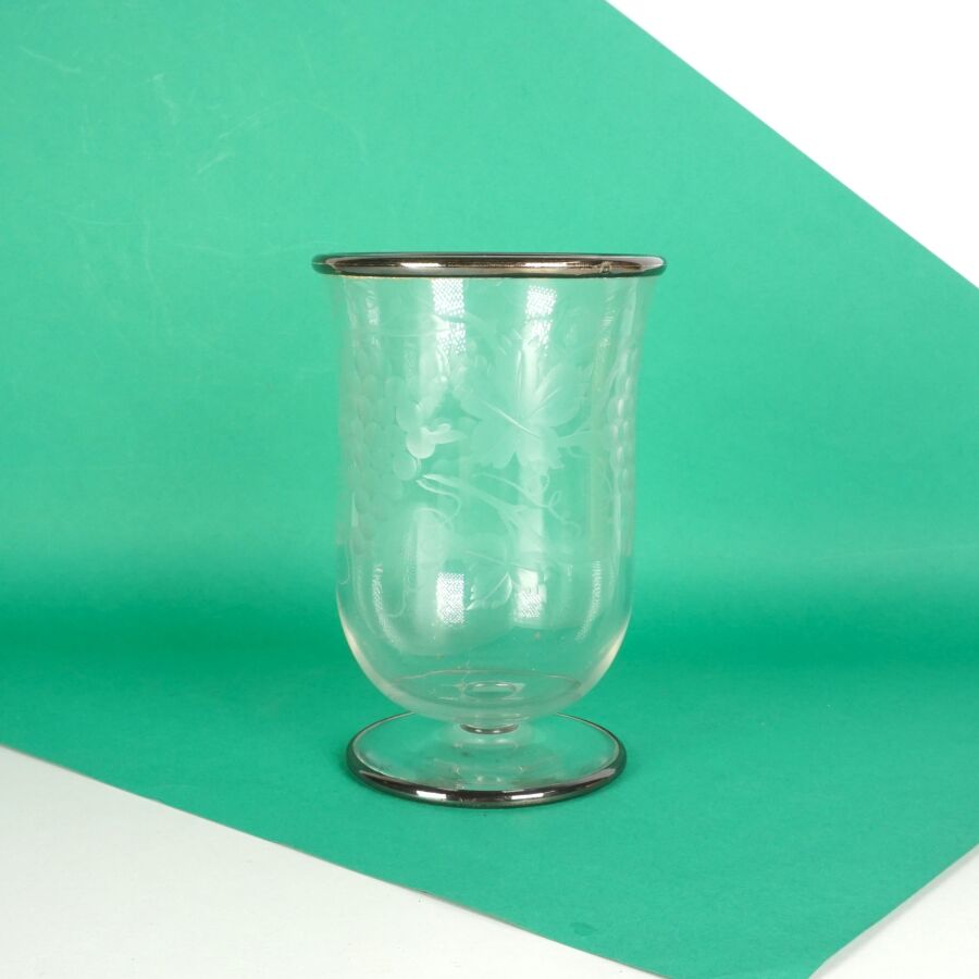Vase en verre gravé à décor de ceps de vigne, sur léger piédouche, cerclage au col et à la base en argent, poinçon Minerve 1er titre, H. 17 cm.