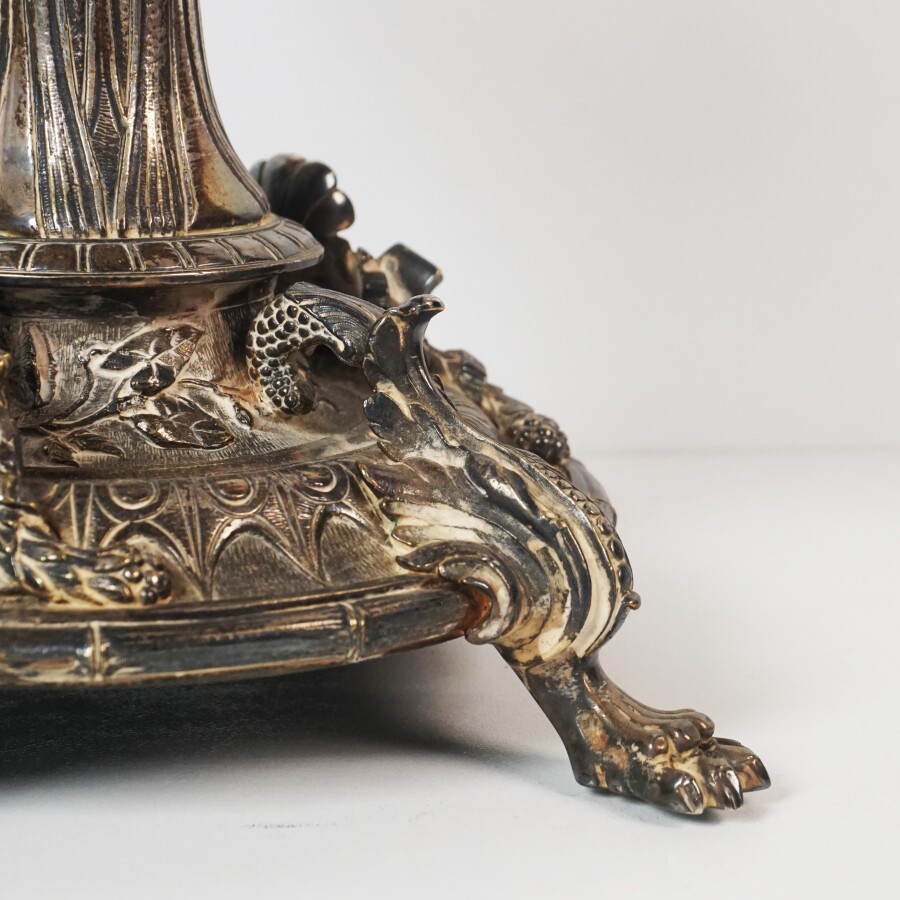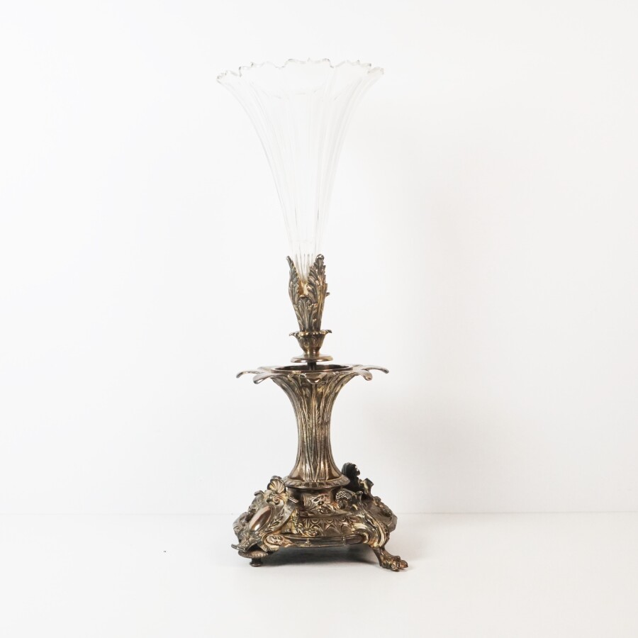 Vase en verre taillé et en métal argenté, le piètement à riche décor rocaille, dans le goût du 17ème siècle, H. 45 cm (manque, usures).
