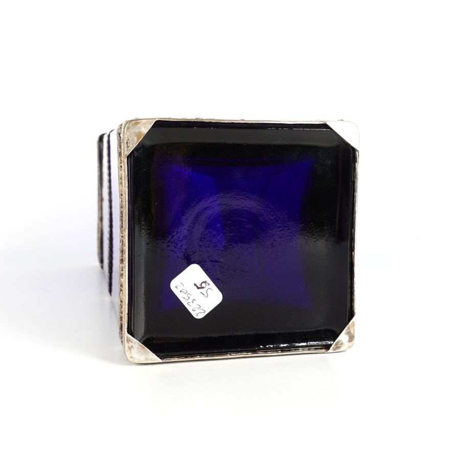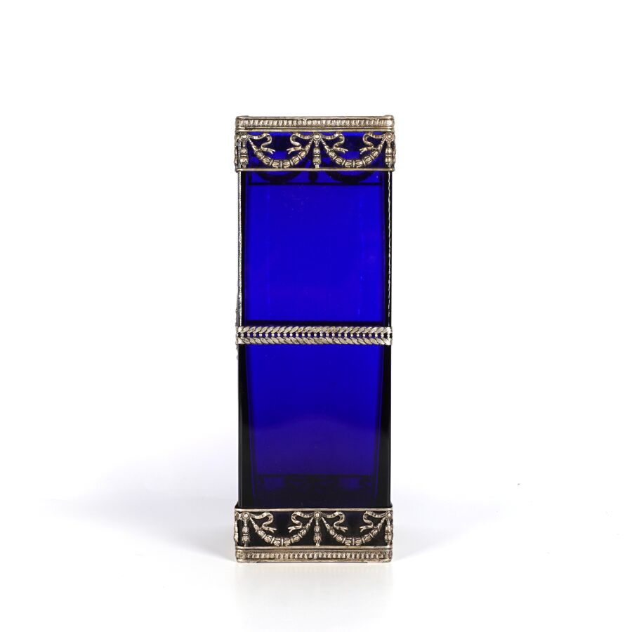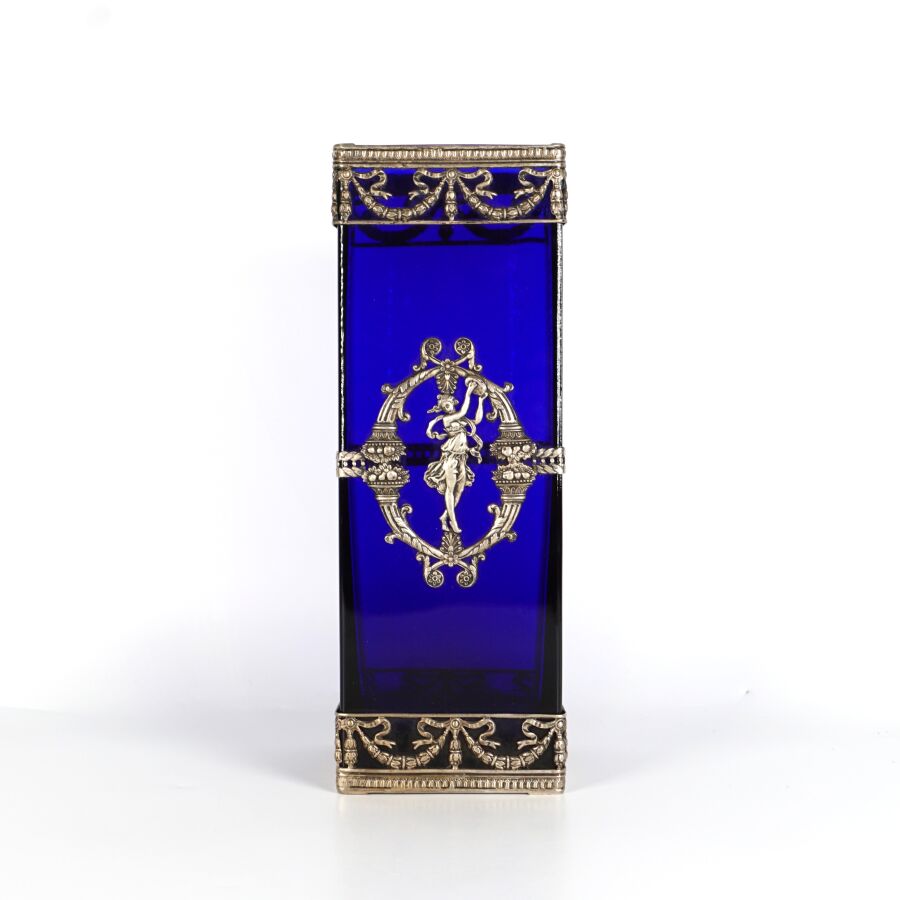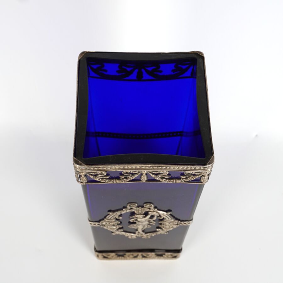 Vase en verre teinté bleu de forme carrée, garniture en métal argenté, à décor d'une joueuse de tambourin dans un médaillon, accosté de quatre cornes d'abondance, de style Louis XVI, circa 1900, H. 30.5 cm.