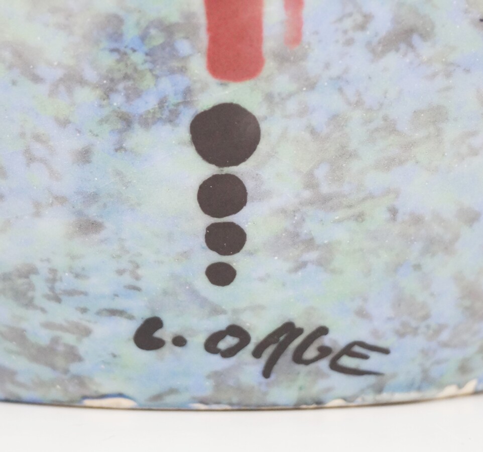 Vase globulaire en grés émaillé polychrome à décor d'algues marines rouges et noires sur fond bleu-gris, signé "C. OHGE" ?, H. 25 cm (fêle).
