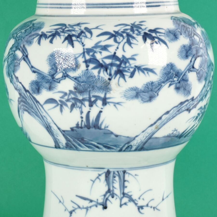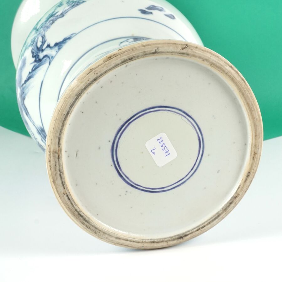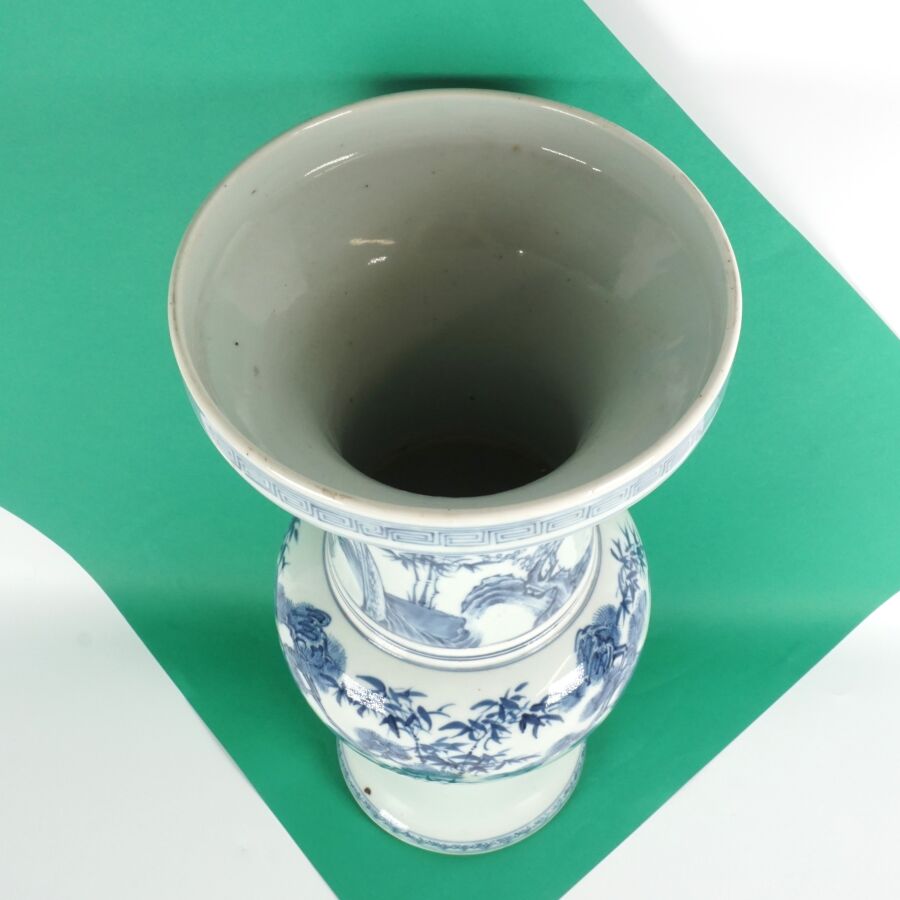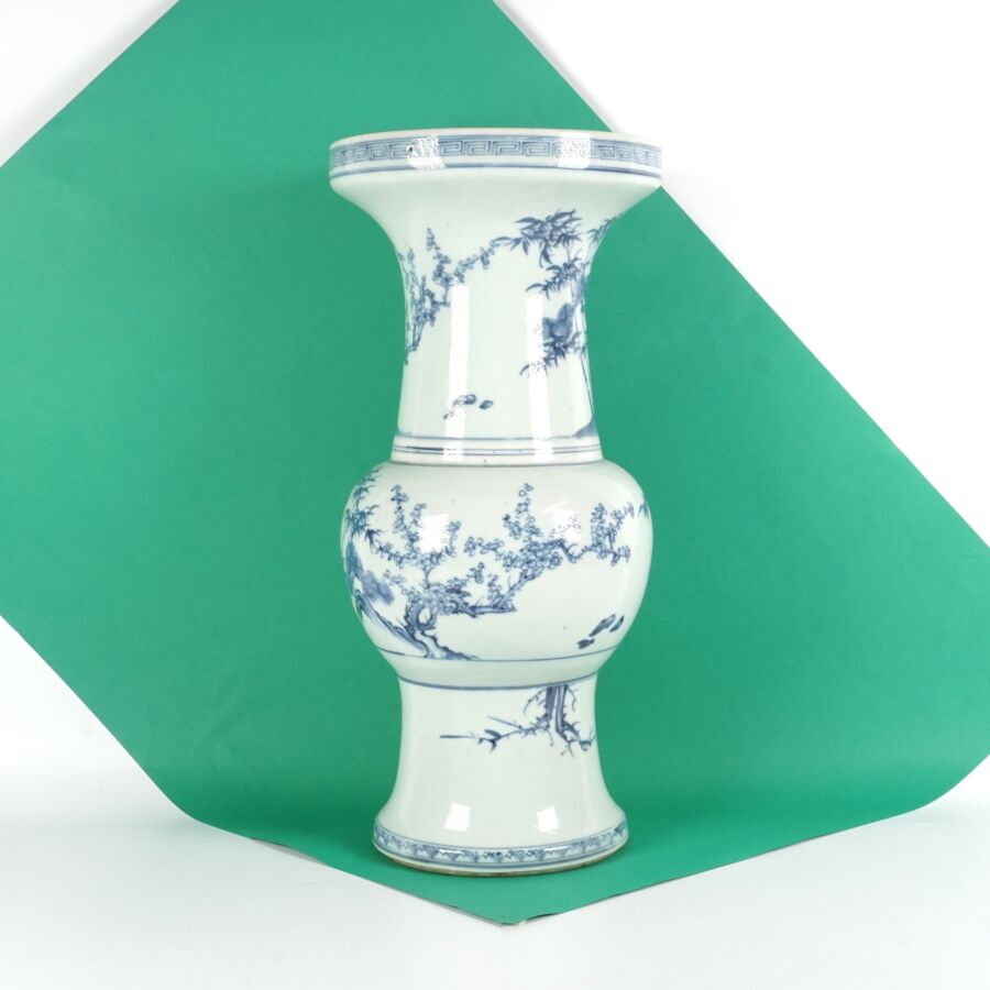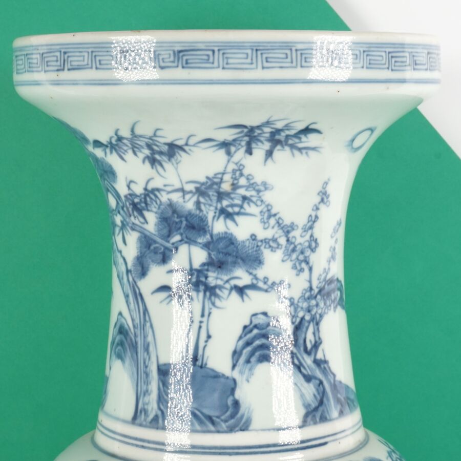 Vase gu en porcelaine émaillée blanche, à décor en bleu sous couverte des trois amis de l'hiver pins, bambous et prunus marque au double cercle, Chine, circa 1900, H. 41 cm (fond restauré).