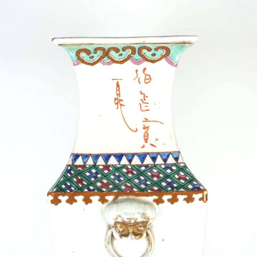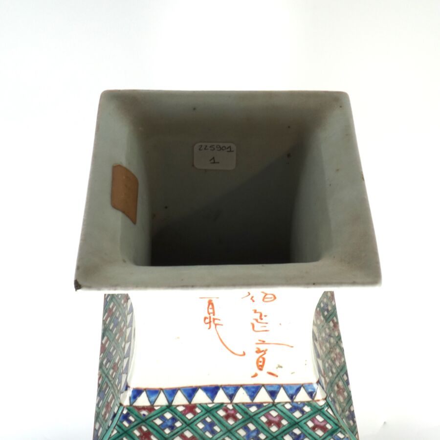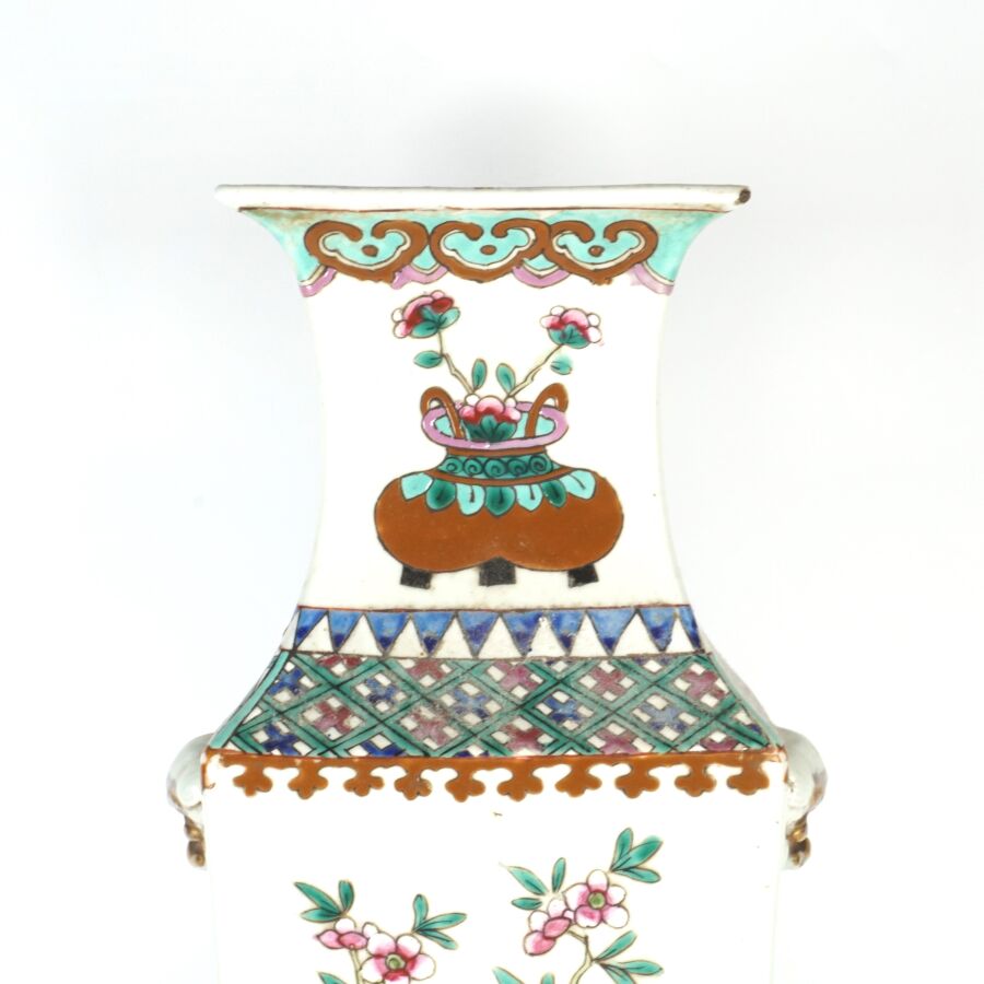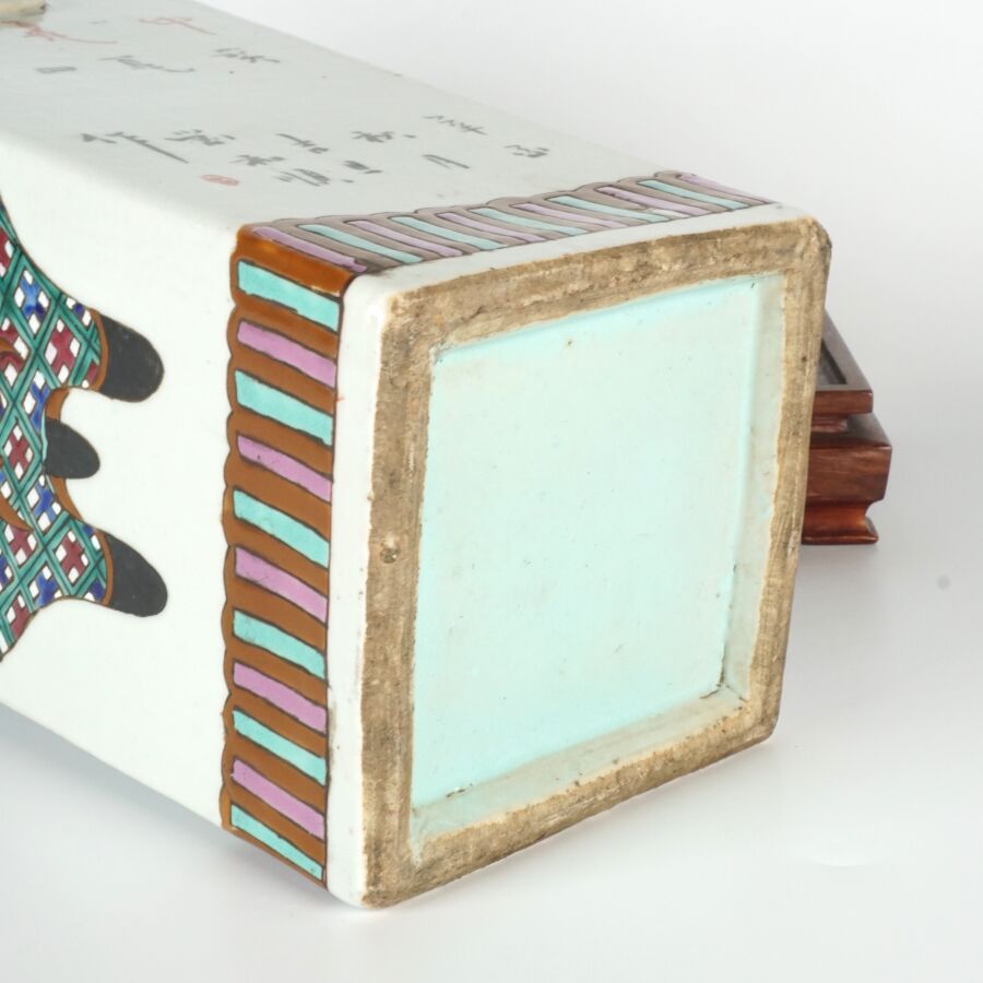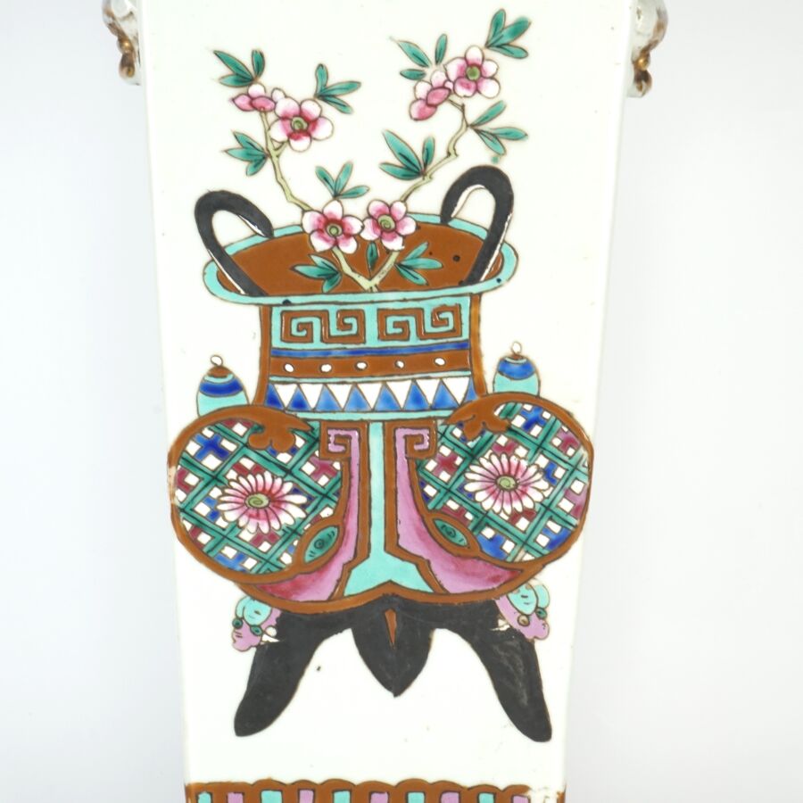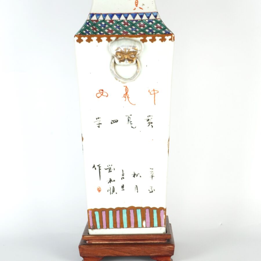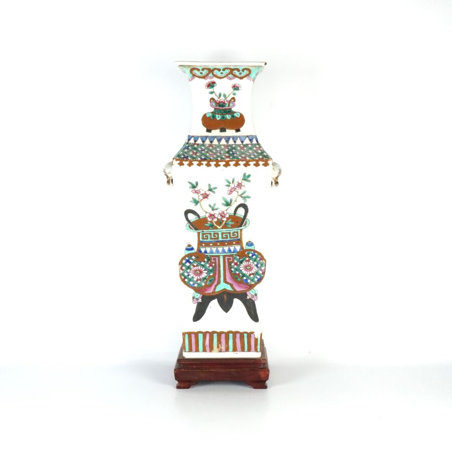 Vase quadrangulaire en porcelaine et émaux polychromes à décor d'objets mobiliers, compositions florales et calligraphies, présenté avec son socle en bois, Chine, circa 1900, H. 43 cm (petites usures à l'émail).